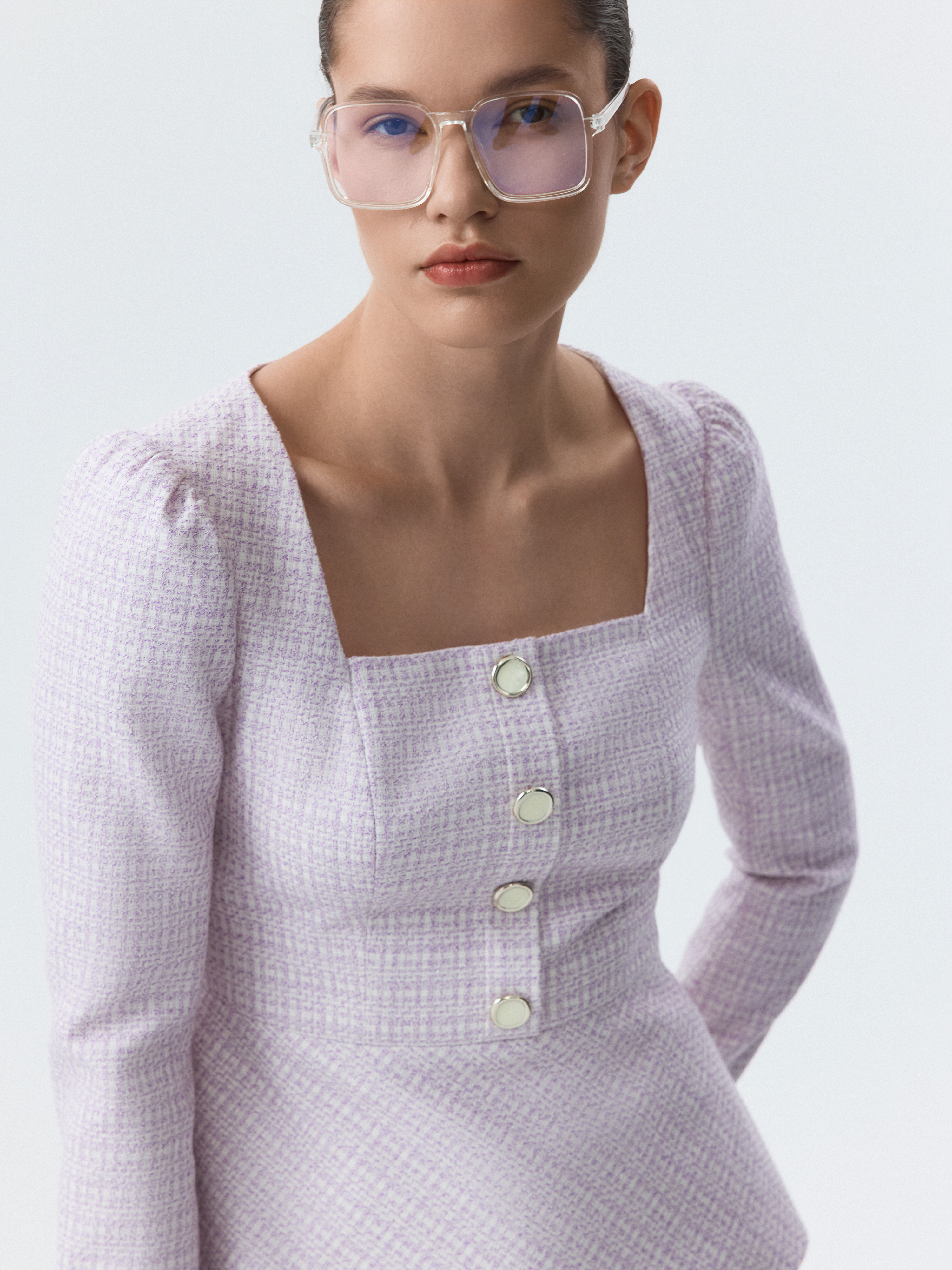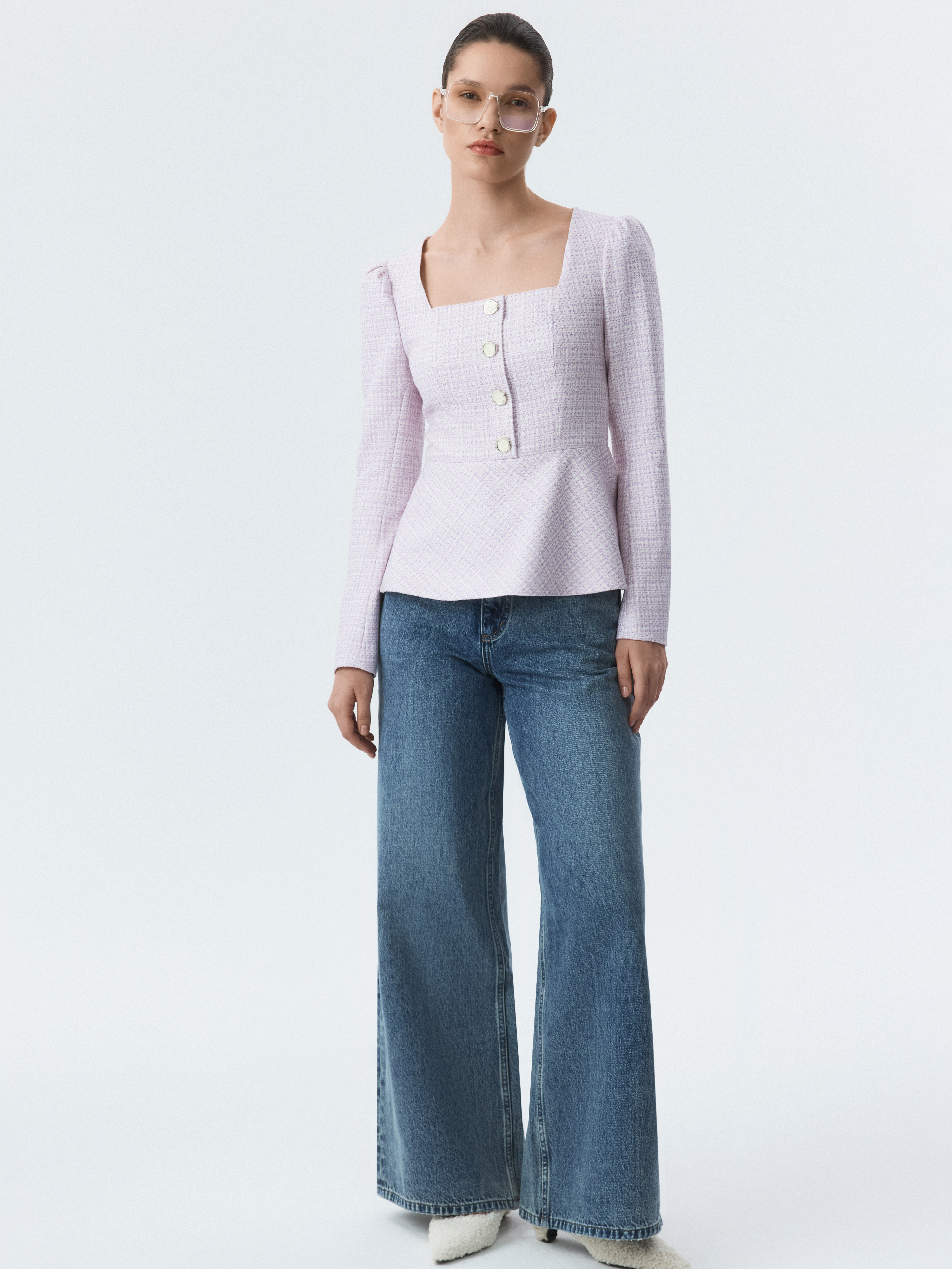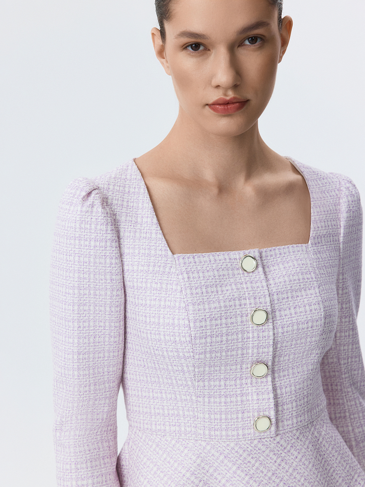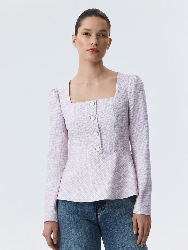 Приталенная блуза с вырезом каре привлекает внимание сочетанием элегантного кроя и выразительного материала. В меру плотный твид не тянется и не мнется, хорошо сохраняя форму, а гладкая подкладка дарит комфортное прилегание. Пуговицы с эмалью играют роль акцентов.