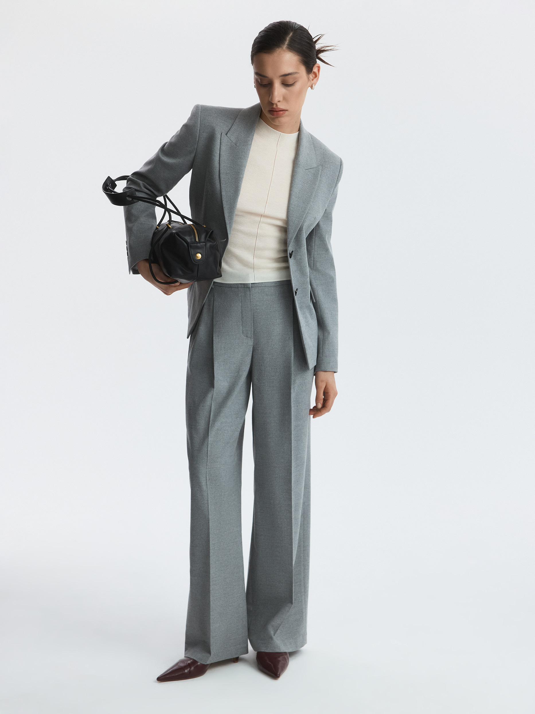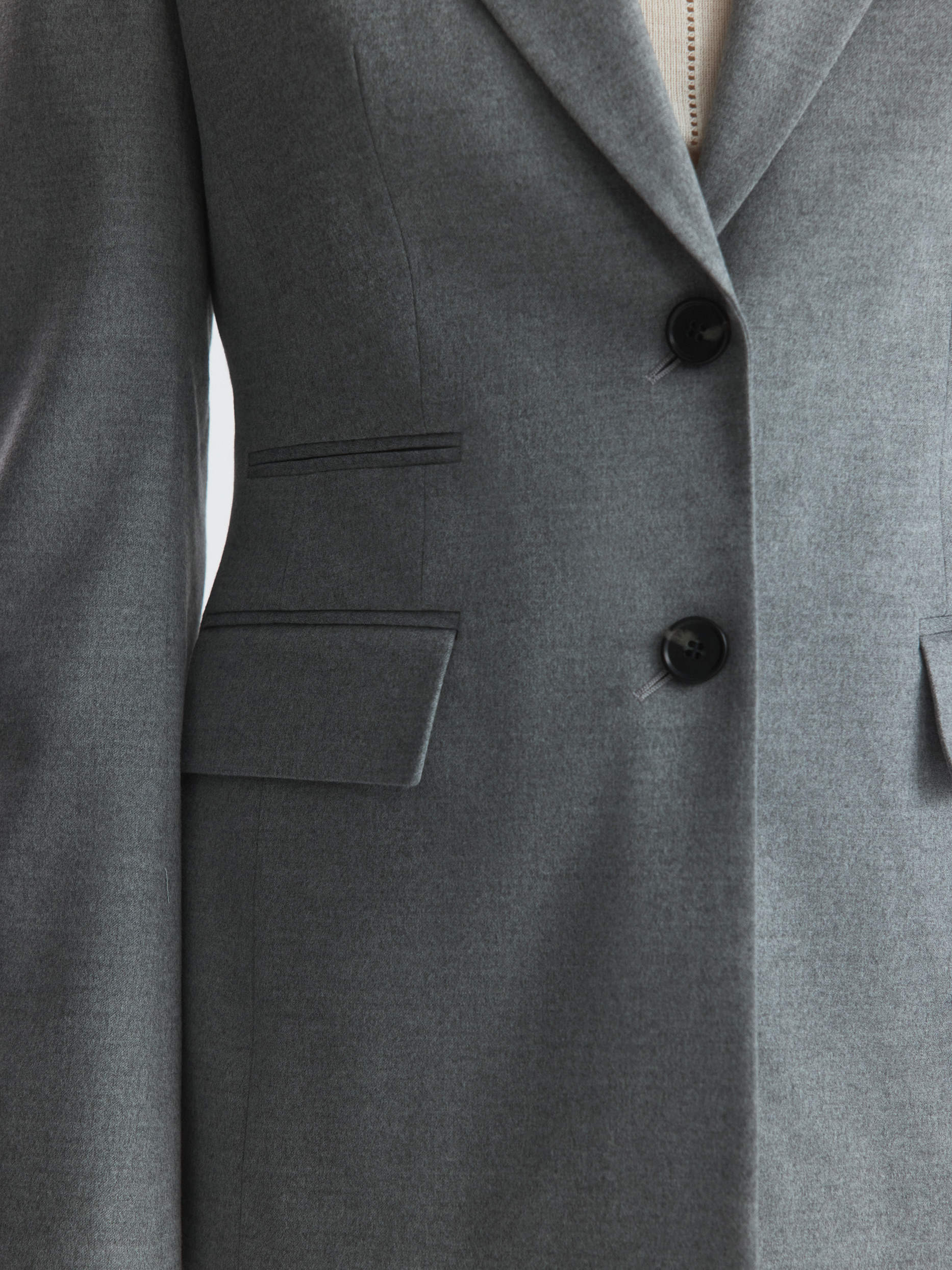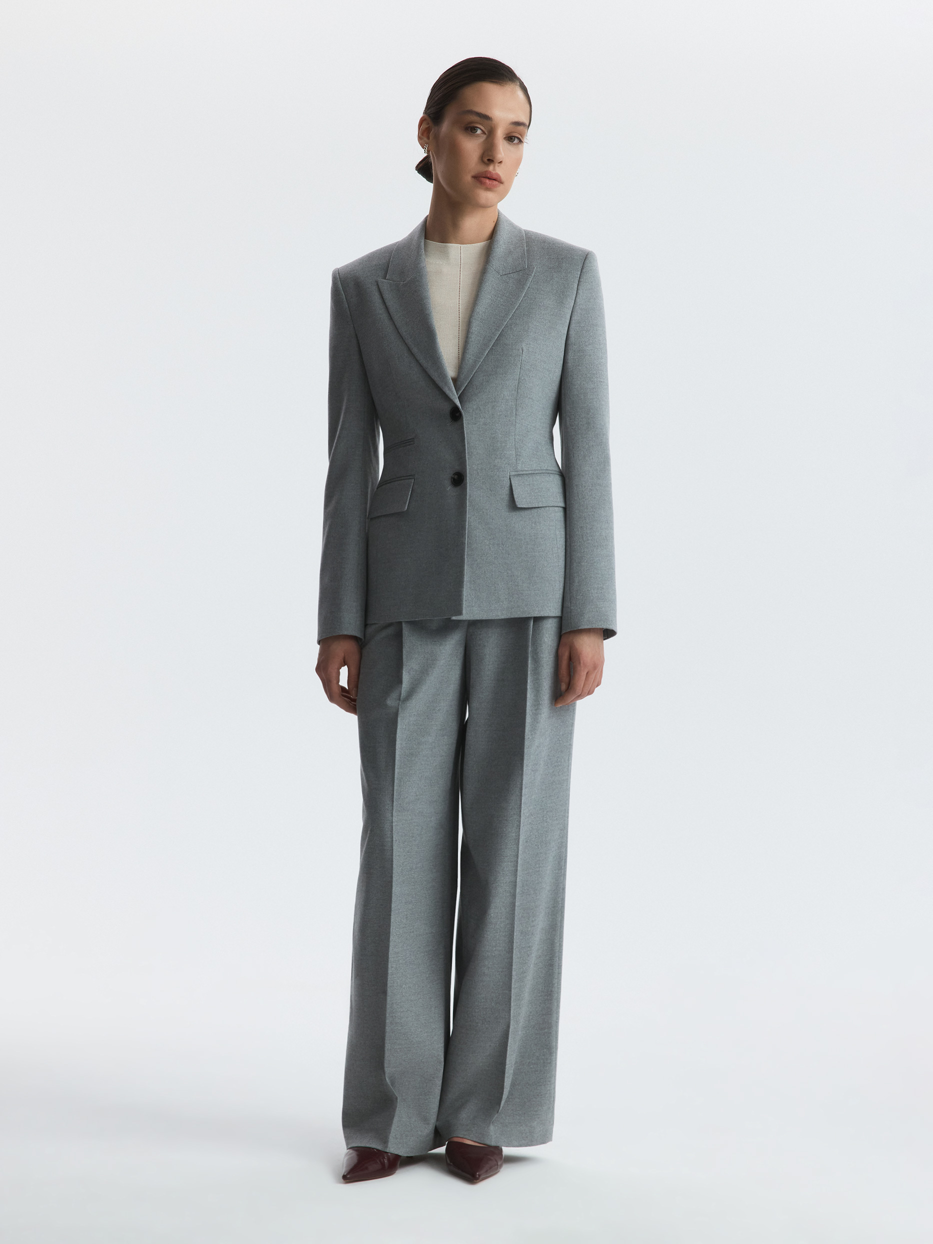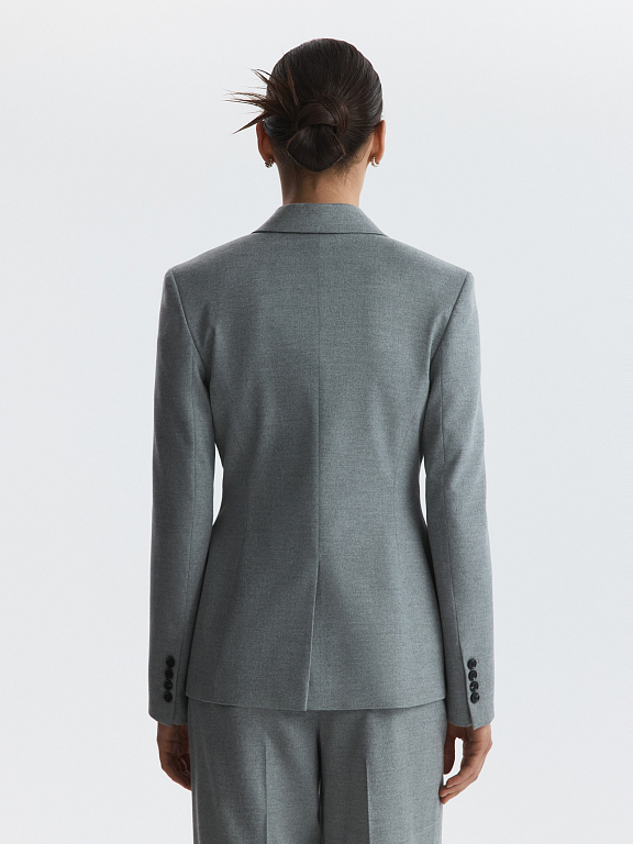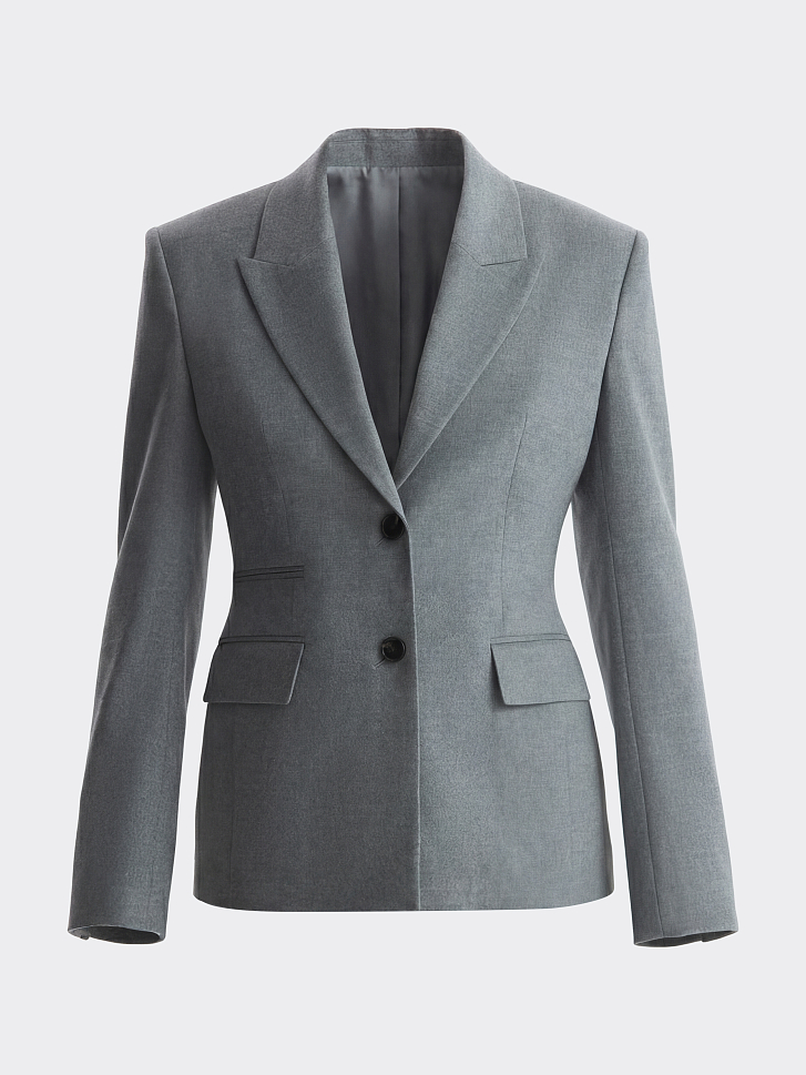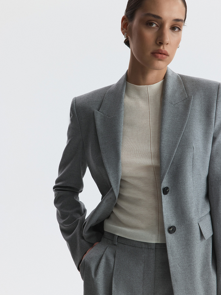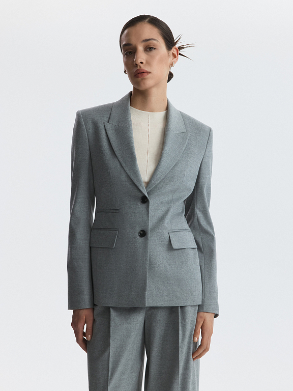 Жакет приталенного кроя с увеличенной линией плеча подойдет для строгих деловых образов или впишется в размеренность повседневных планов. Тонкая фланель мягко прилегает и не тянется, а гладкая подкладка дарит комфорт. Сочетайте с брюками из комплекта или любым другим низом.
