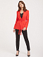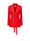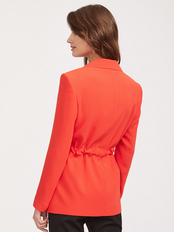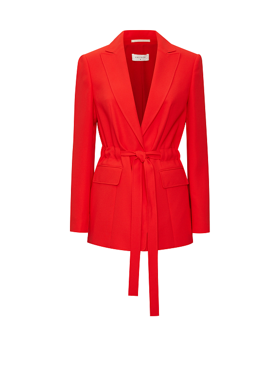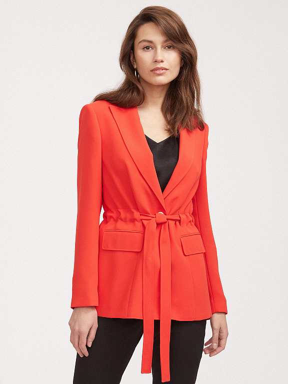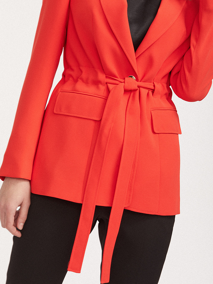 Однотонный прямой жакет с поясом на кулиске. Остроконечные лацканы, карманы с клапанами, подкладка. Застегивается на пуговицу.