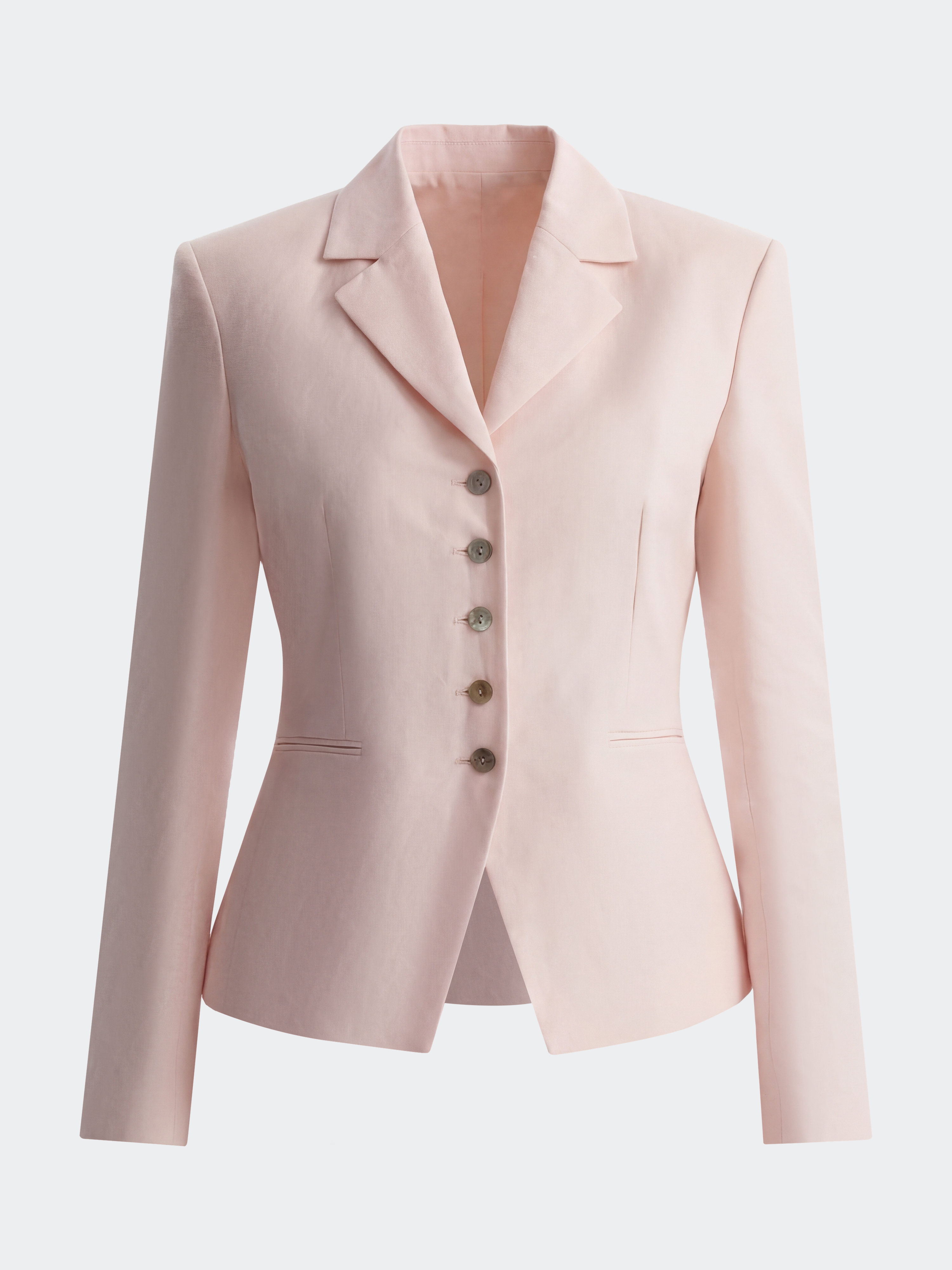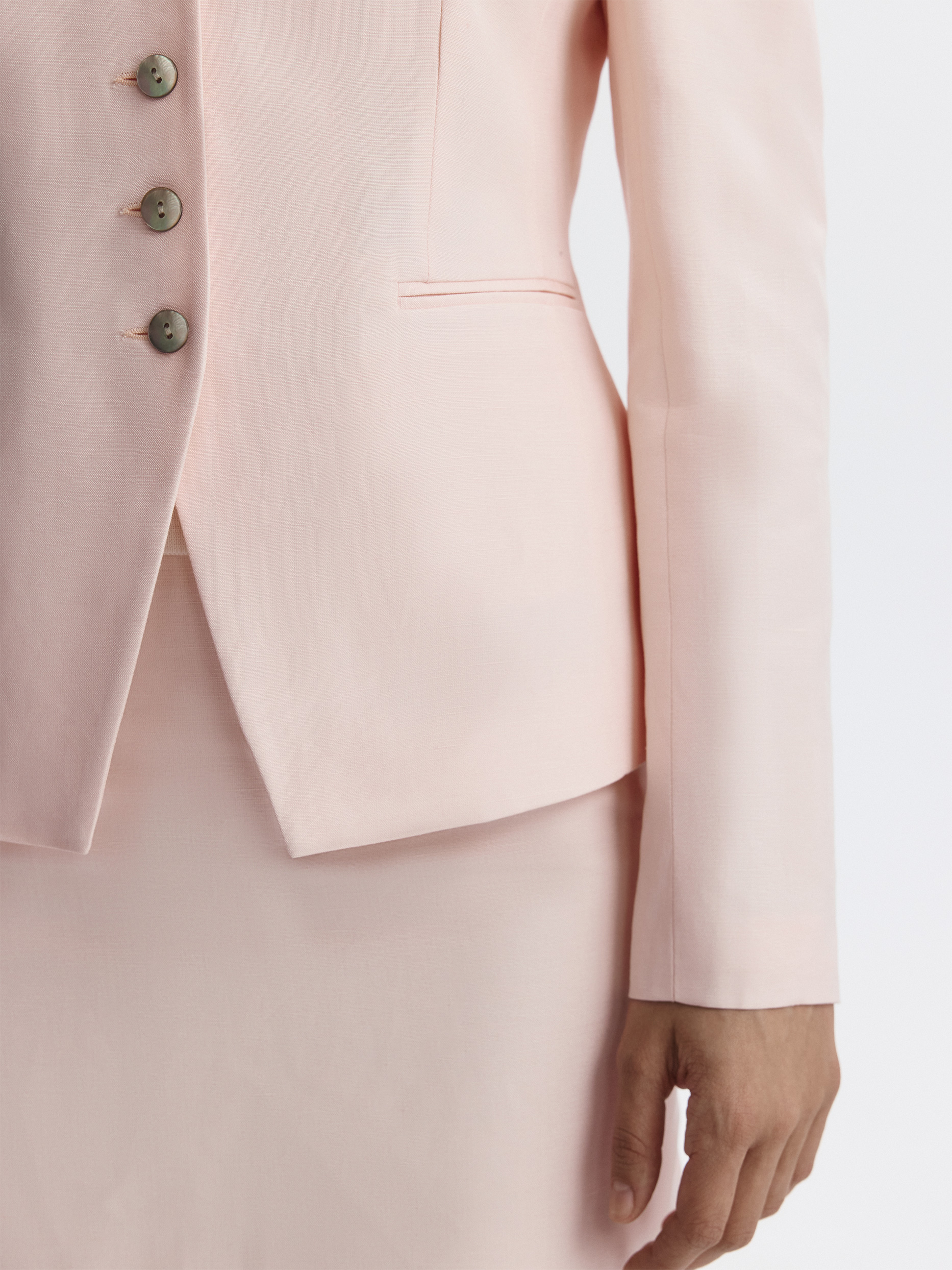 Приталенный однобортный жакет со льном станет идеальным решением для теплого сезона. В меру плотный текстиль хорошо пропускает воздух и сохраняет комфорт в жаркий день.