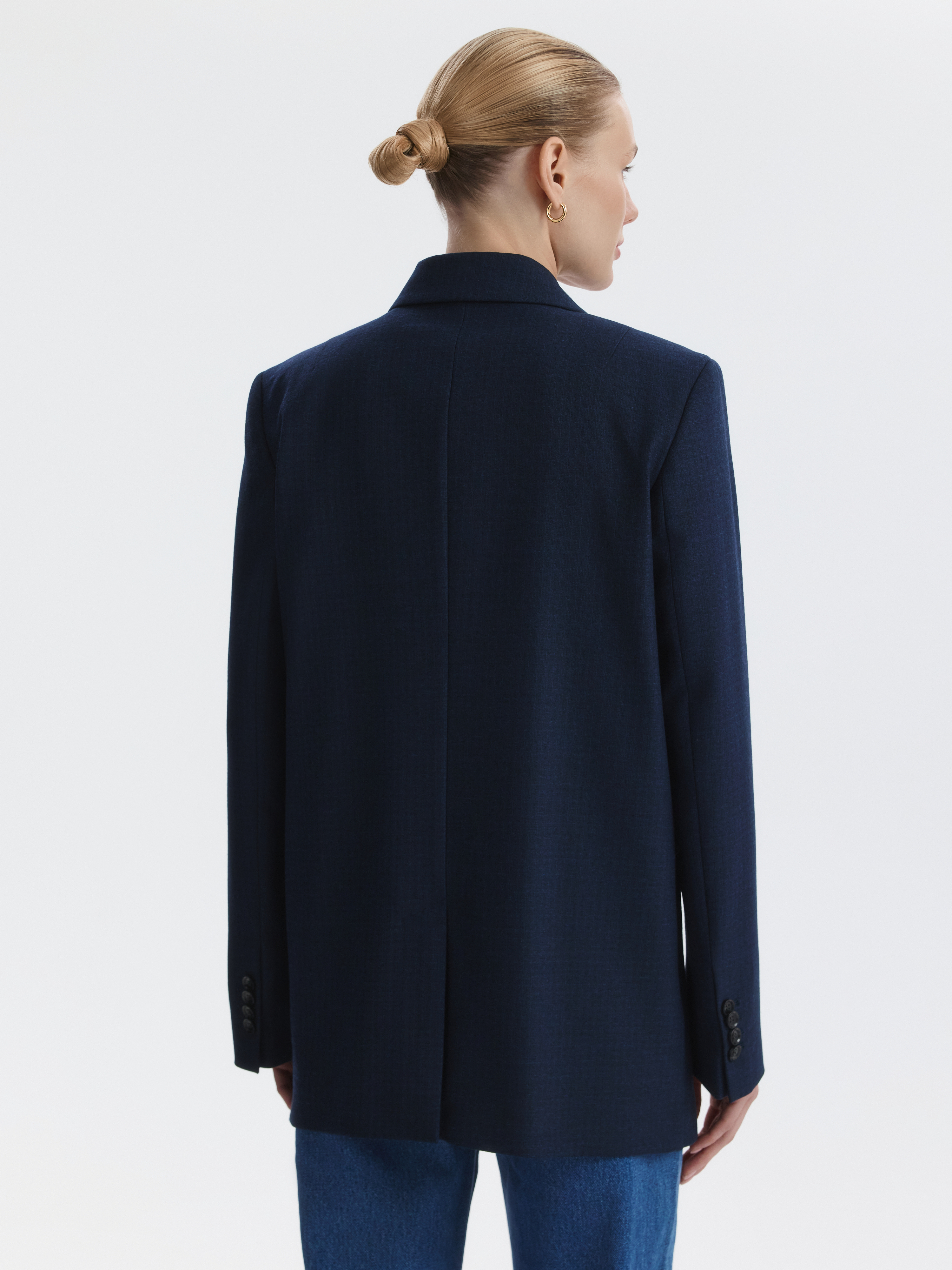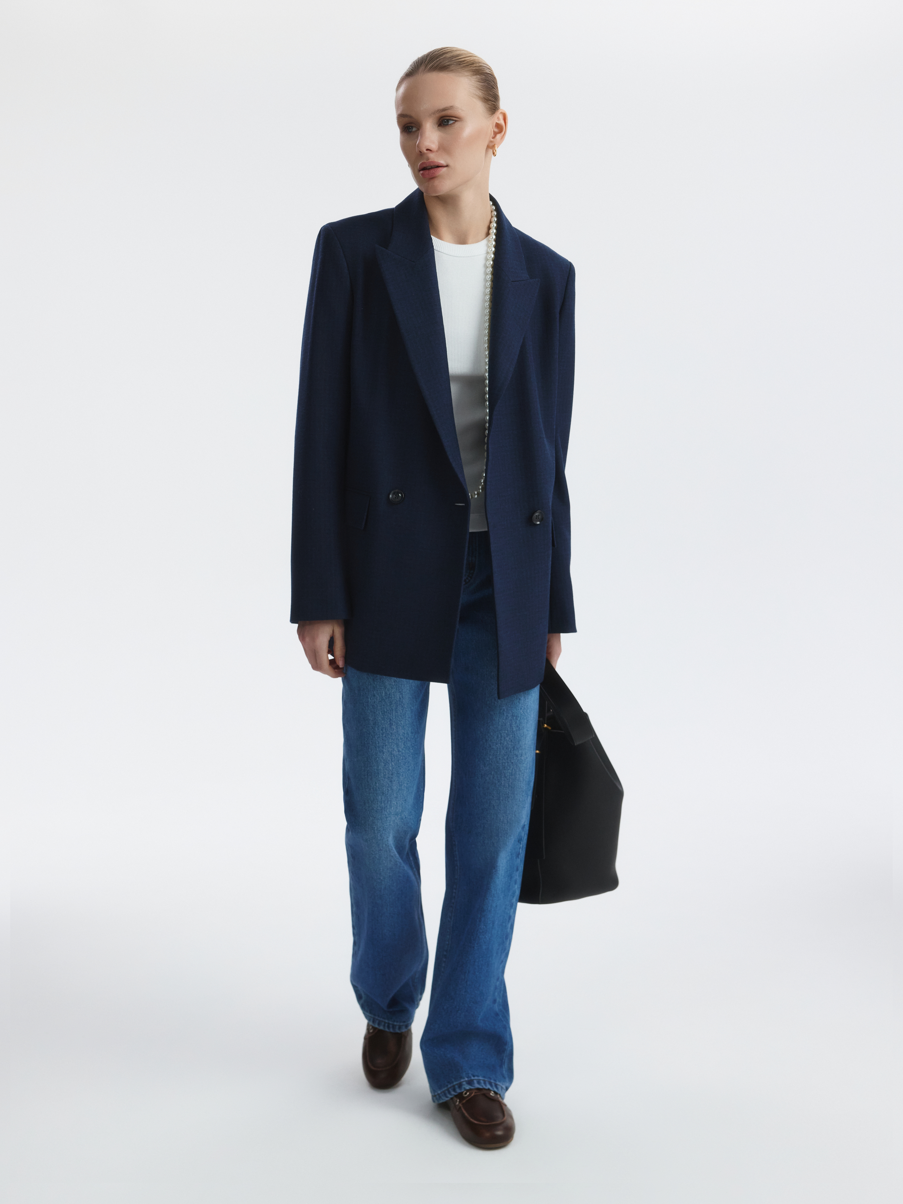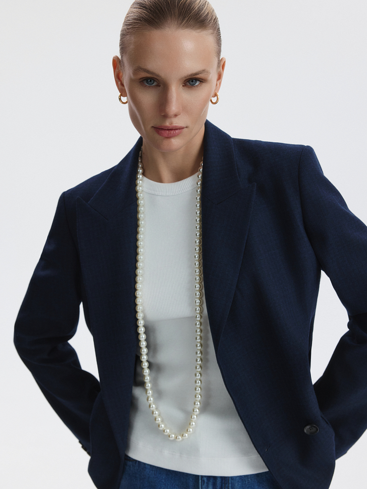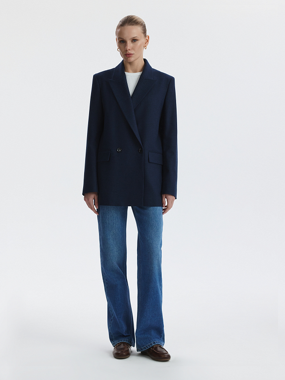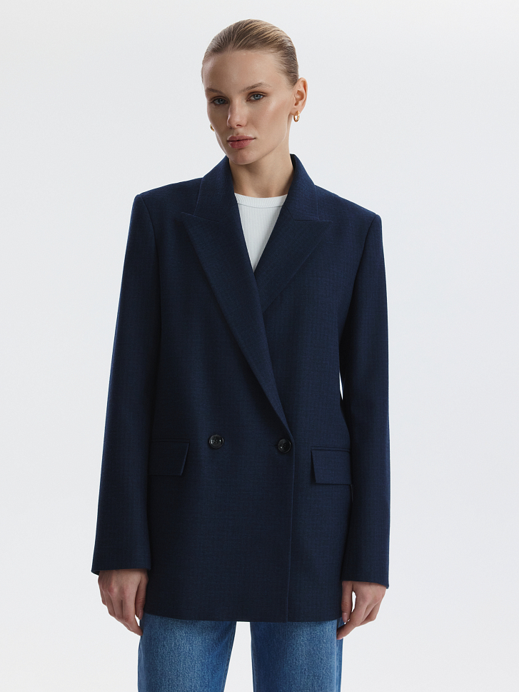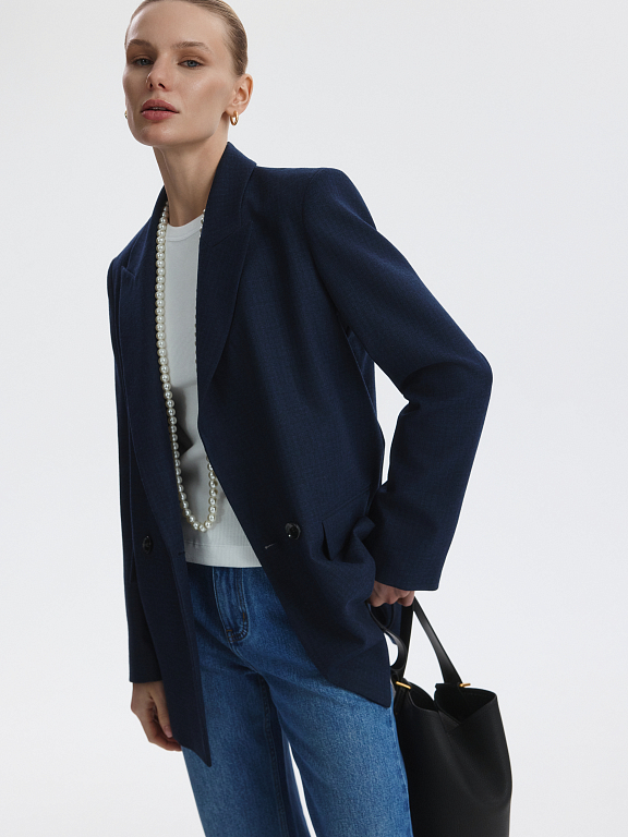 Двубортный жакет расслабленного кроя станет основой для множества образов. Плотный текстиль из поливискозы в едва заметную клетку не тянется, а спинка с частичной подкладкой облегчает силуэт.