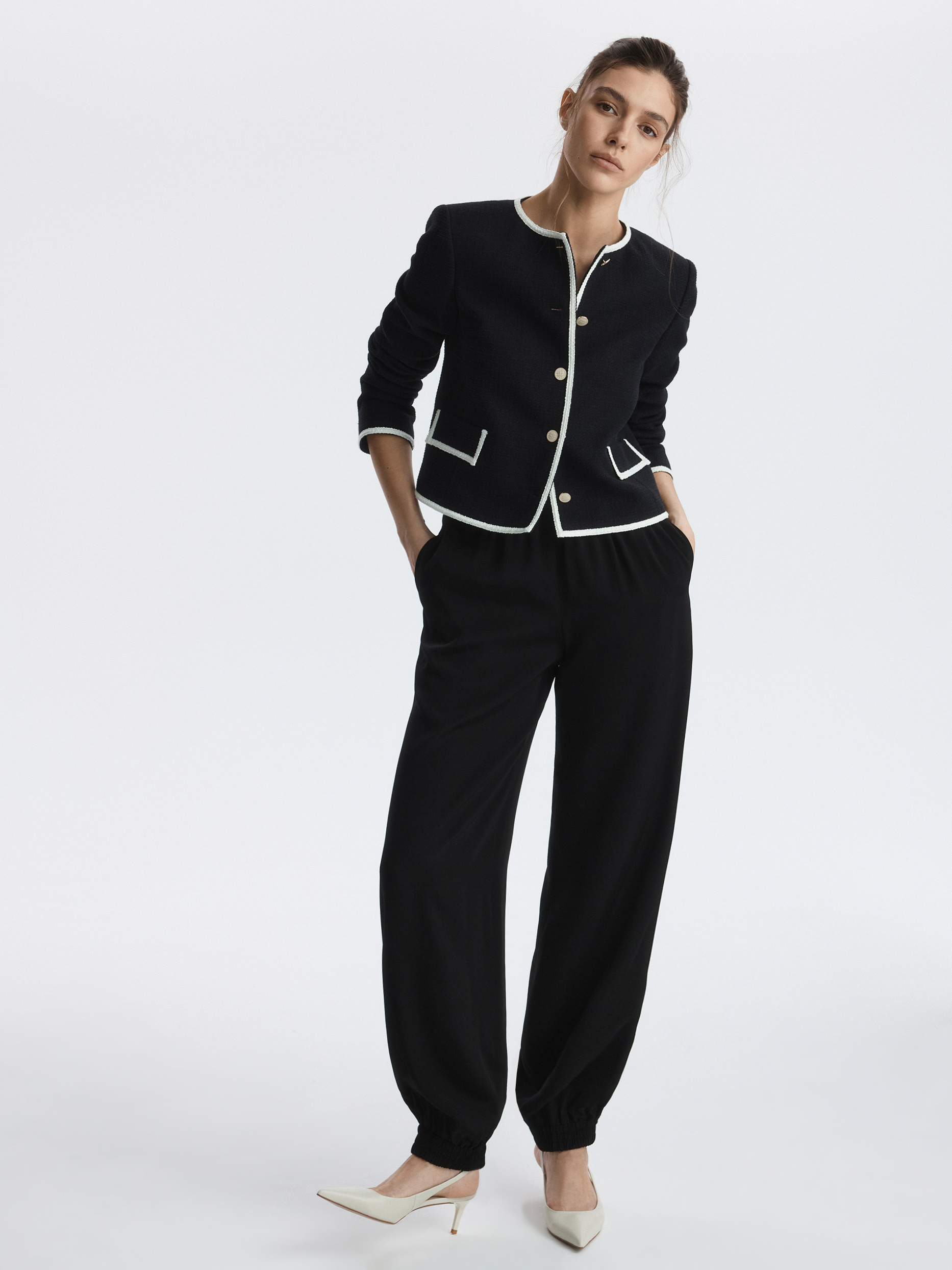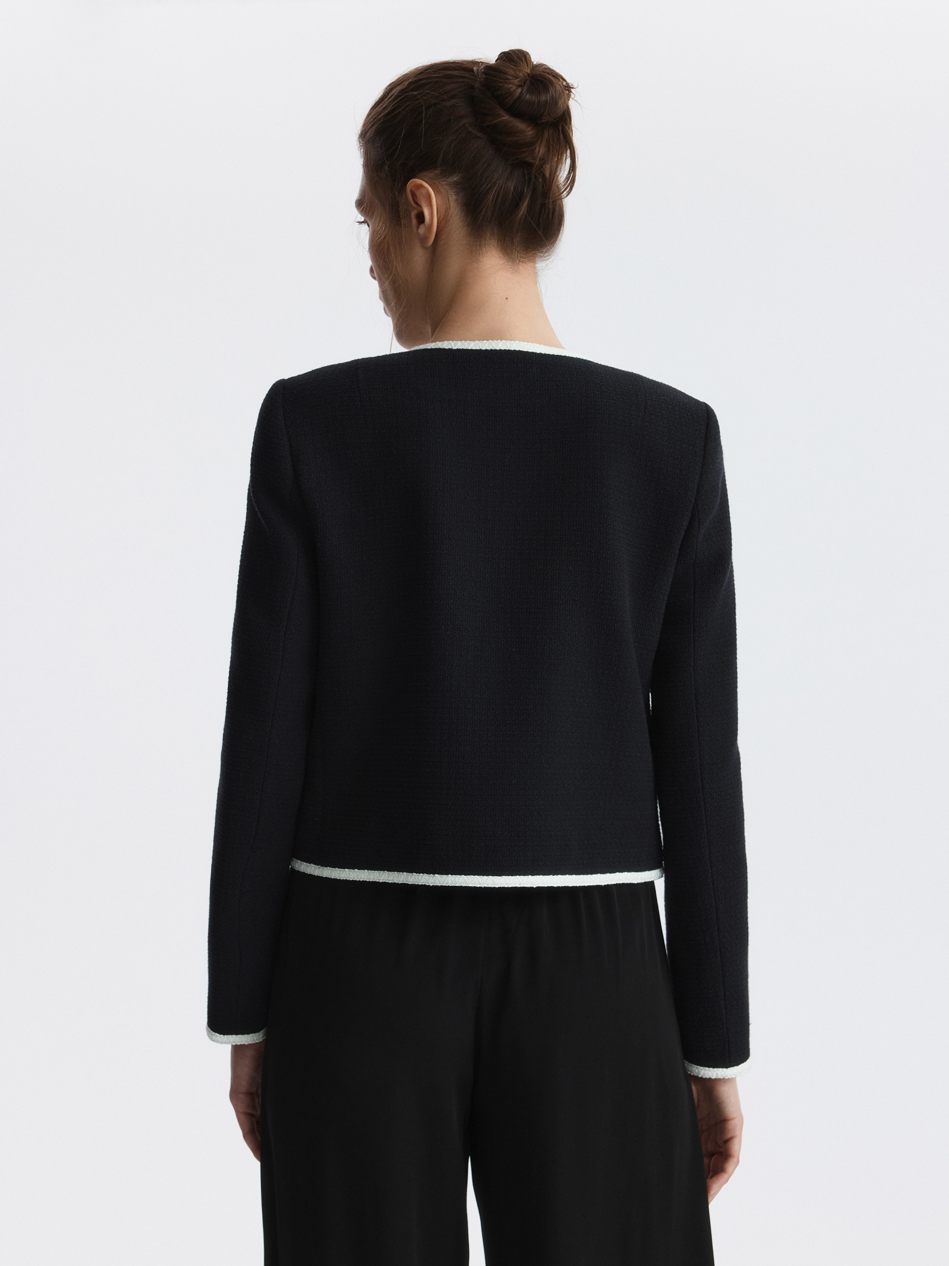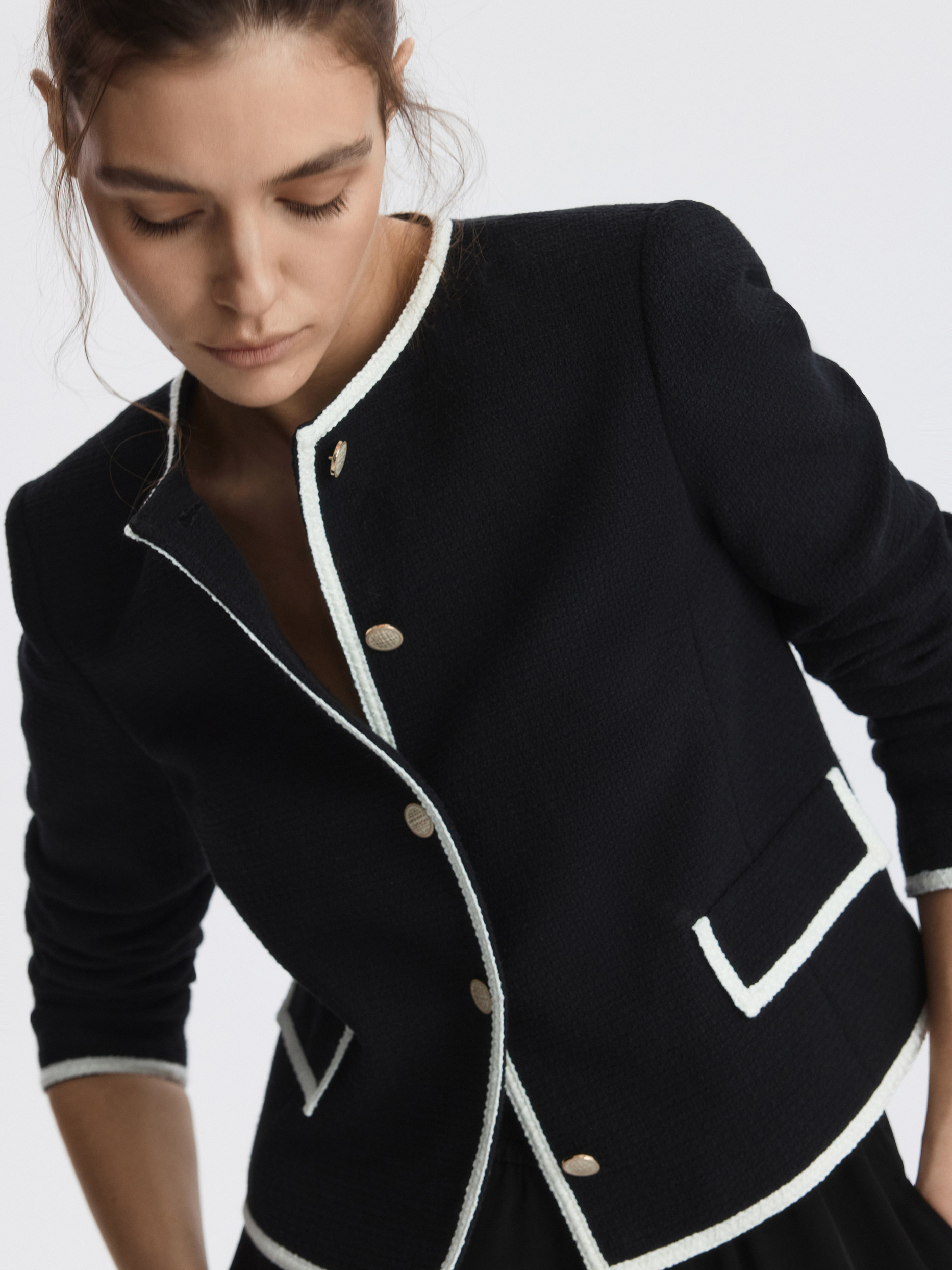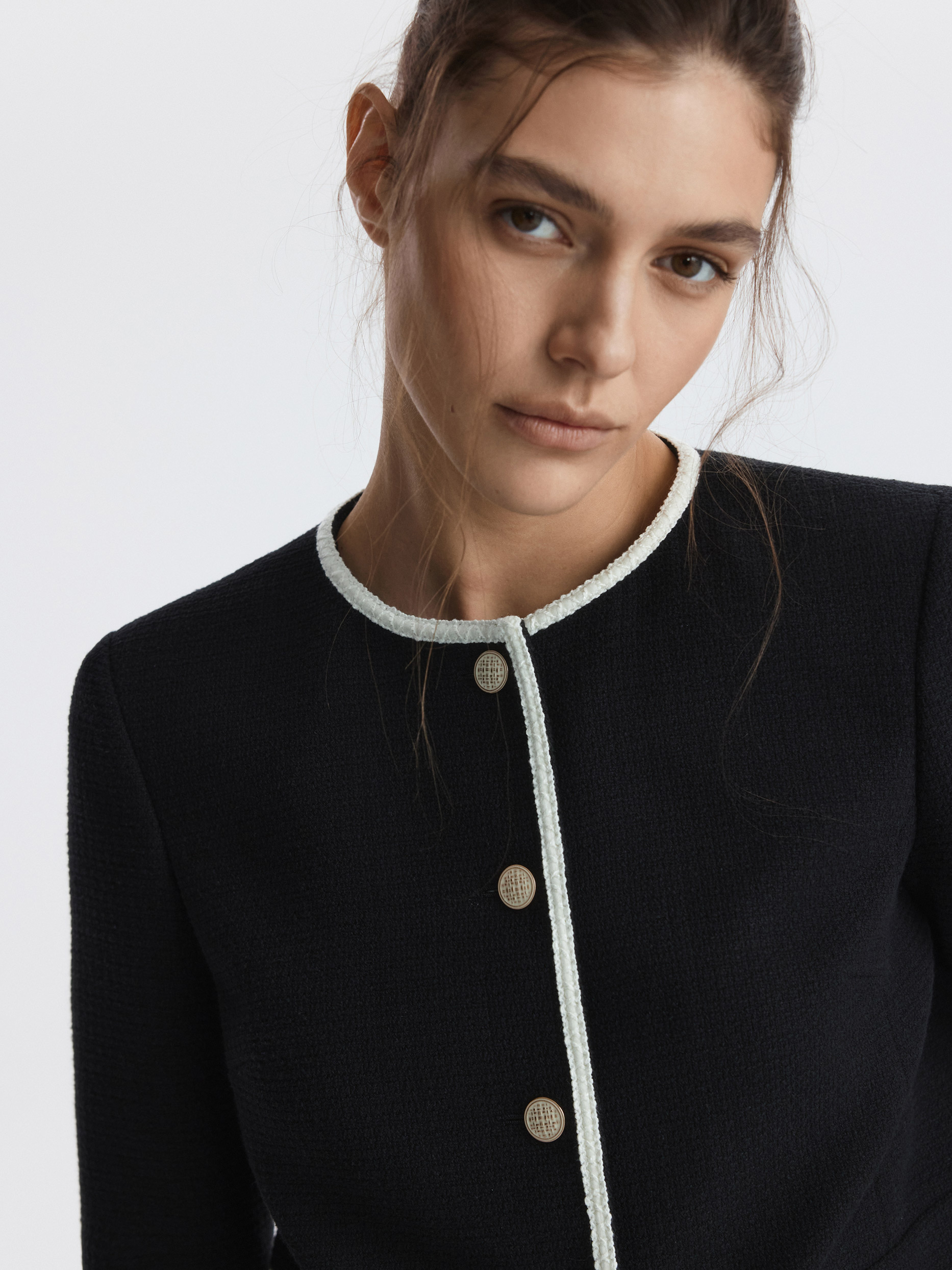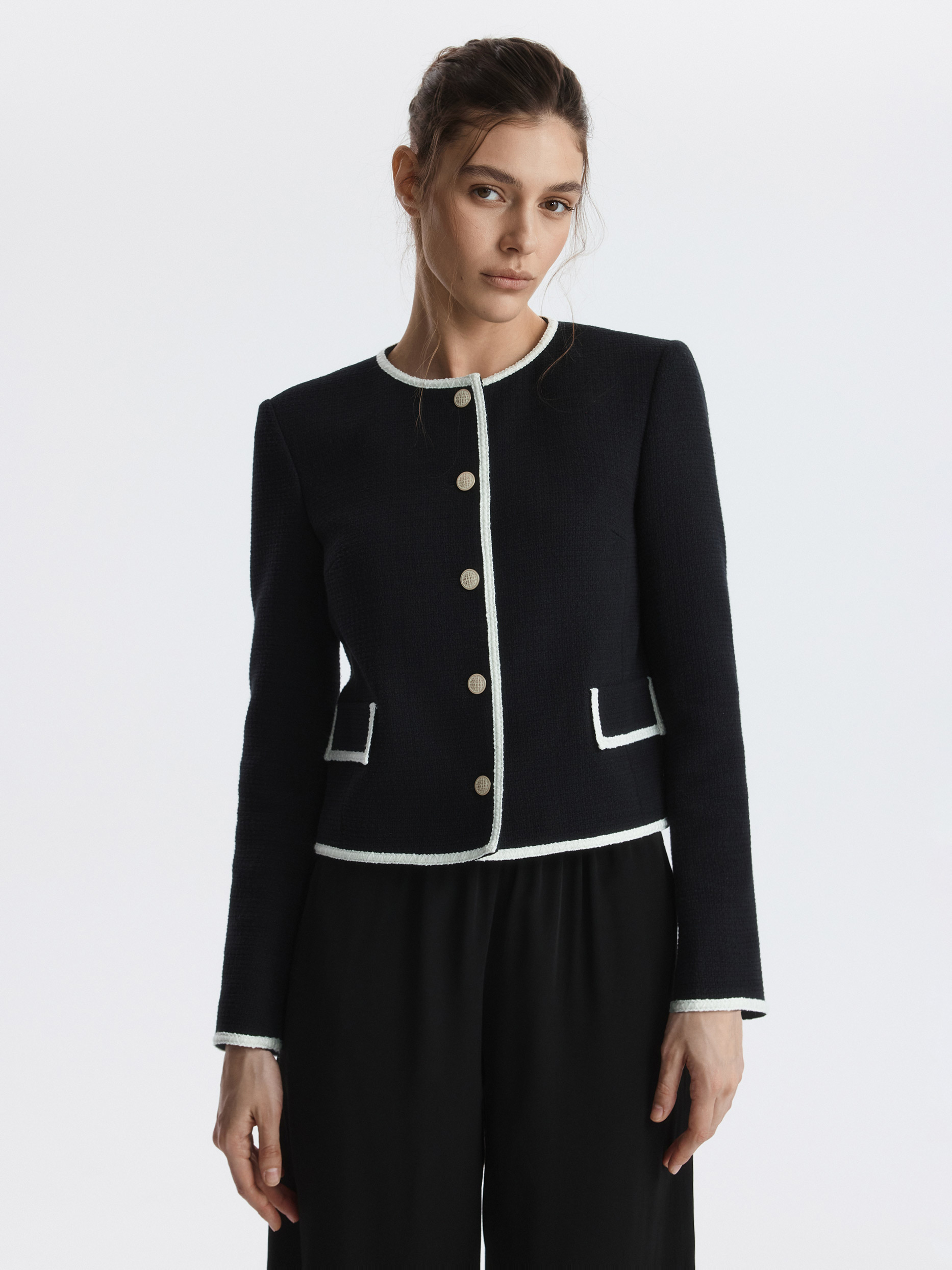Твидовый жакет станет элегантным дополнением делового гардероба или сделает повседневные образы разнообразнее. Плотный текстиль на основе хлопка не тянется и комфортно прилегает благодаря гладкой подкладке. Золотистые пуговицы и окантовка тесьмой по краю выступают в роли декора.
