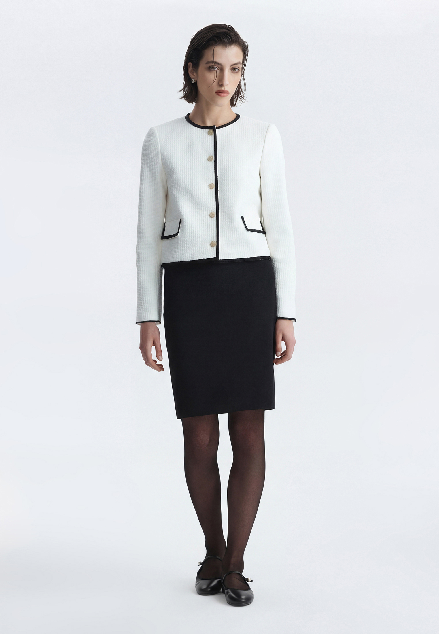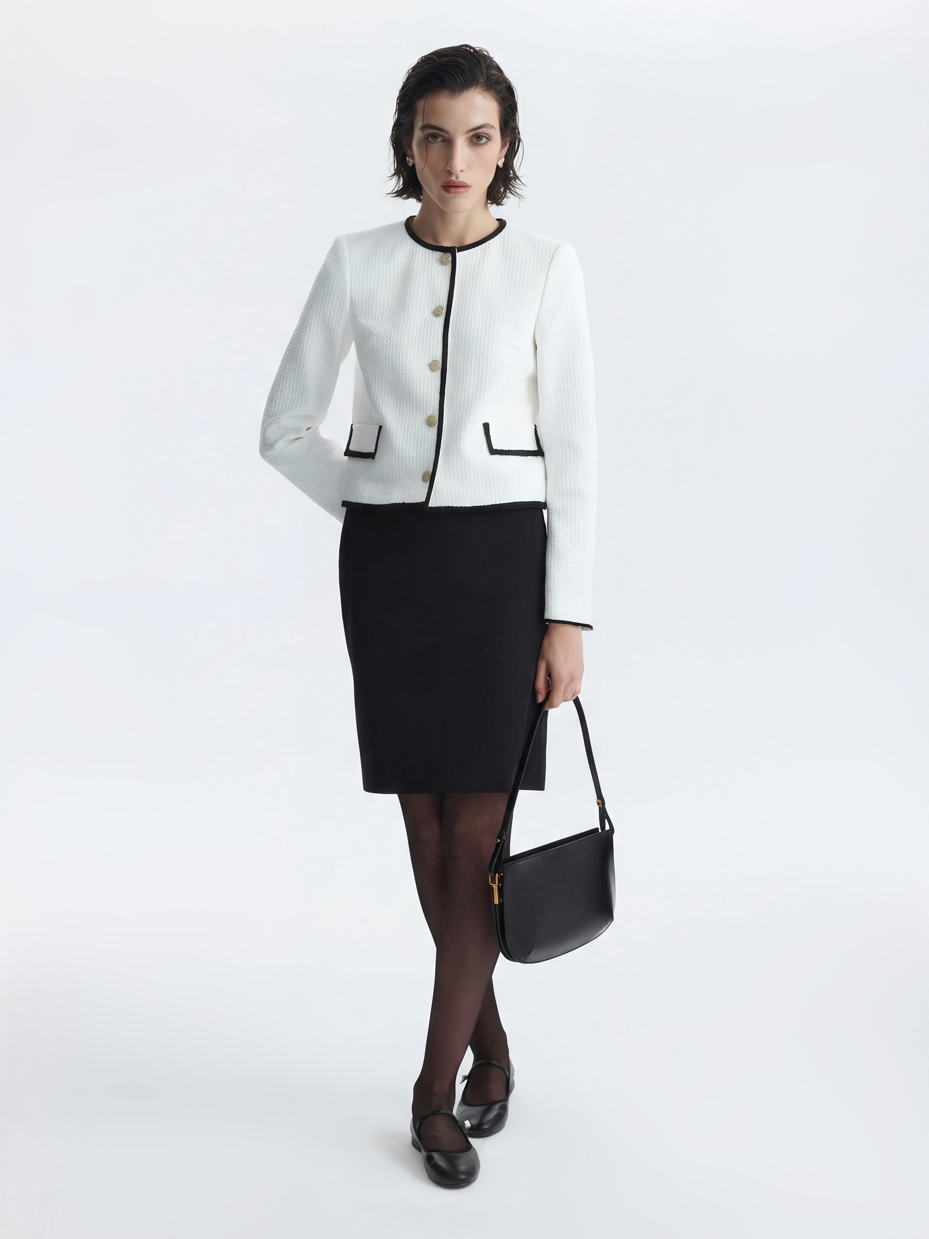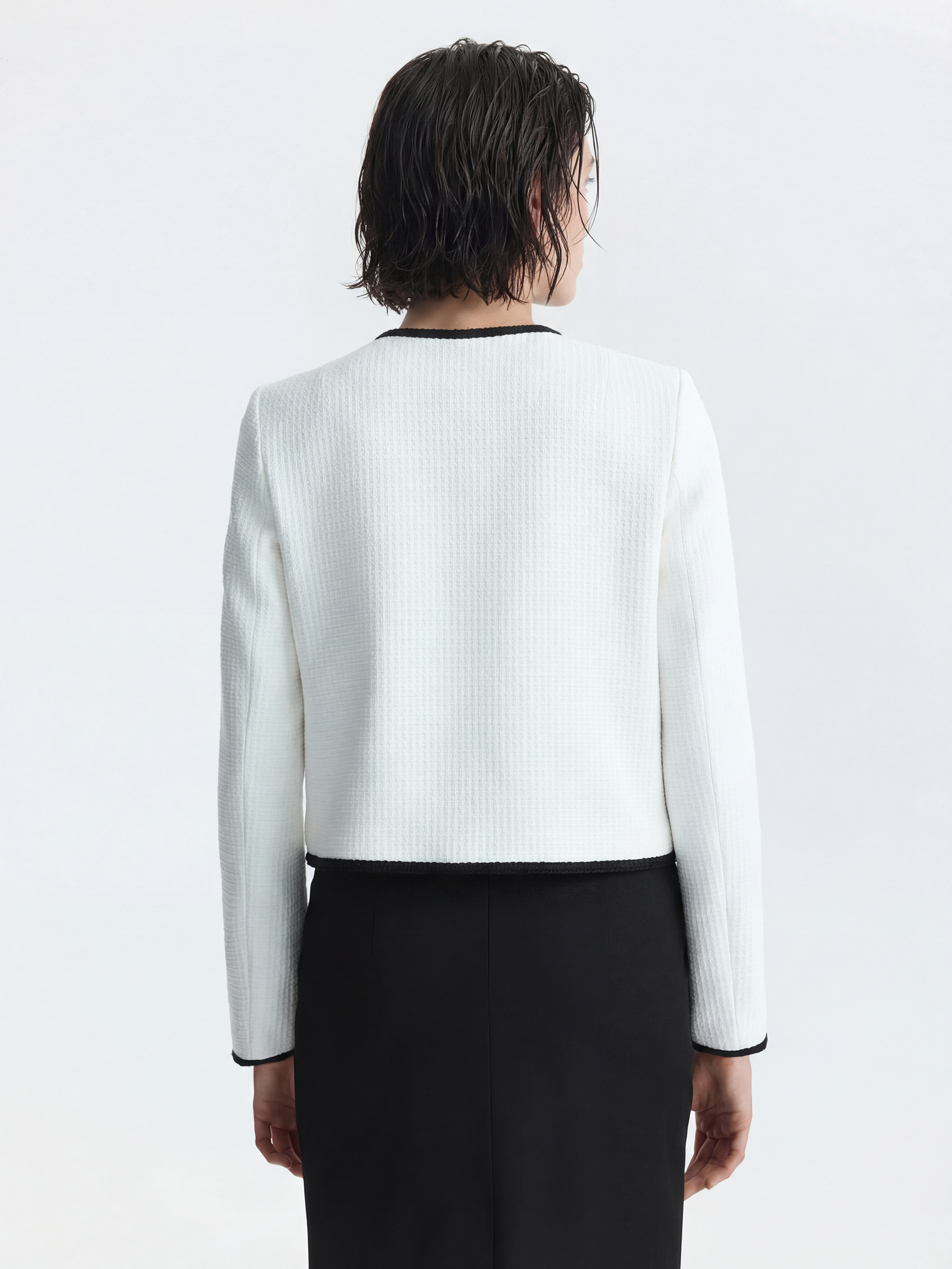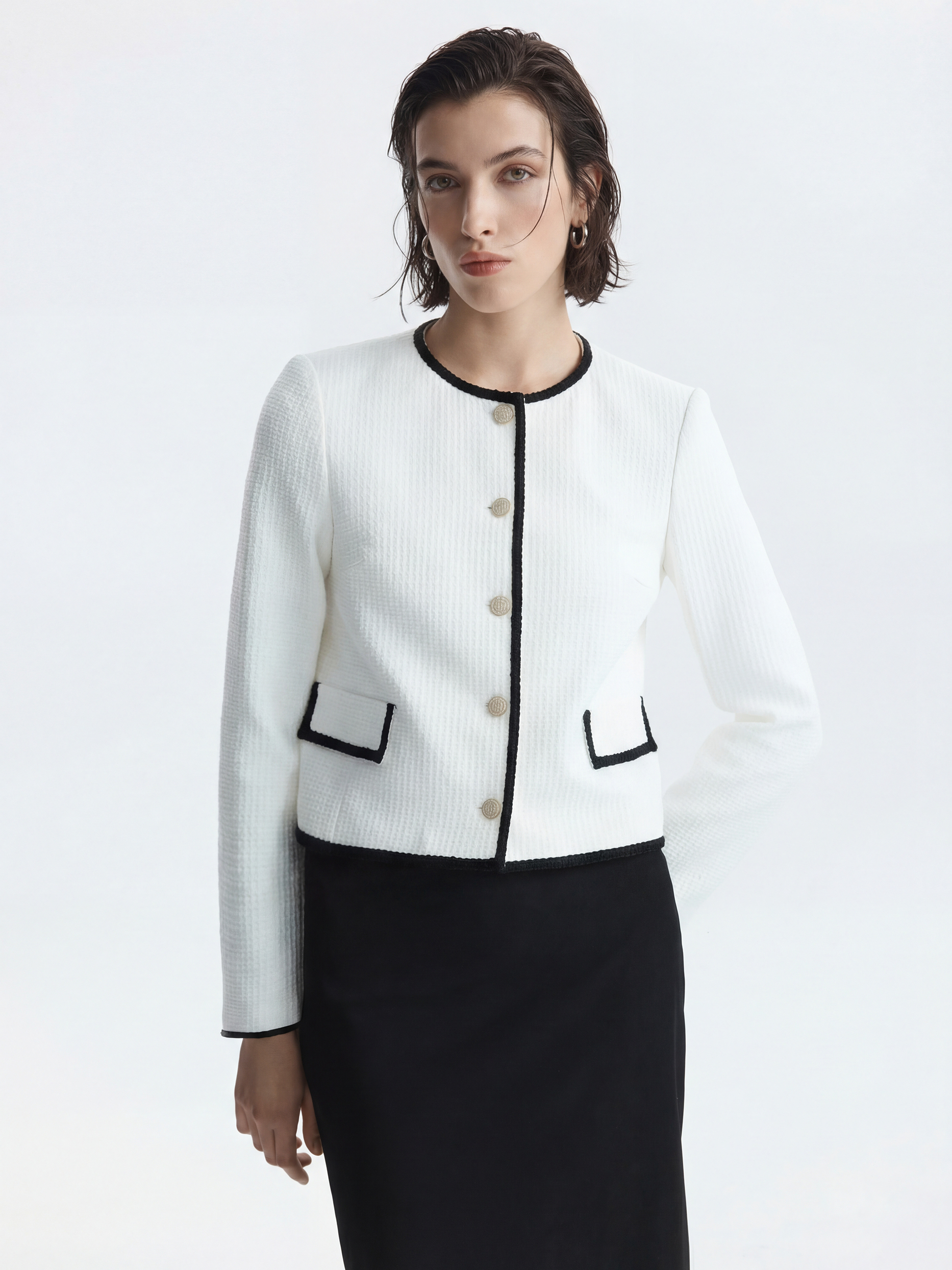 Твидовый жакет станет элегантным дополнением делового гардероба или сделает повседневные образы разнообразнее. Плотный текстиль на основе хлопка не тянется и комфортно прилегает благодаря гладкой подкладке. Золотистые пуговицы и окантовка тесьмой по краю выступают в роли декора.