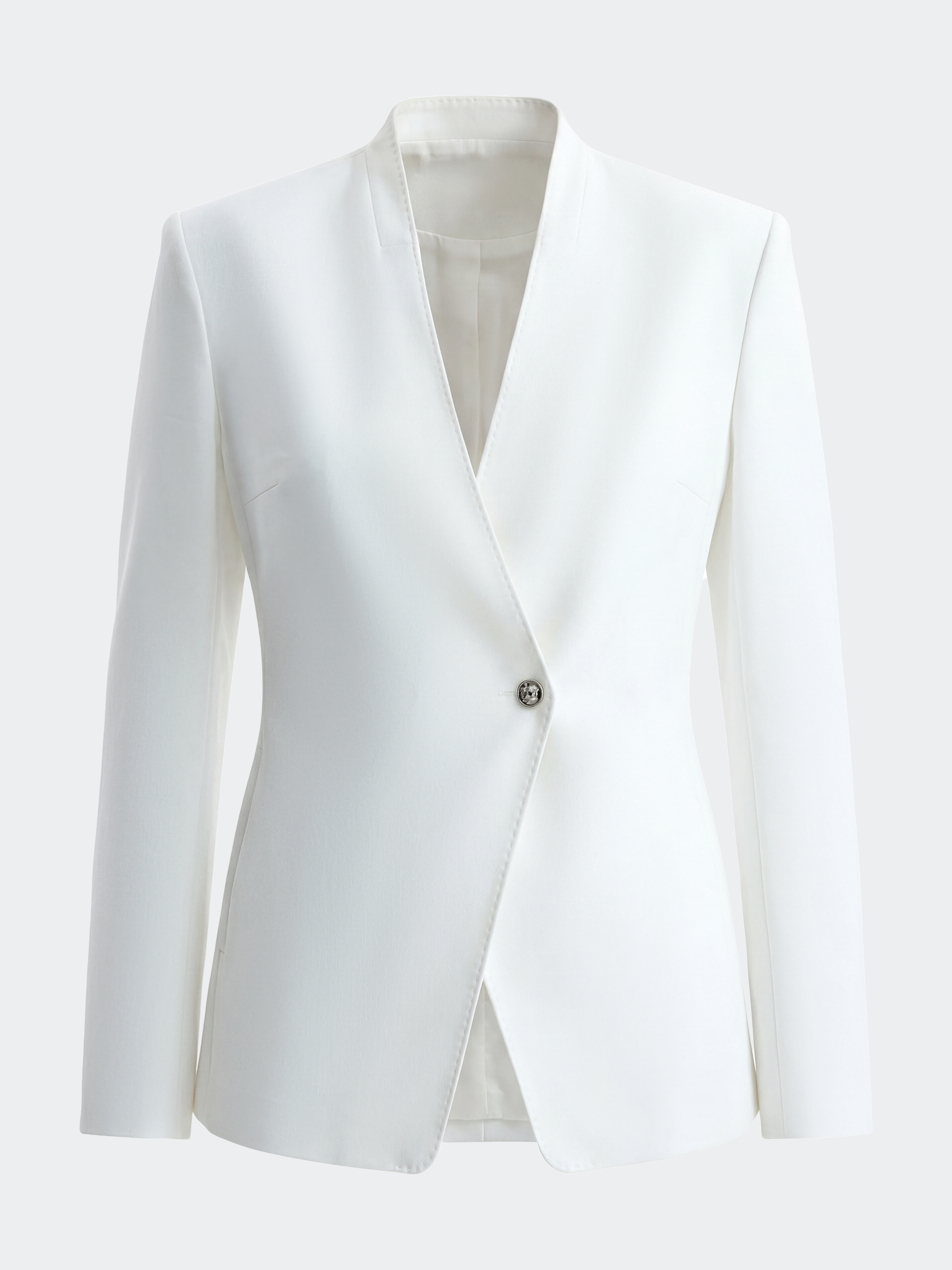 Светлый приталенный жакет подойдет для вечерних выходов, оставаясь уместным и в деловом гардеробе. В меру плотный текстиль на основе хлопка не тянется, а тонкая подкладка из вискозы дарит комфортную посадку. Ассиметричный борты и воротник-стойка подчеркивают точность линий.