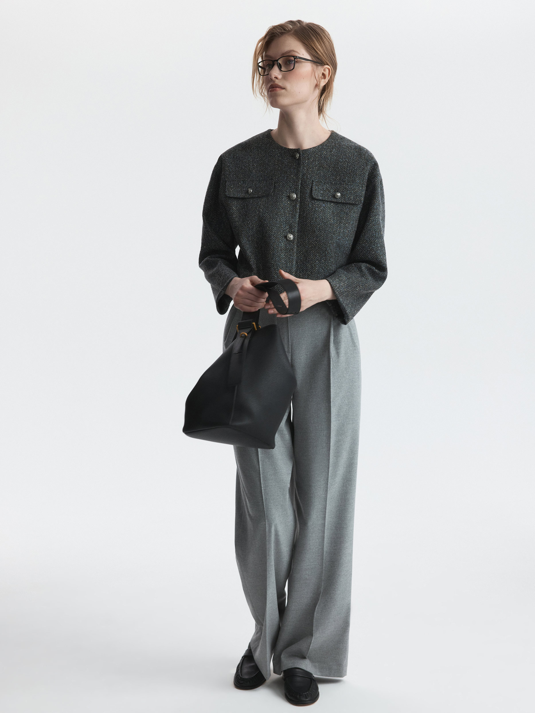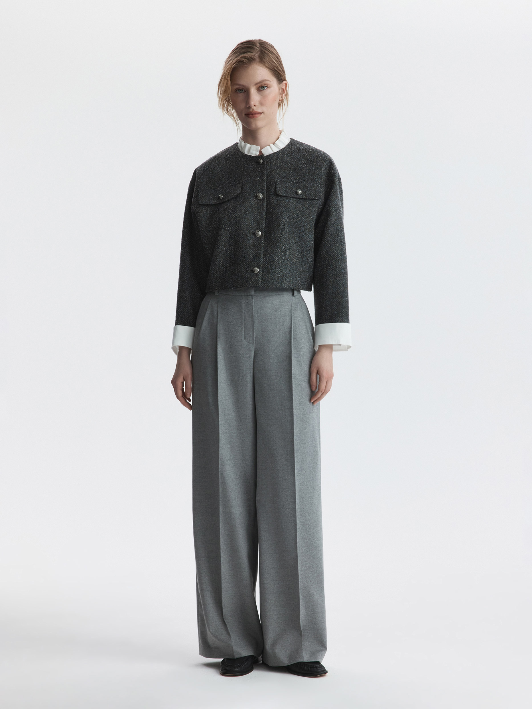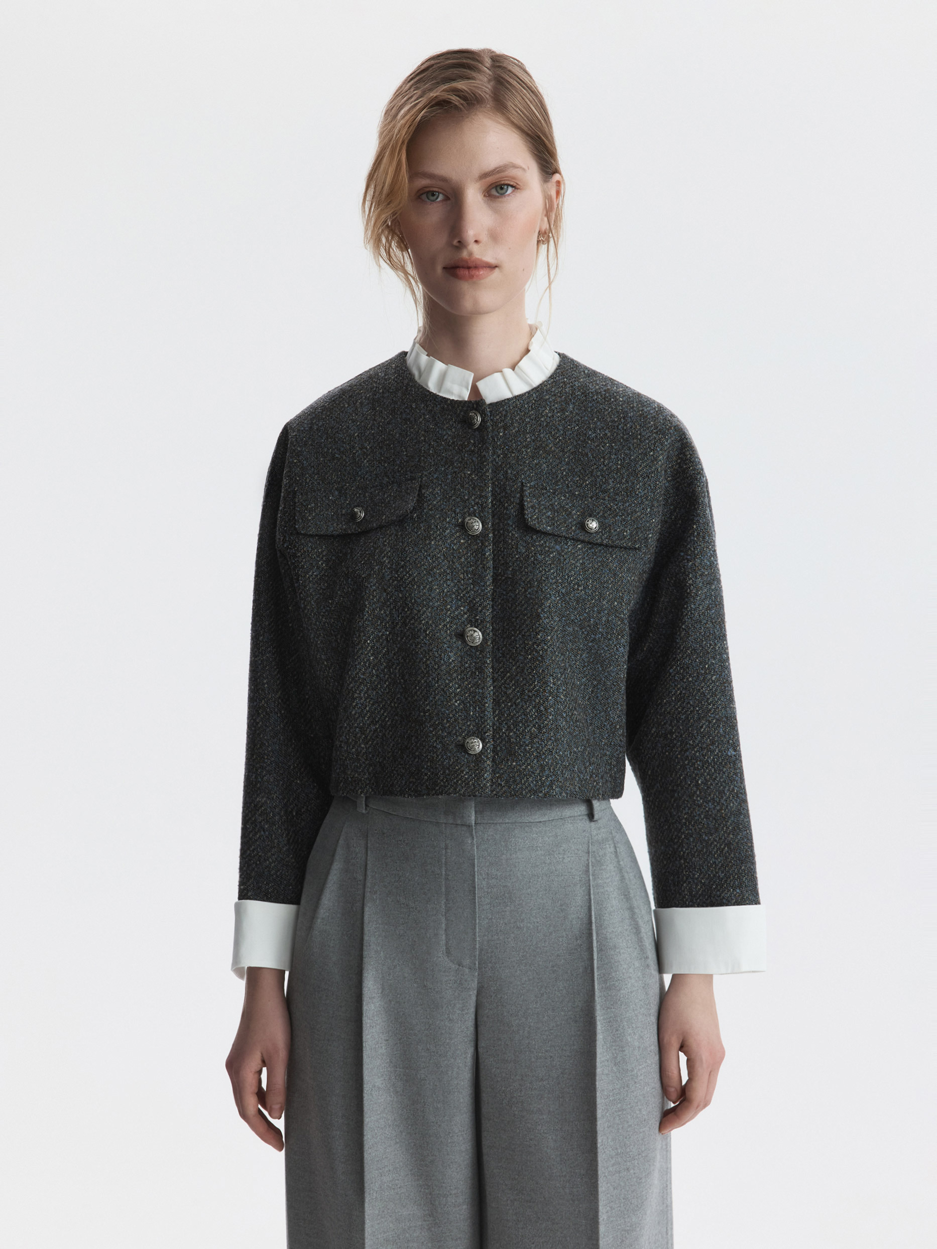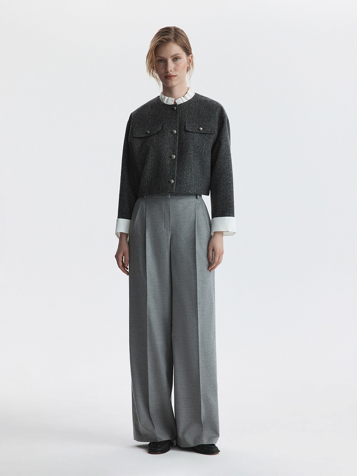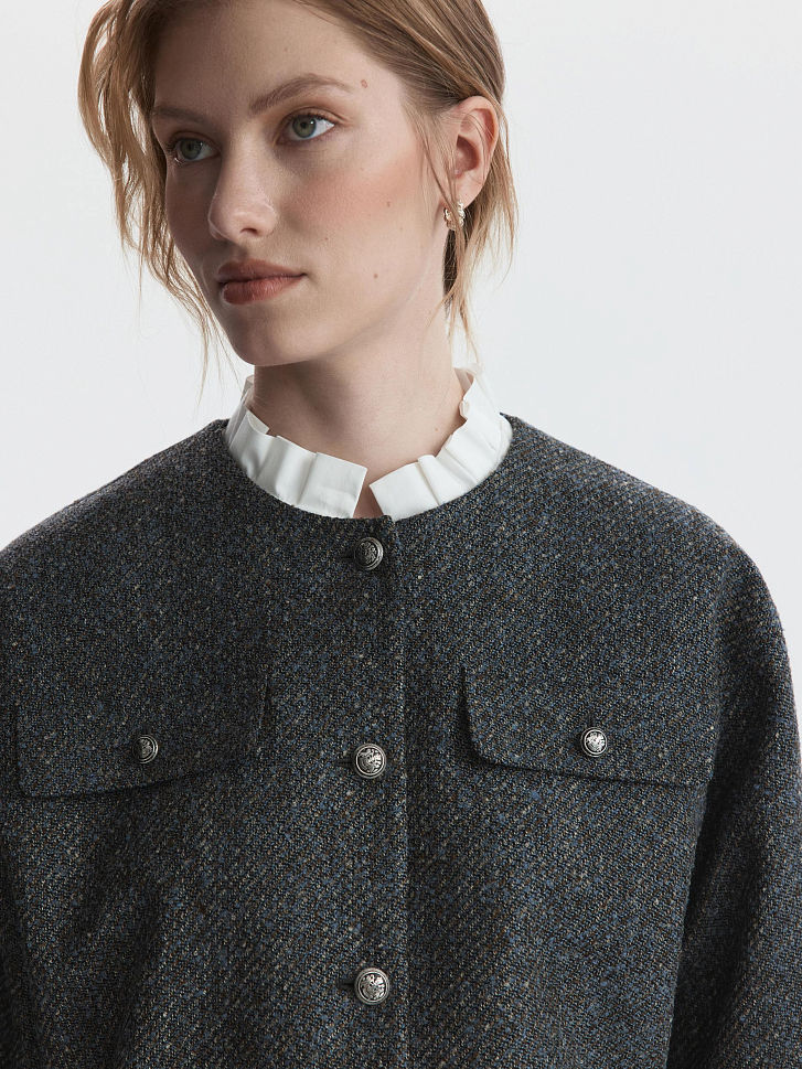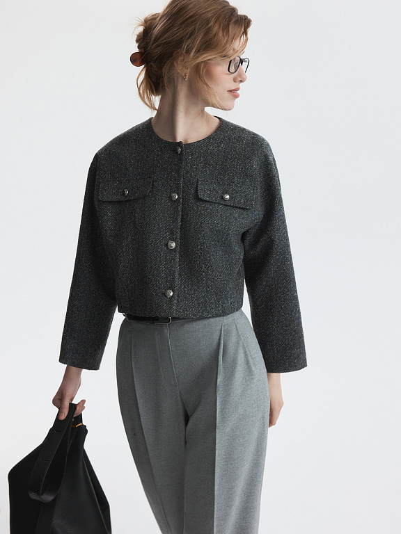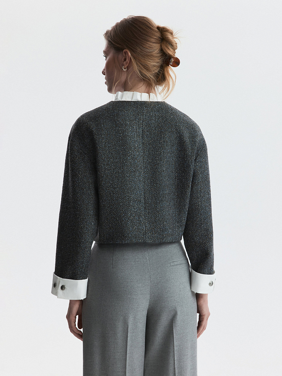 Укороченный жакет с круглым вырезом будет актуален для деловых и вечерних планов. Плотный текстиль букле не тянется и хорошо держит форму, а гладкая подкладка дарит комфортное прилегание. Съемные детали из рубашечной ткани можно отстегнуть и сделать жакет более строгим, но не менее выразительным.