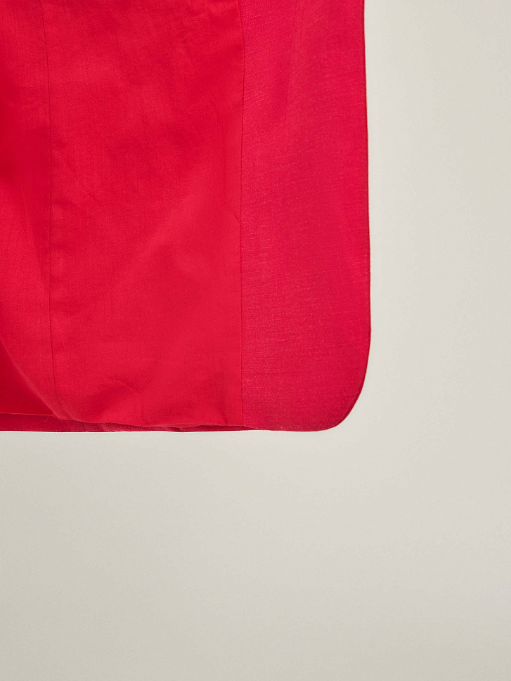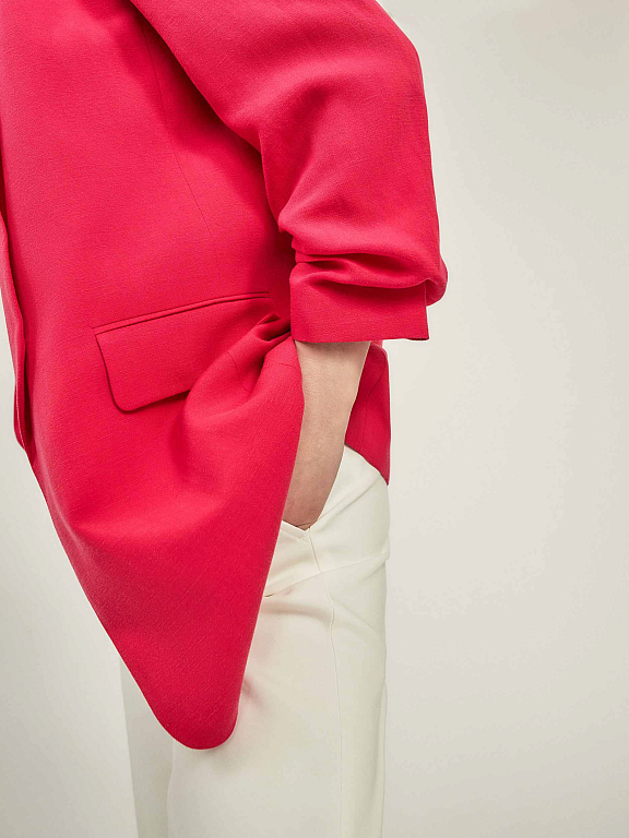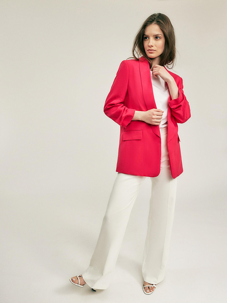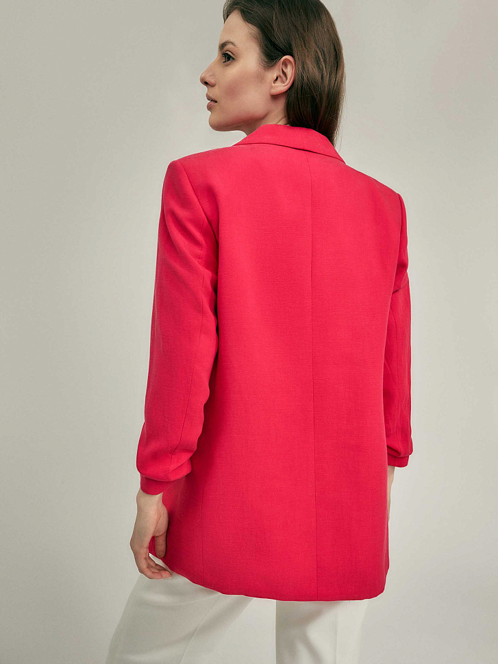 Жакет прямого кроя изо льна. Отложной воротник с лацканами, подплечники, рукава длины ¾ с драпировкой, карманы с клапанами, подклад.