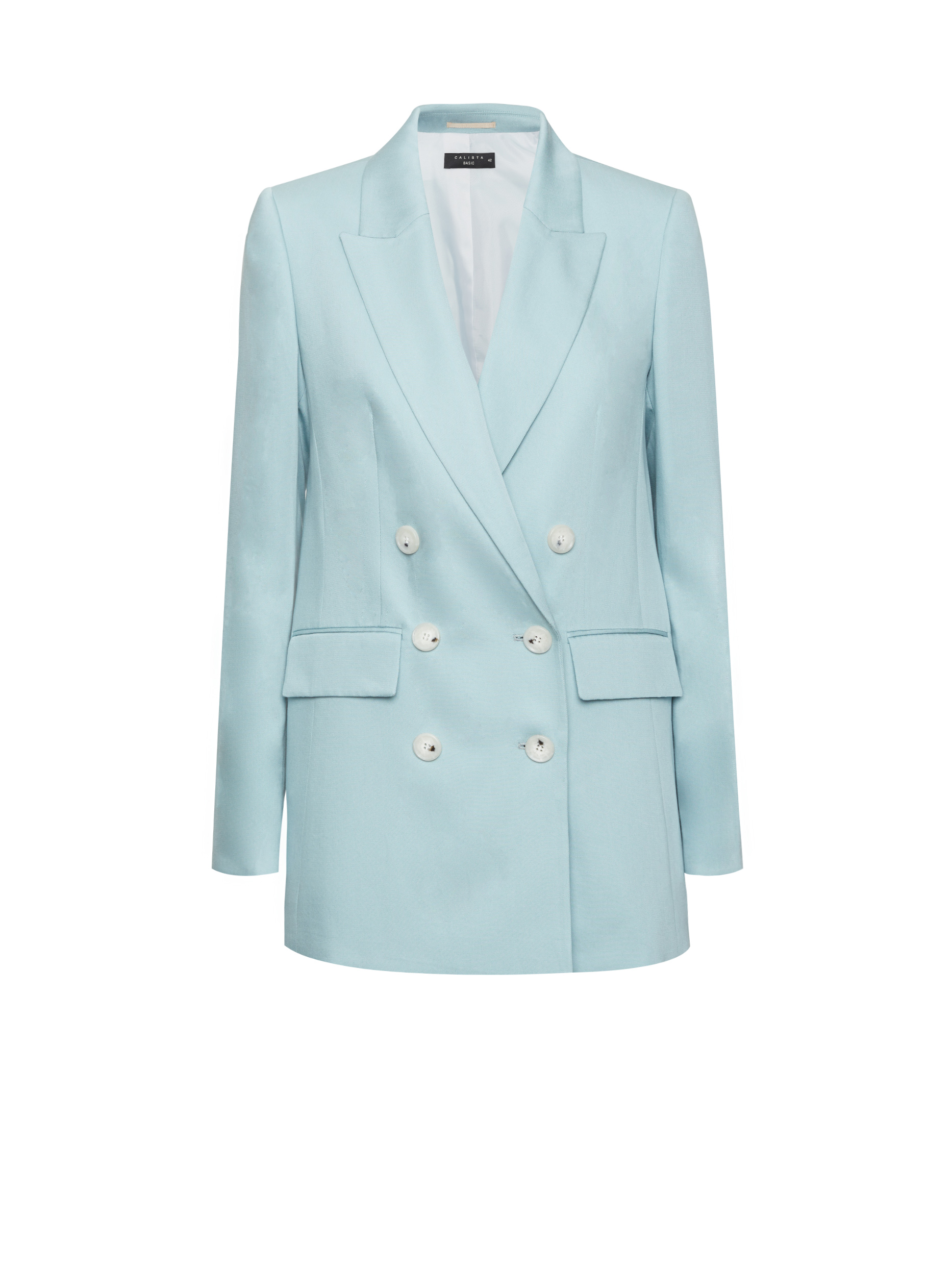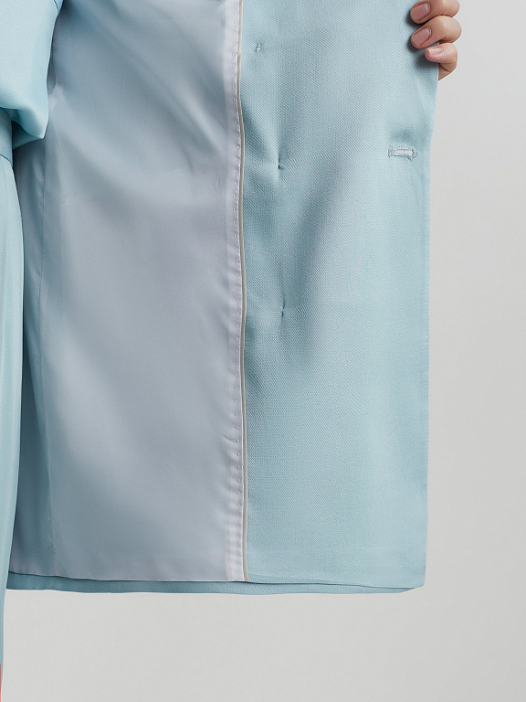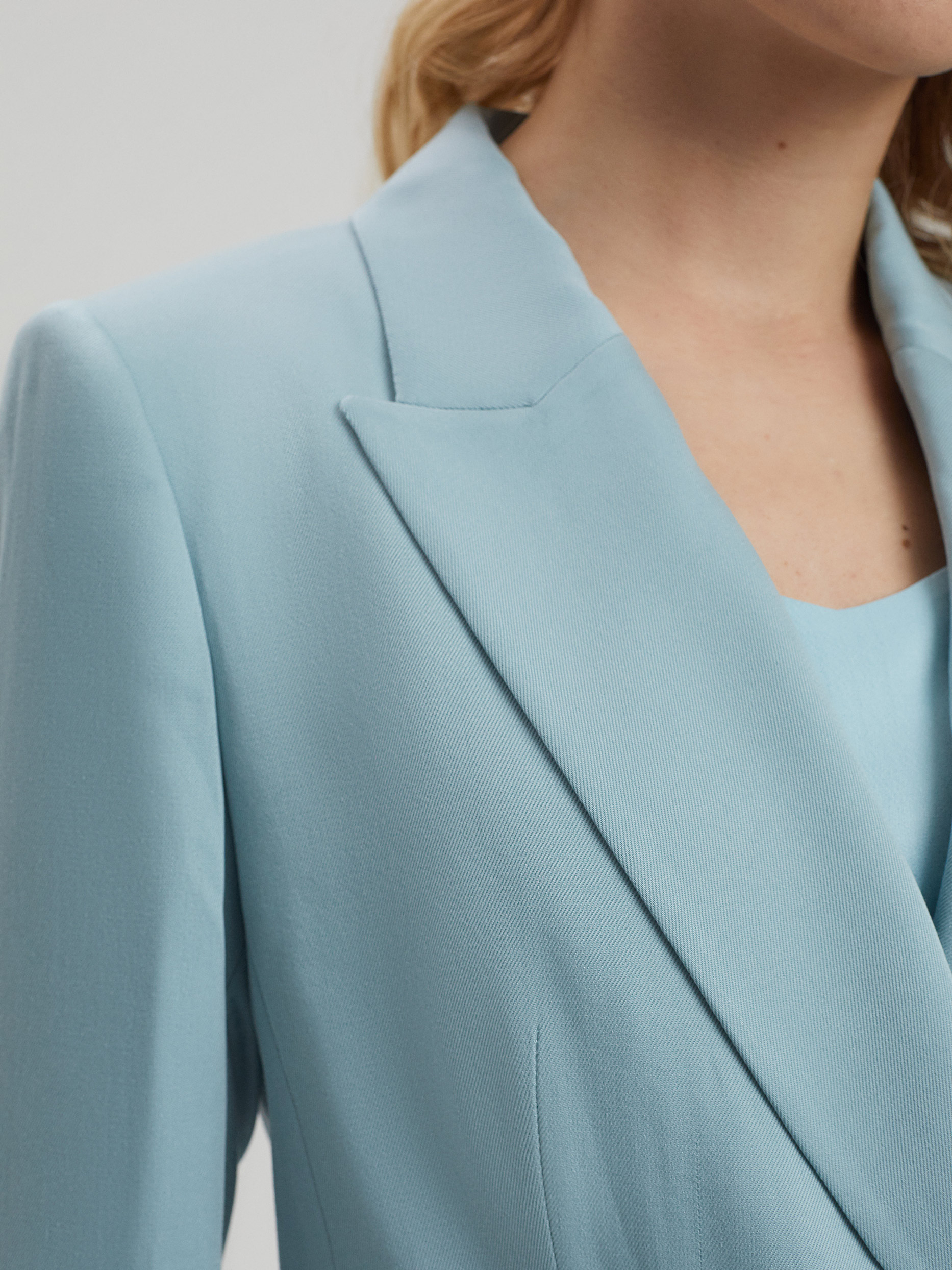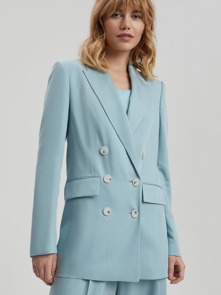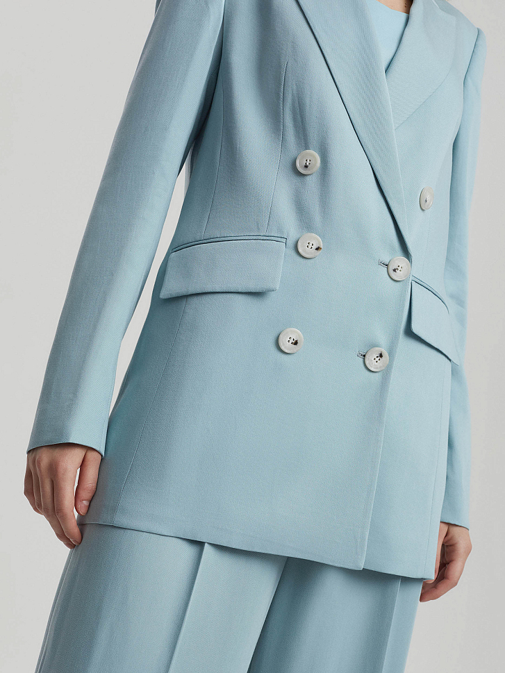 Жакет слегка приталенного кроя из тенсела. Отложной воротник, остроконечные лацканы, подплечники, ряды пуговиц на манжетах, карманы с клапанами, шлица, подклад.