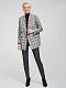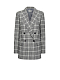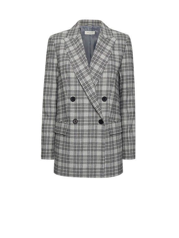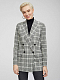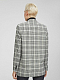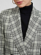 Прямой жакет в клетку с добавлением шерсти. Широкие остроконечные лацканы с разрезами, карманы с клапанами, рукава с рядами пуговиц, подкладка. Двубортная застежка на крупные пуговицы.
