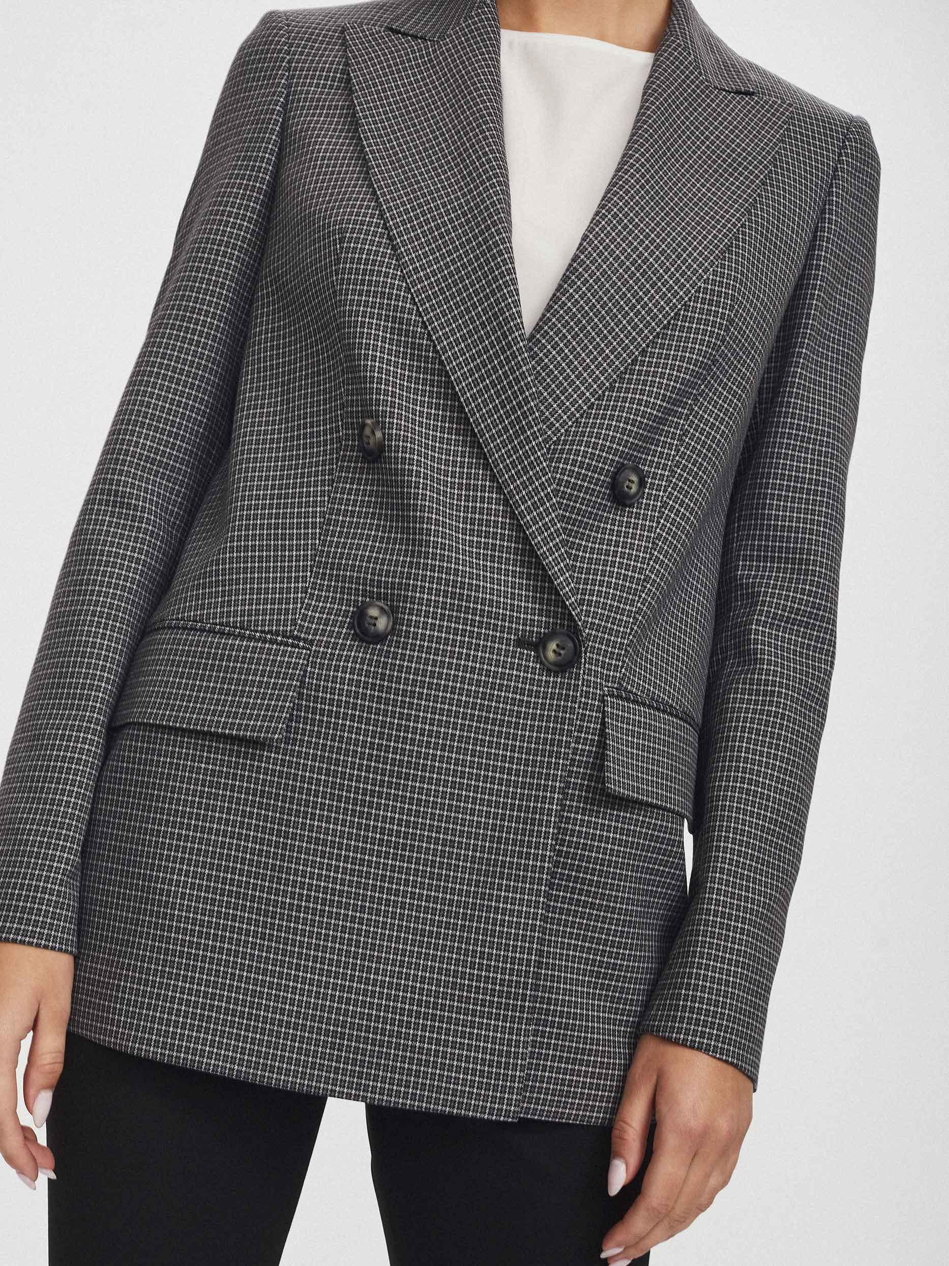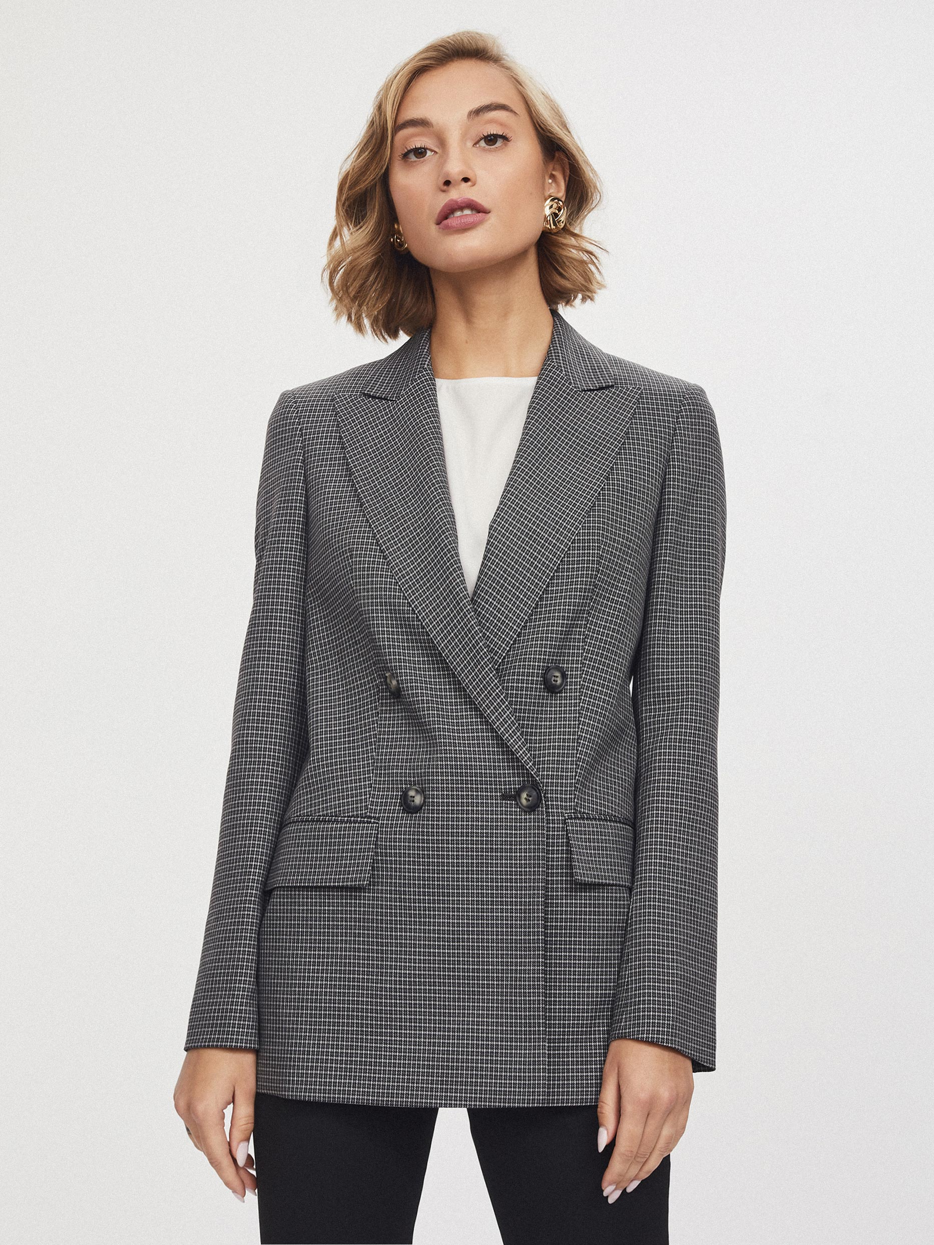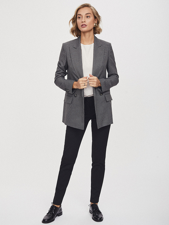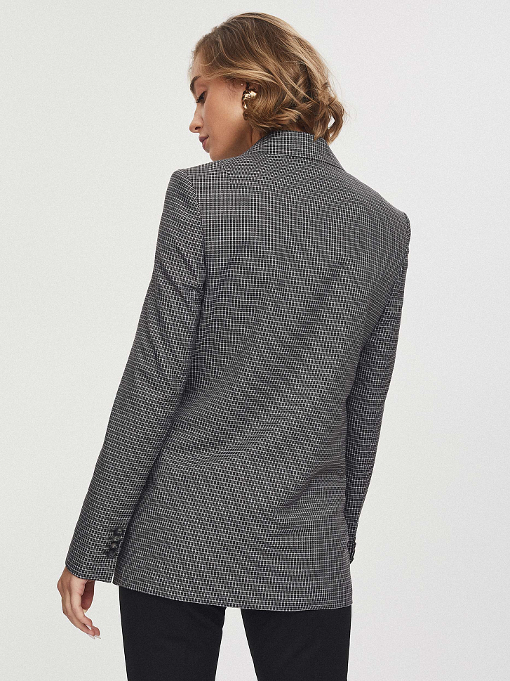 Удлиненный двубортный жакет прямого кроя. Лацканы, длинные рукава с пуговицами, карманы с клапанами. Застегивается на два ряда крупных контрастных пуговиц. Изделие на подкладке.
