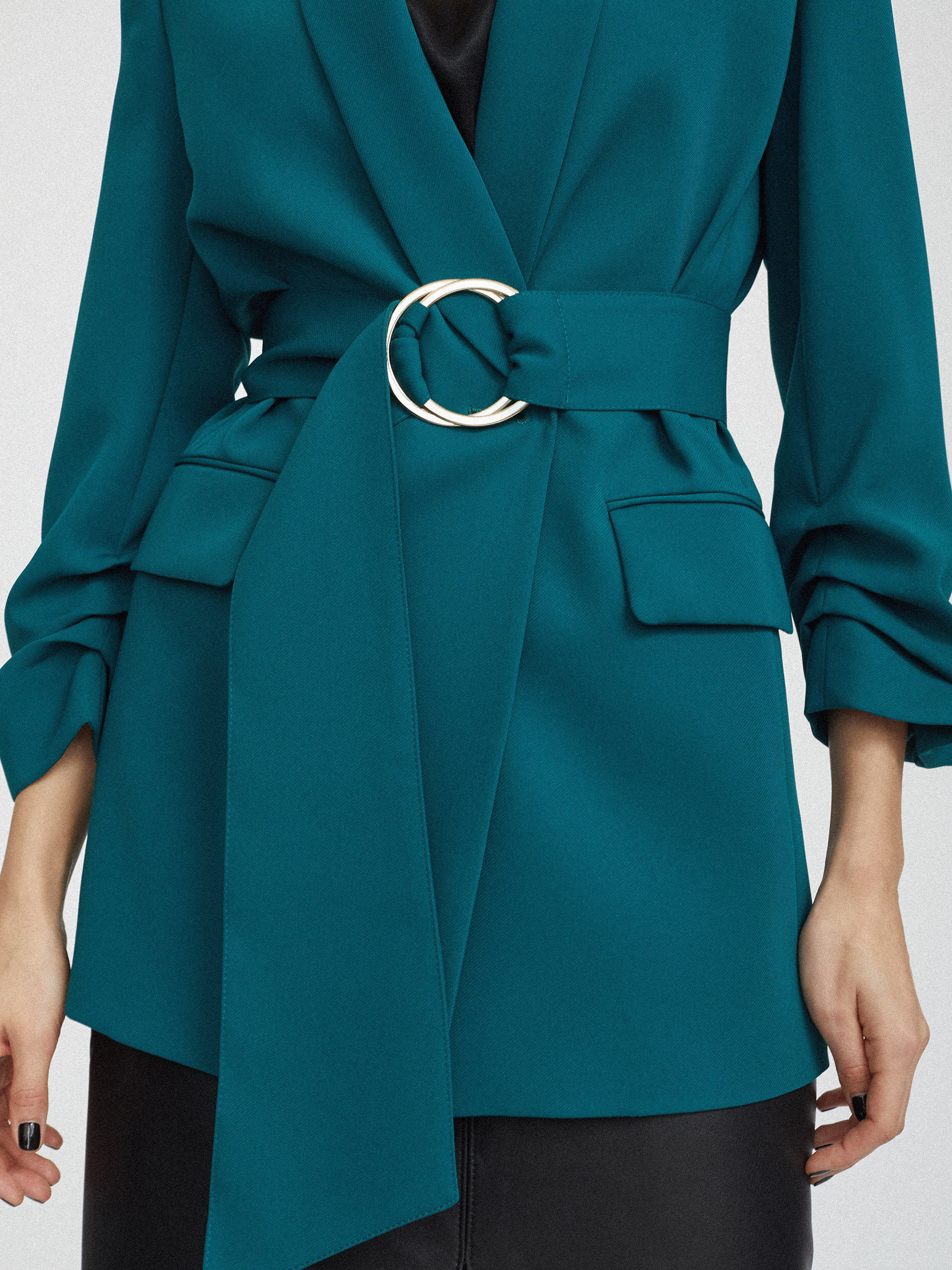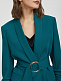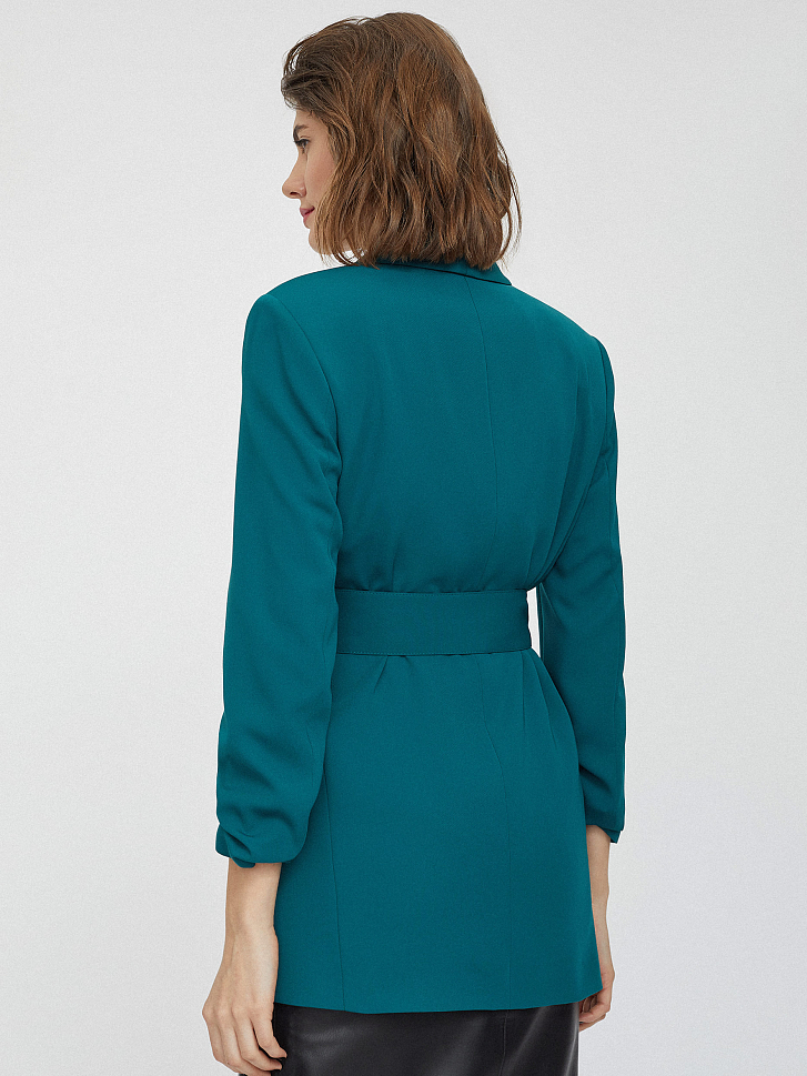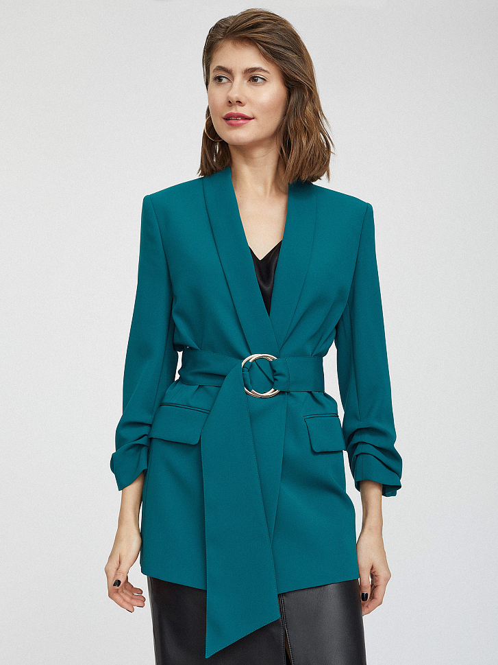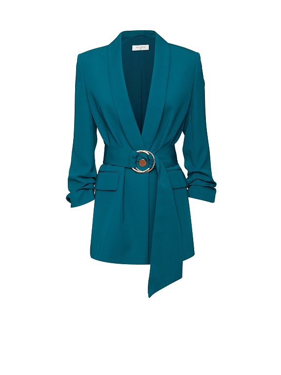 Удлиненный однобортный жакет. Закругленные лацканы, рукава длины ¾ с драпировкой, декоративные карманы с клапанами, подкладка. Застегивается на пуговицу. В комплекте пояс с пряжкой.