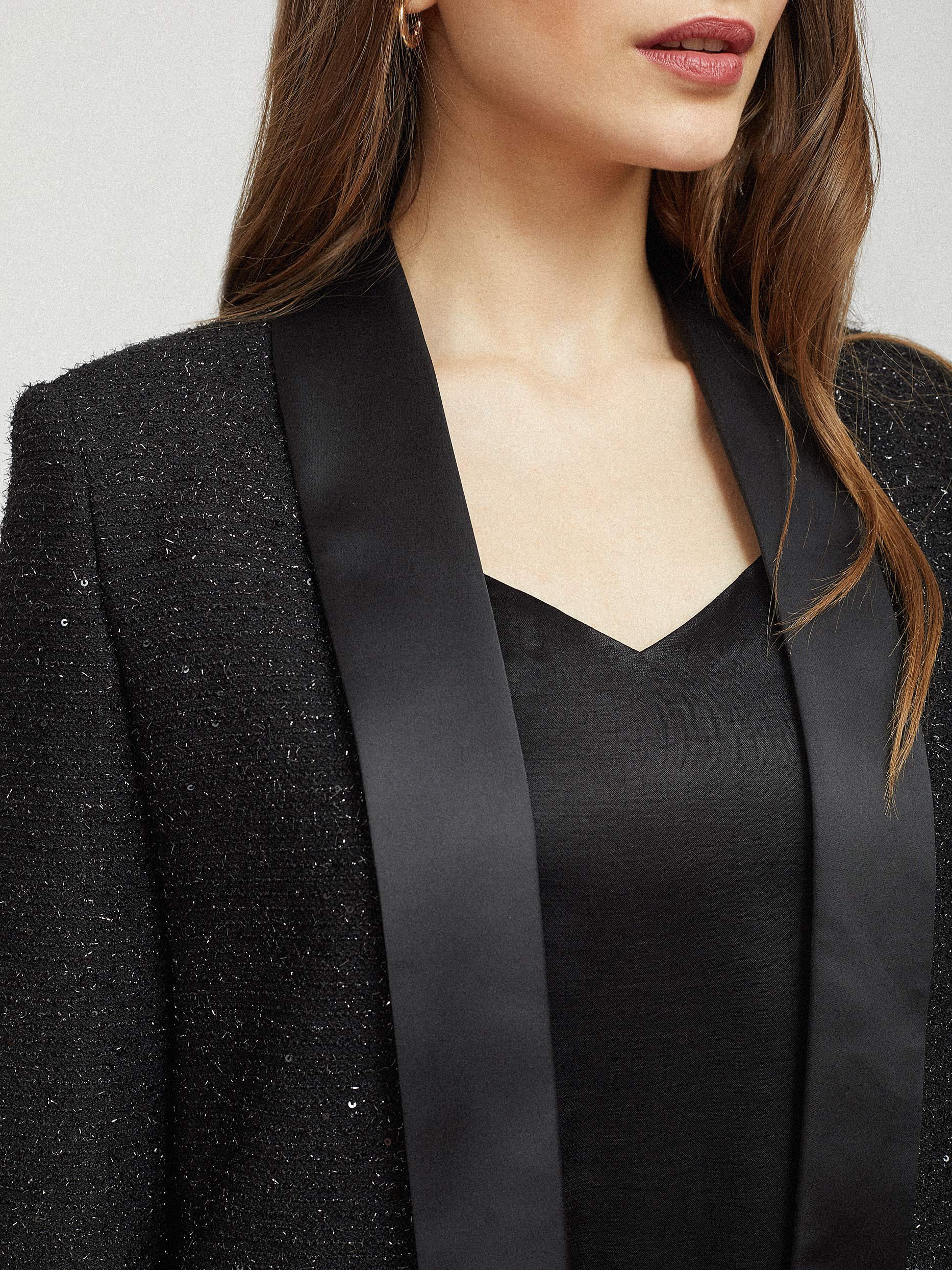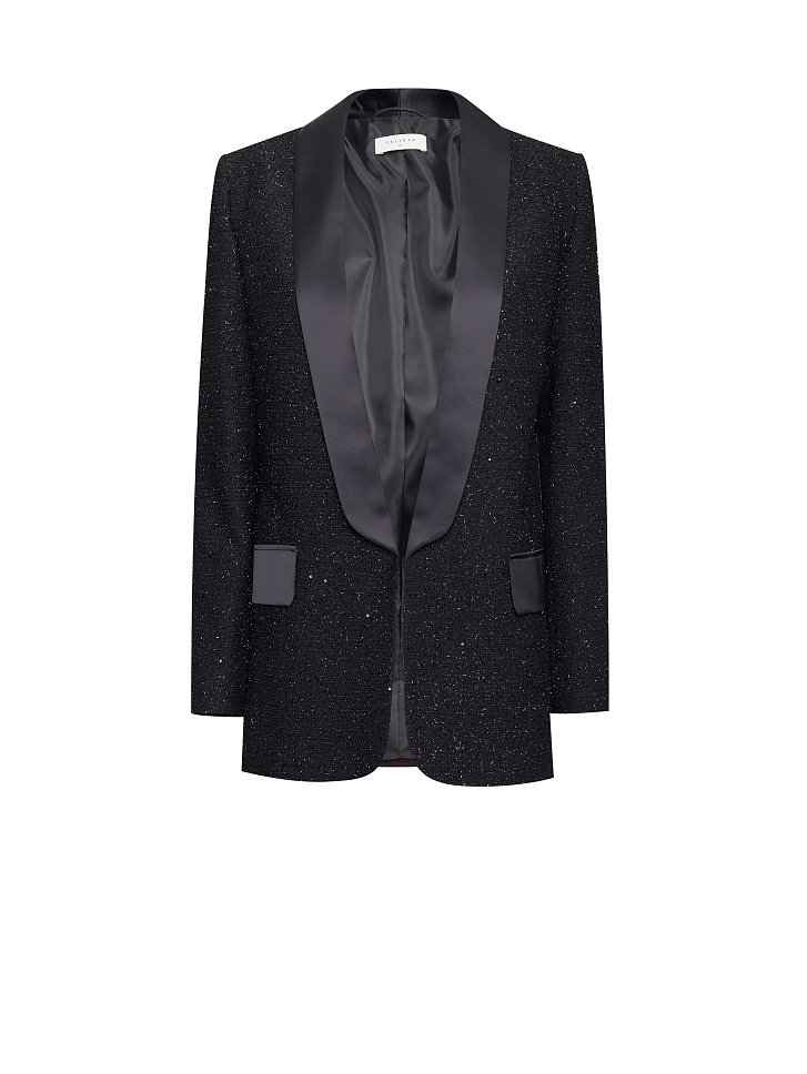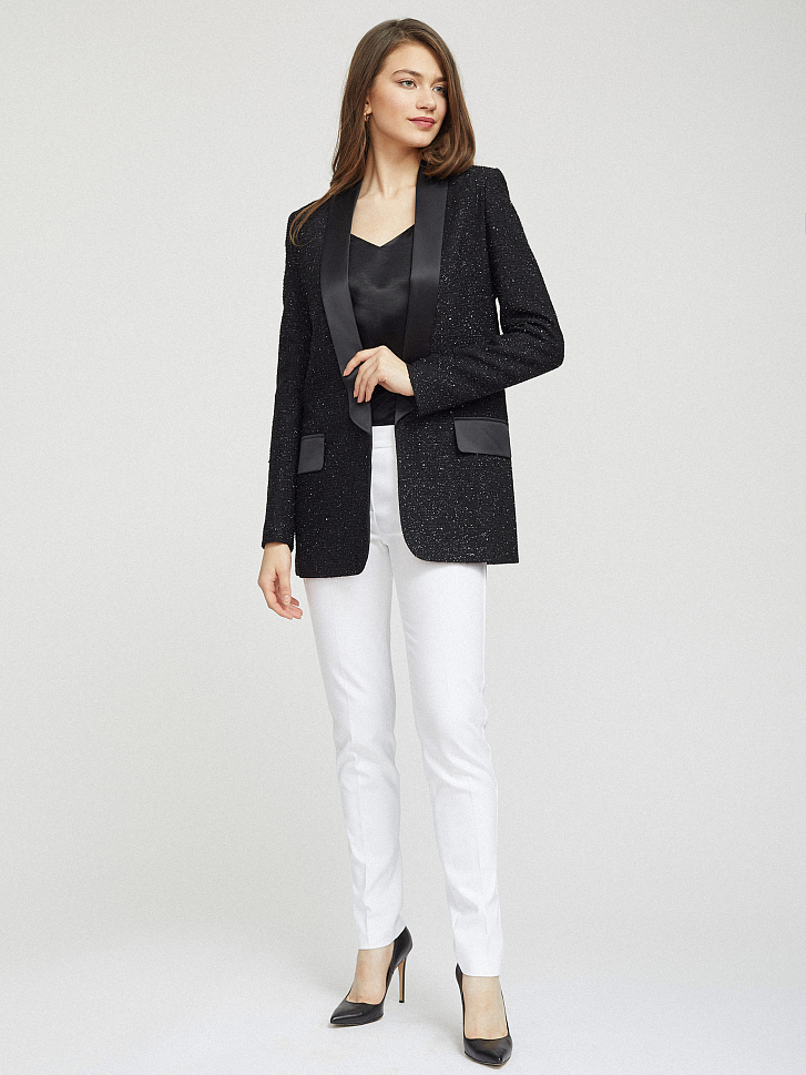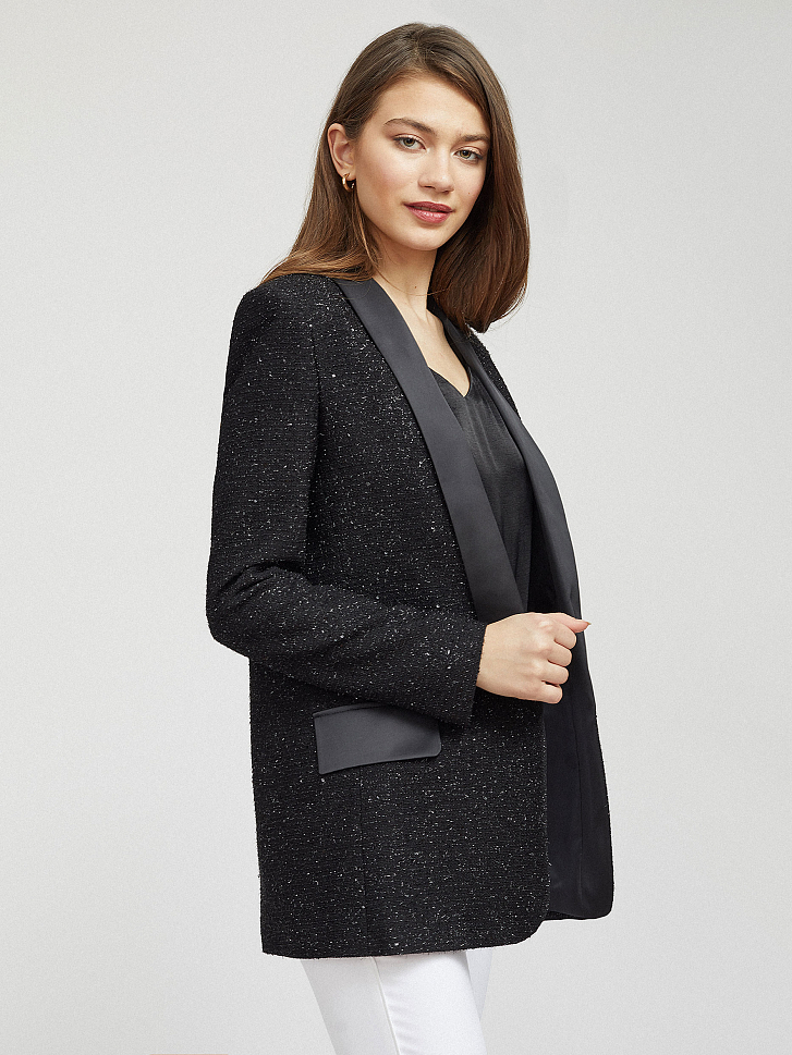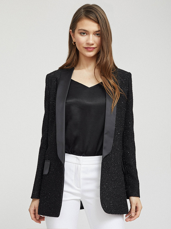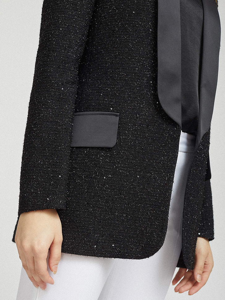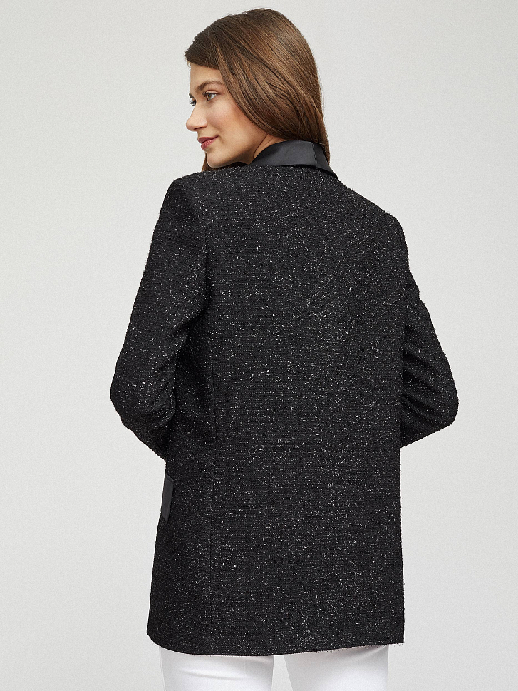 Прямой жакет из ткани букле с люрексом и пайетками. Атласный воротник с лацканами, декоративные атласные клапаны, подкладка.