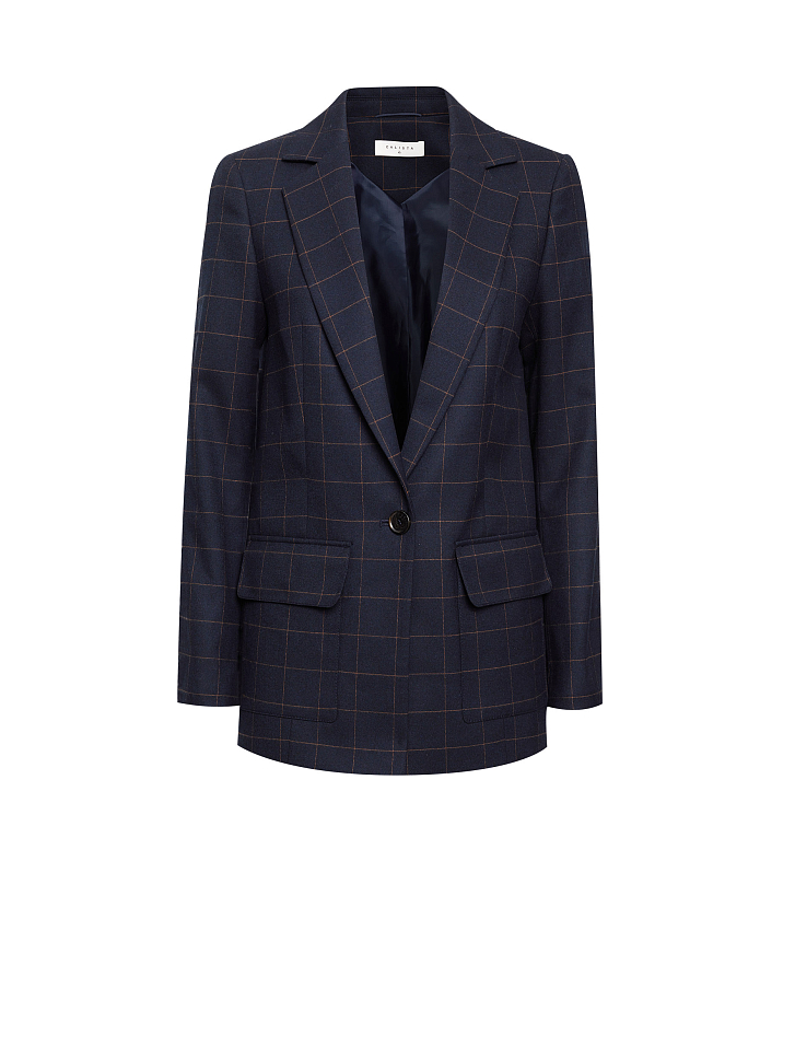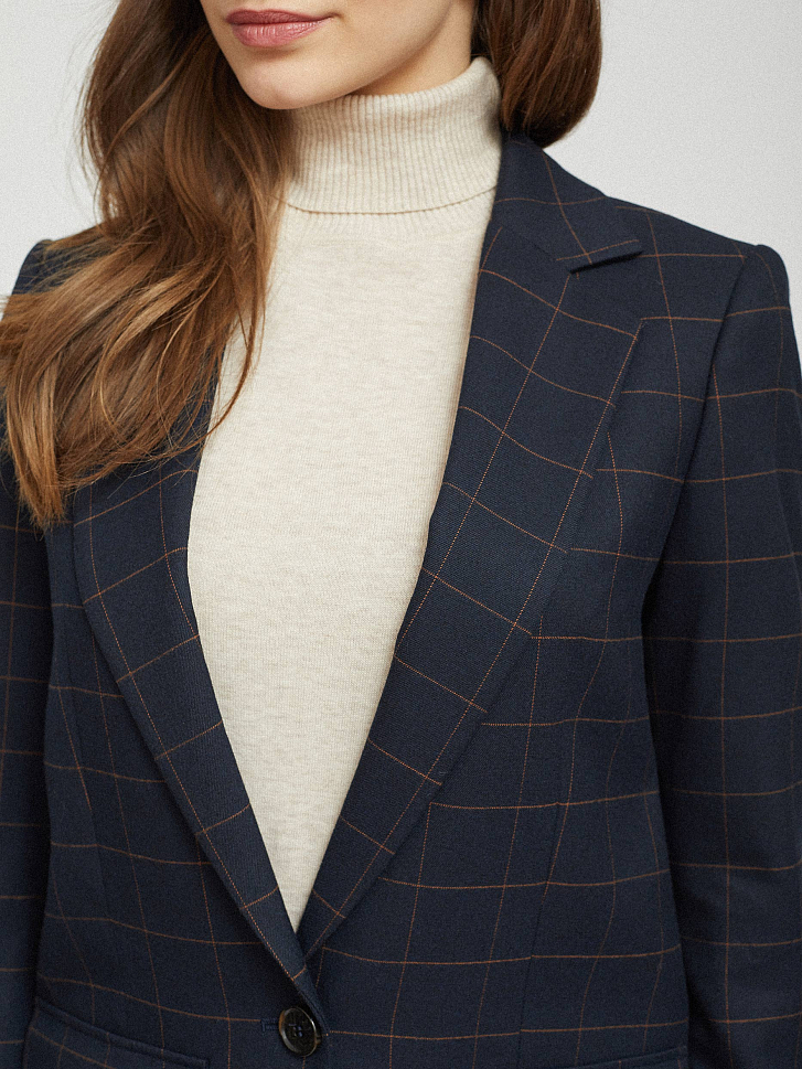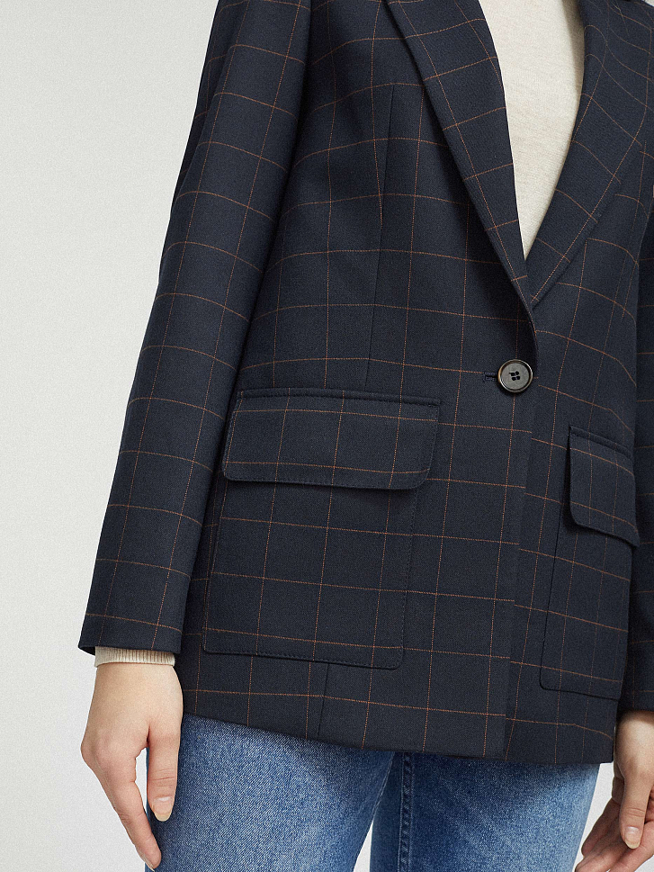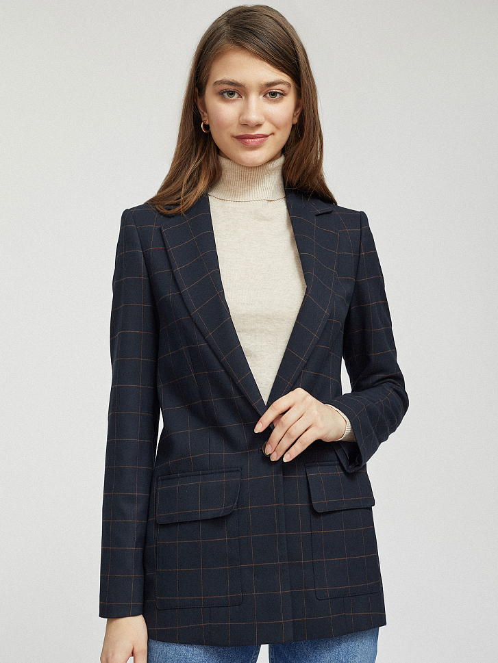 Однобортный жакет прямого кроя в крупную клетку. Отложной воротник с лацканами, накладные карманы с клапанами, подкладка. Застегивается на пуговицу.