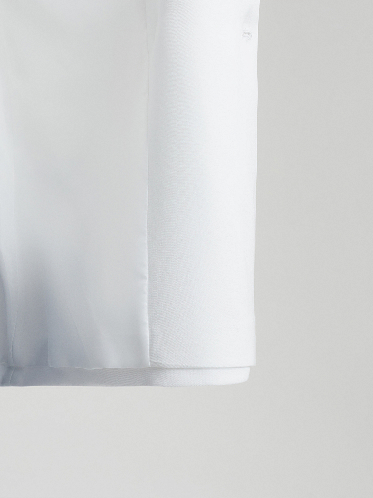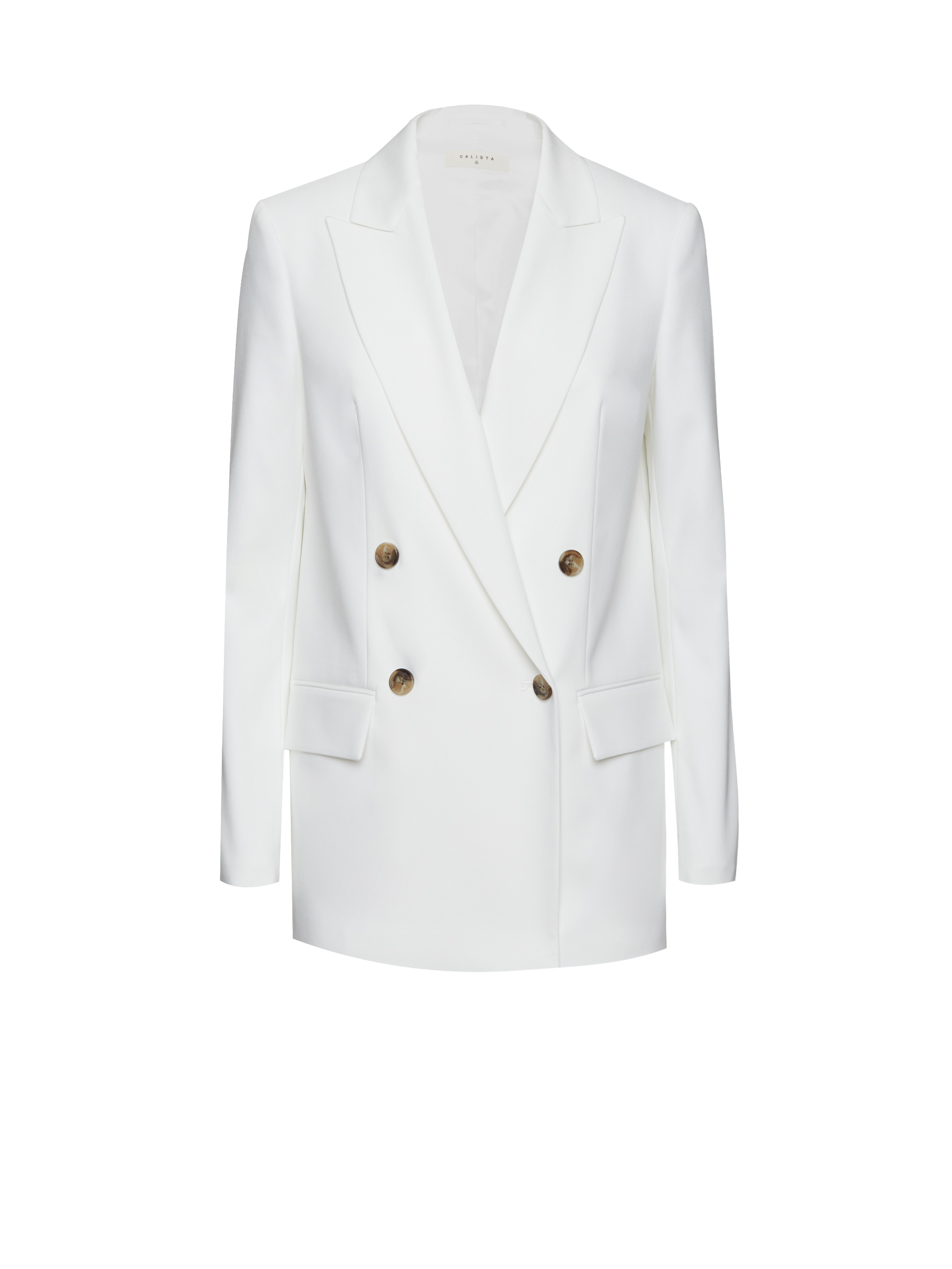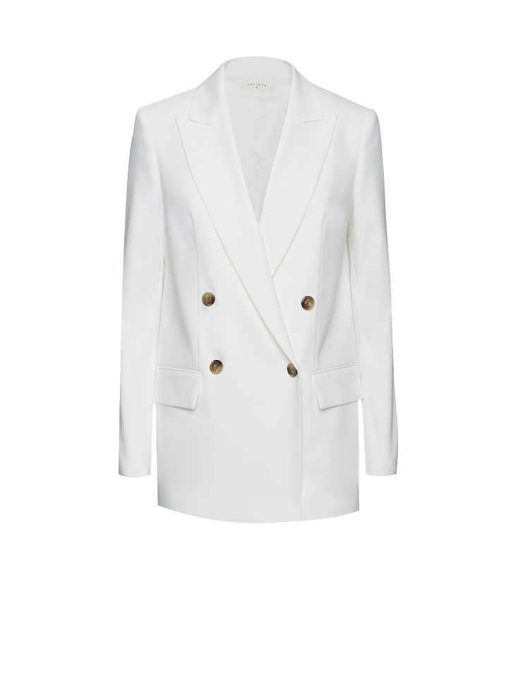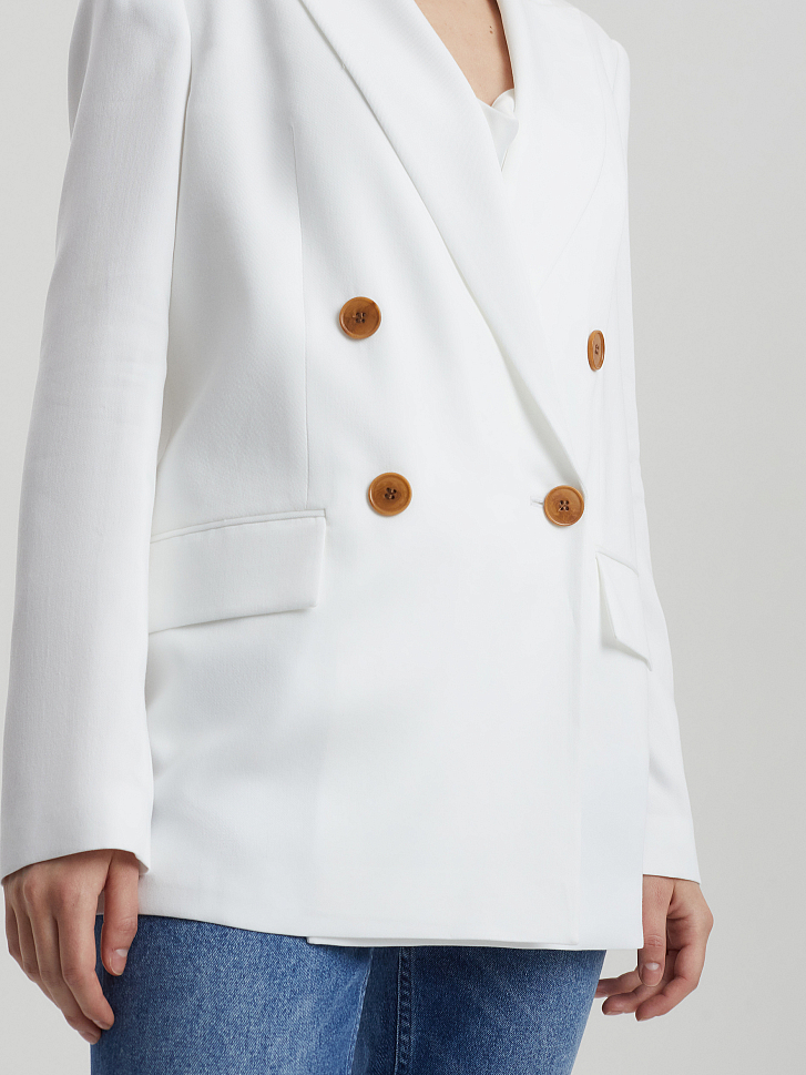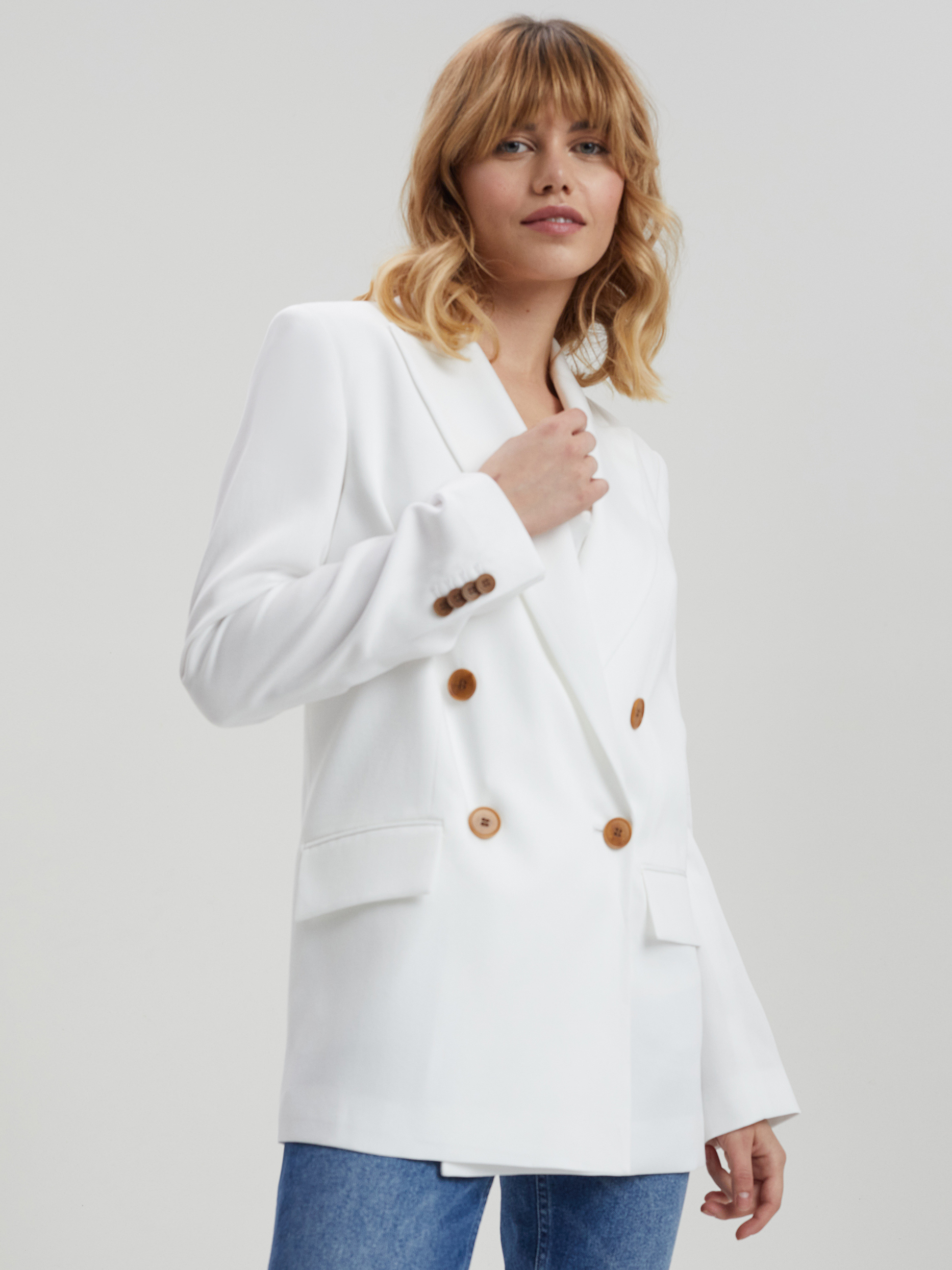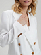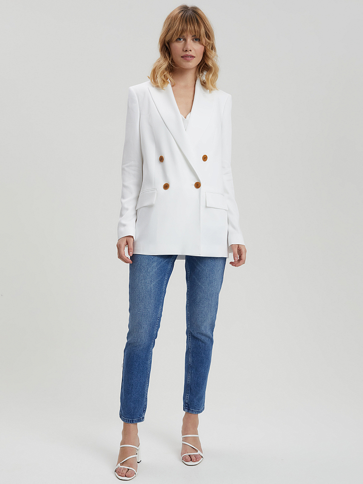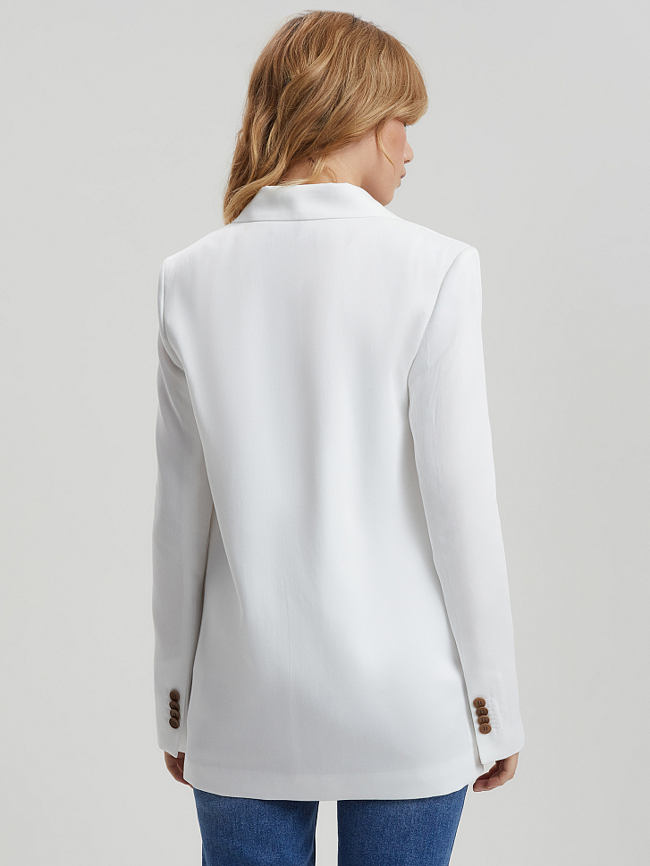 Однотонный жакет прямого кроя. Отложной воротник с лацканами, подплечники, карманы с клапанами, ряды пуговиц на манжетах, подклад.