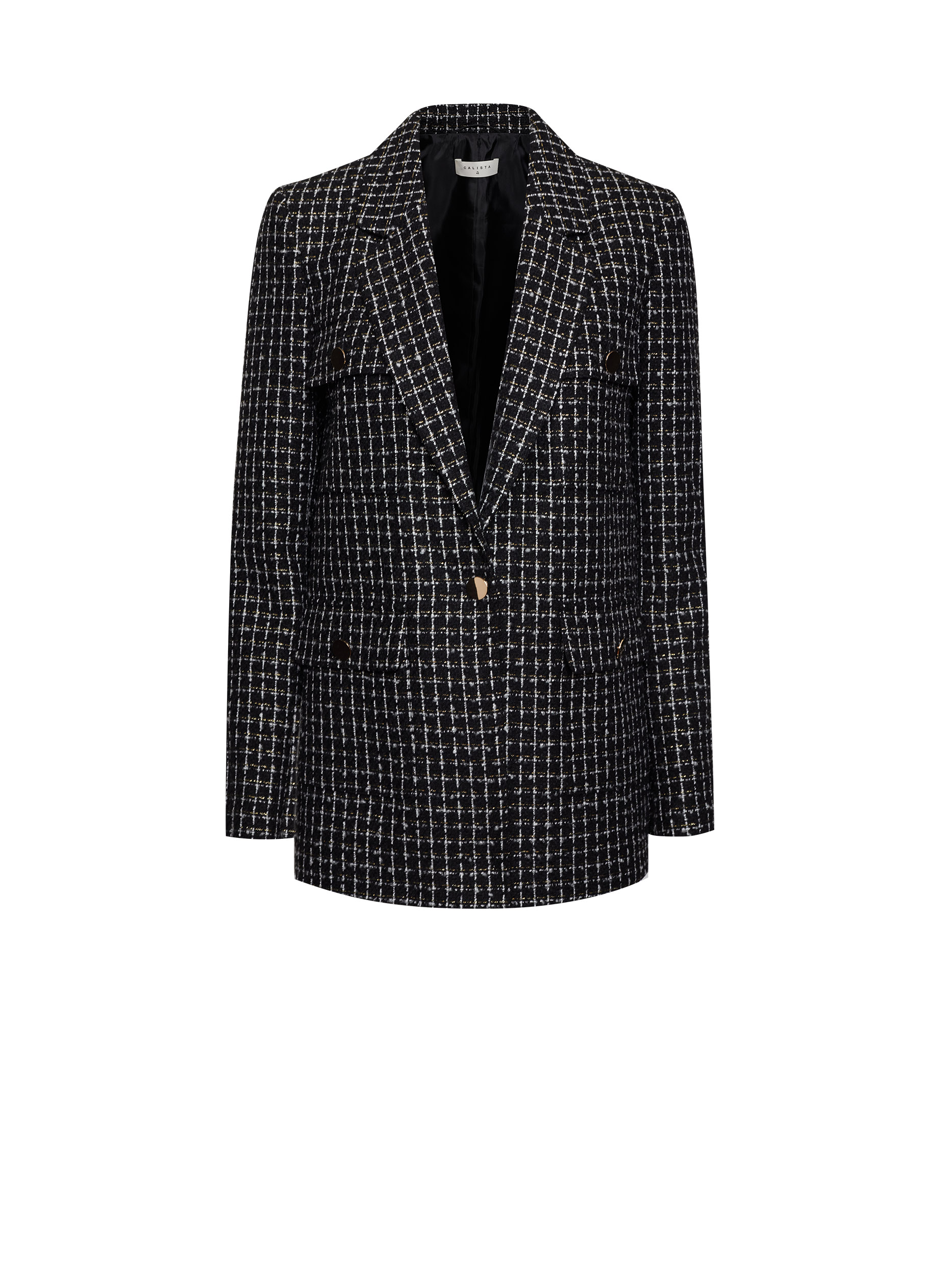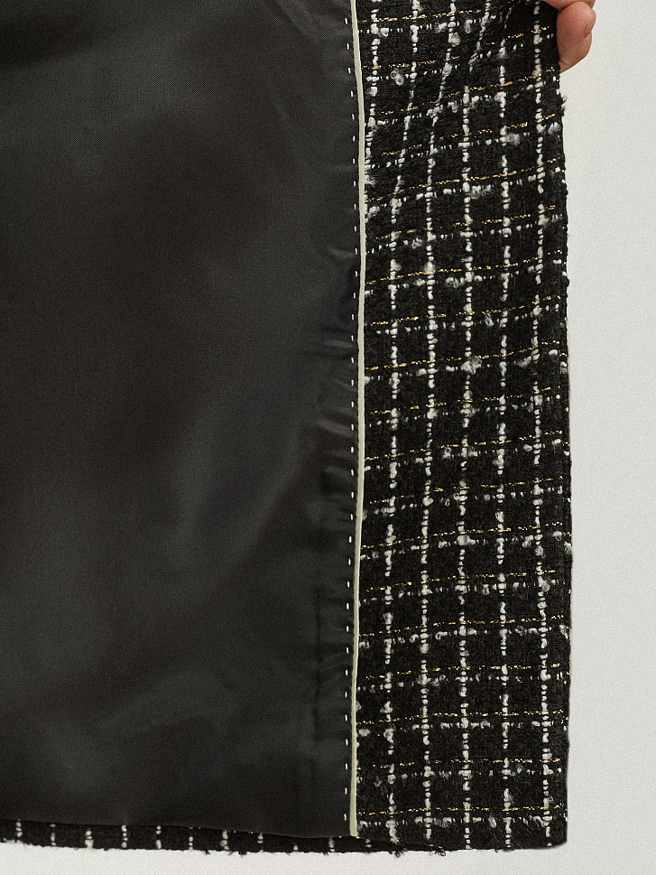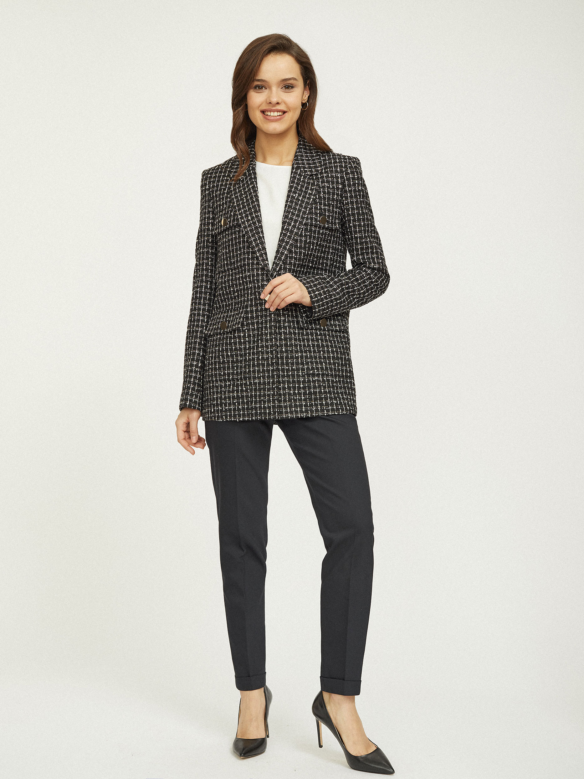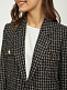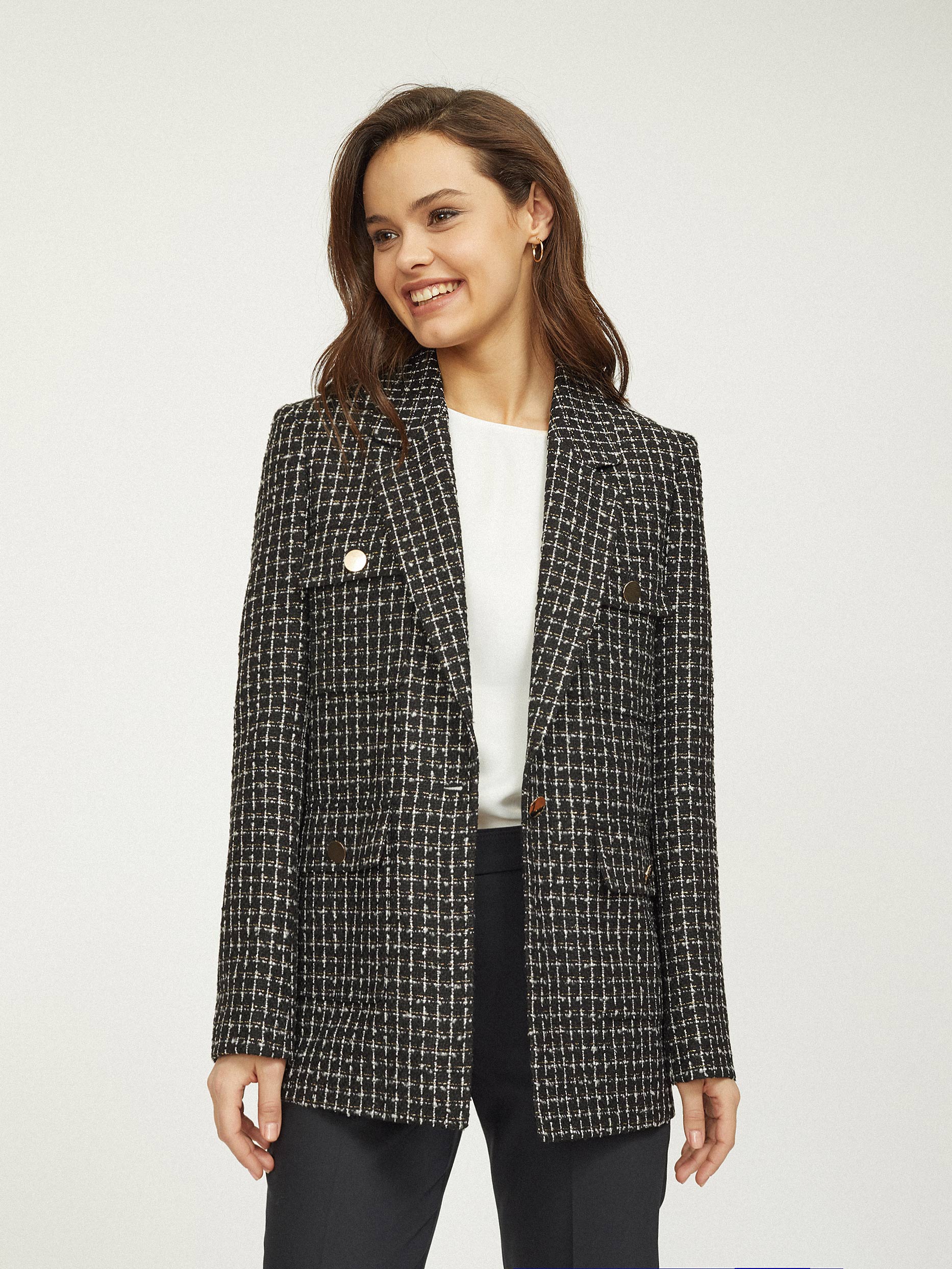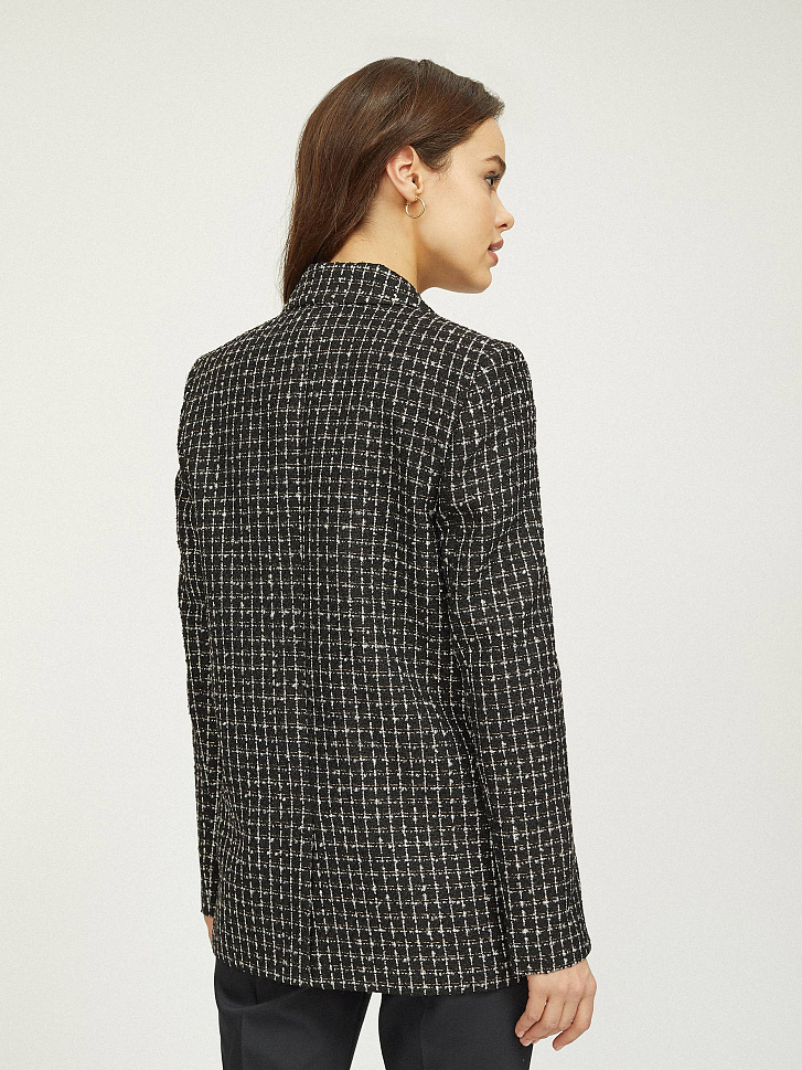 Прямой однобортный жакет из буклированной ткани. Отложной воротник с лацканами, накладные карманы с клапанами на пуговицах, шлица, подкладка. Застегивается на золотистую металлическую пуговицу.