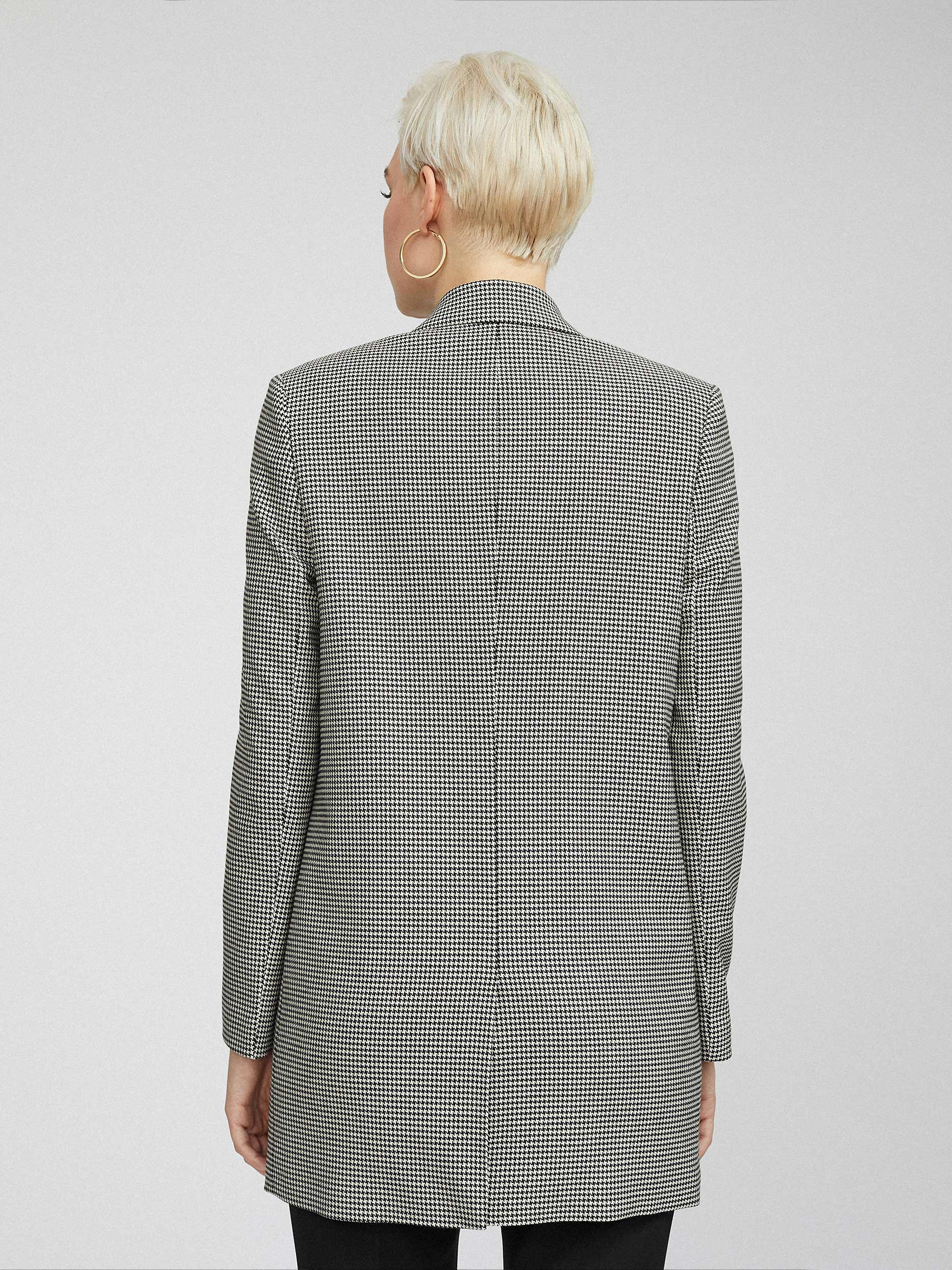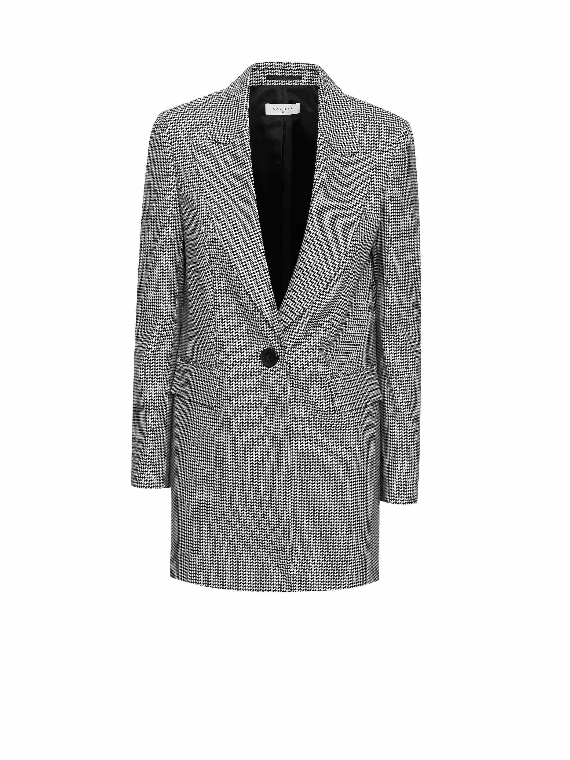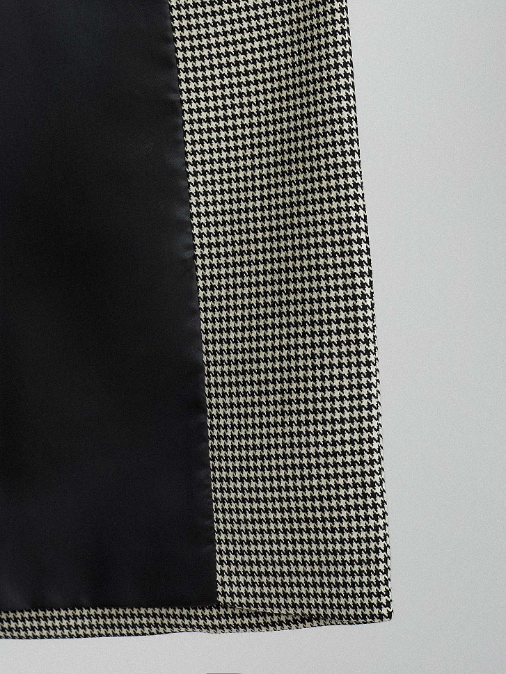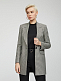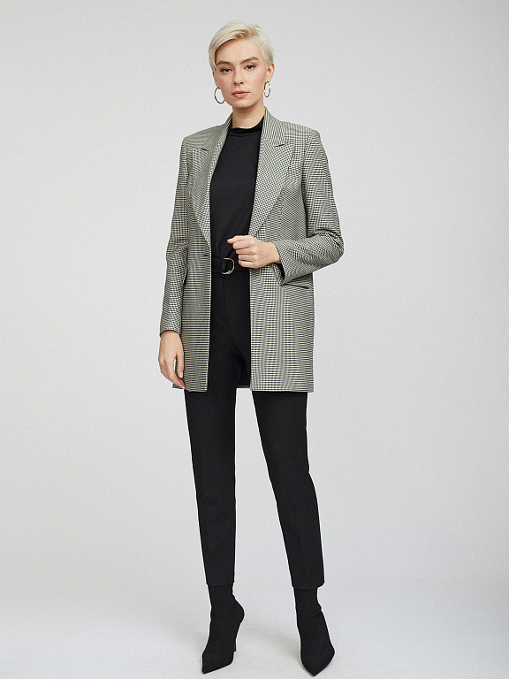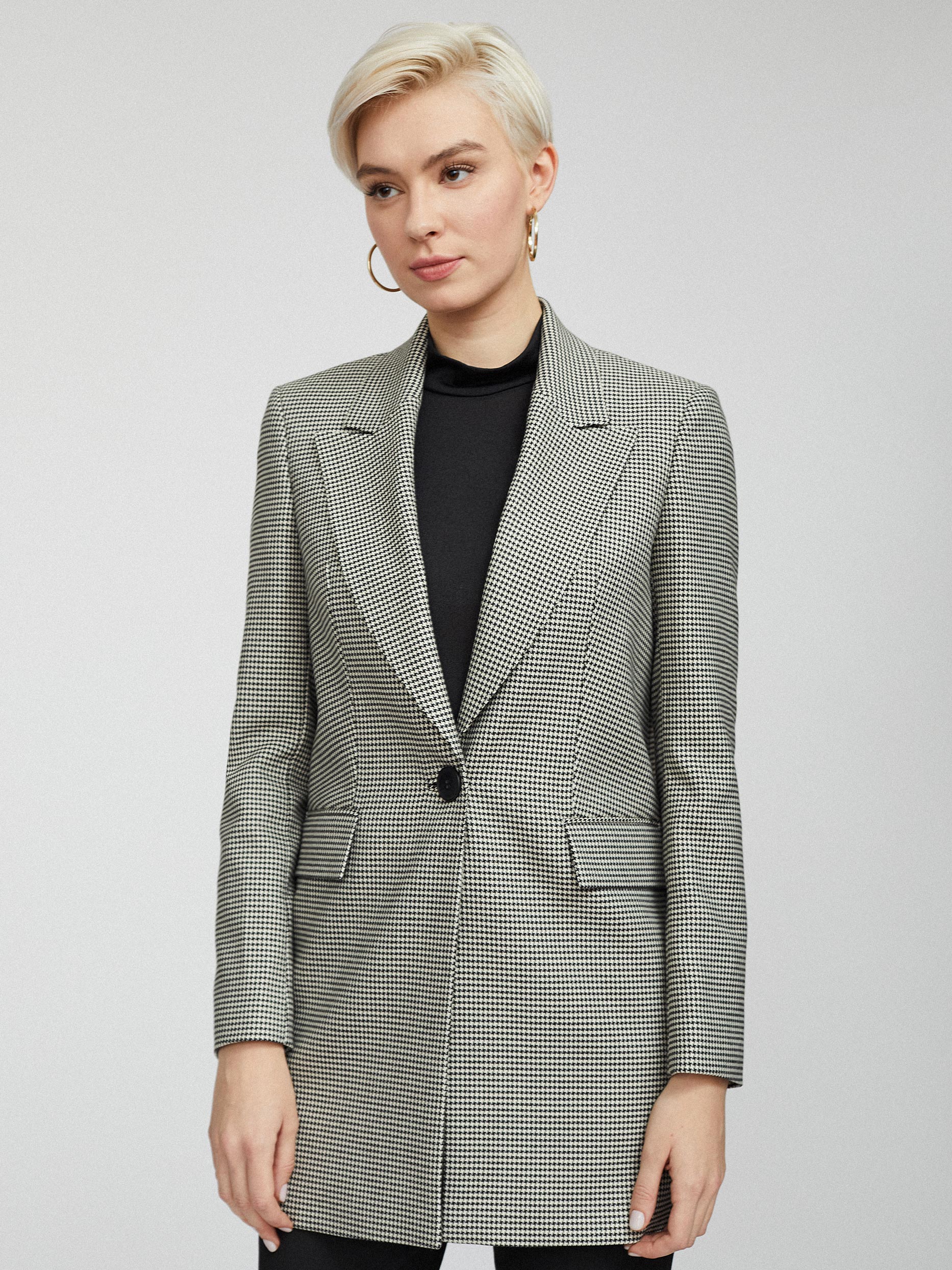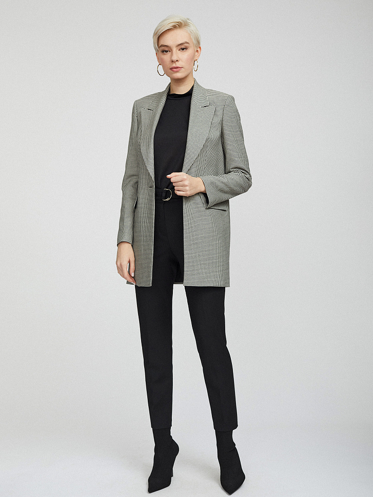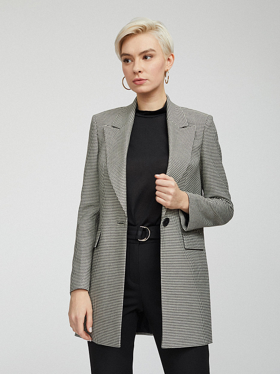 Удлиненный жакет с узором «гусиная лапка». Прямой крой, широкие остроконечные лацканы с разрезами, карманы с клапанами, шлица, подкладка. Застегивается на крупную пуговицу.