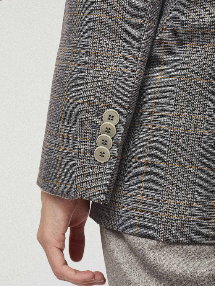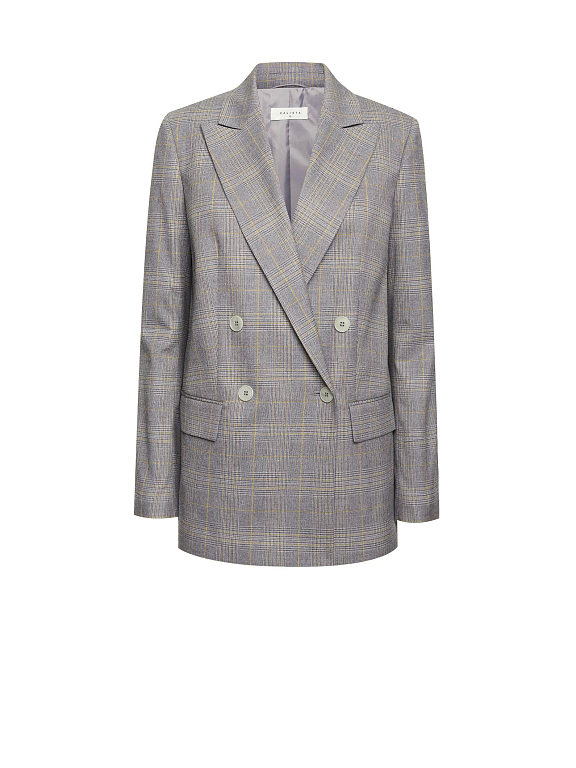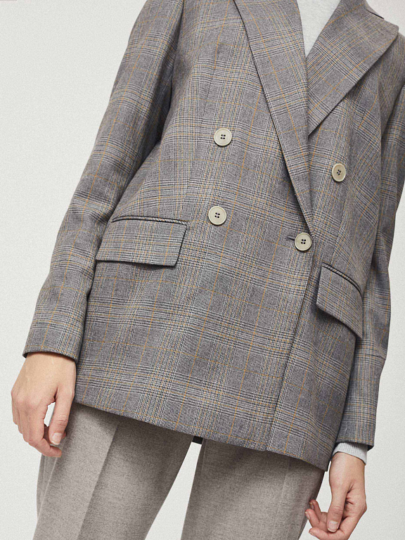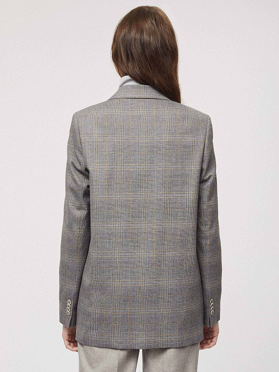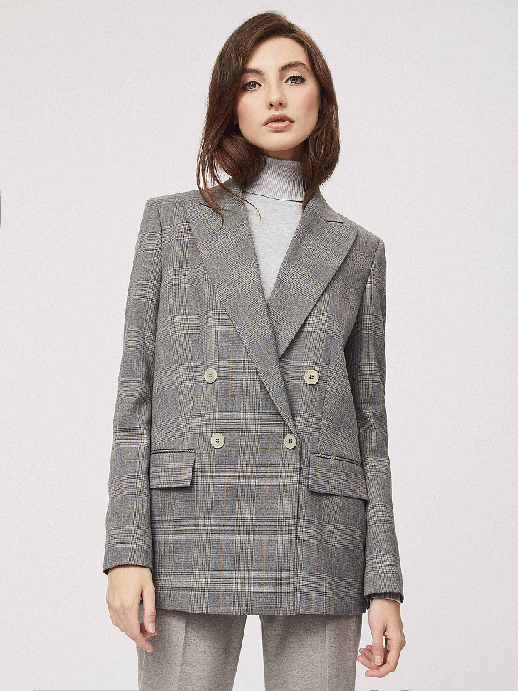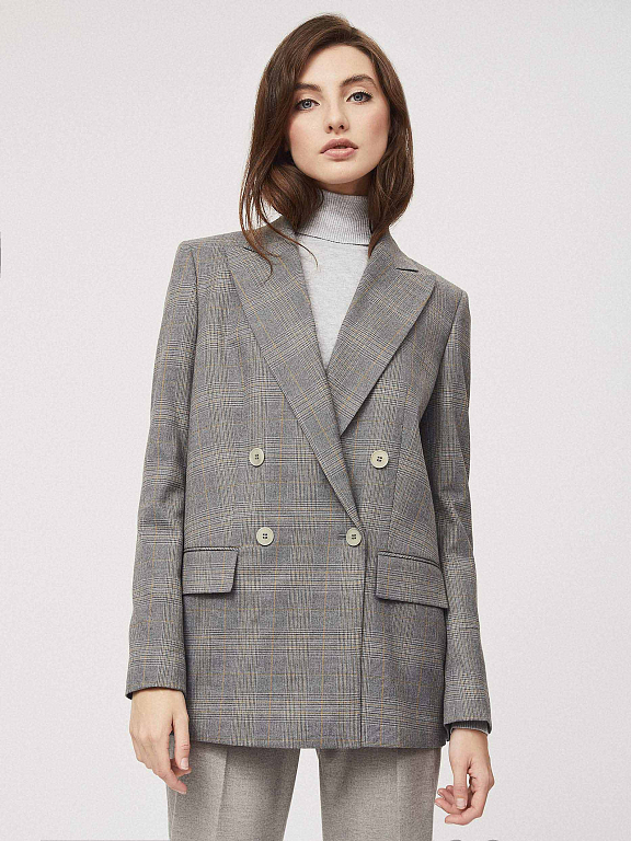 Жакет прямого силуэта, выполненный из смесовой вискозы. Лацканы, пуговицы на рукавах, карманы с клапанами. Застегивается на два ряда контрастных пуговиц. Изделие на подкладке.