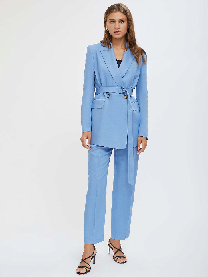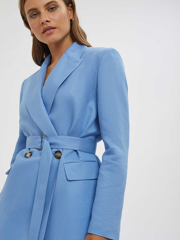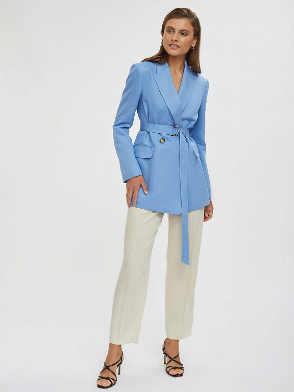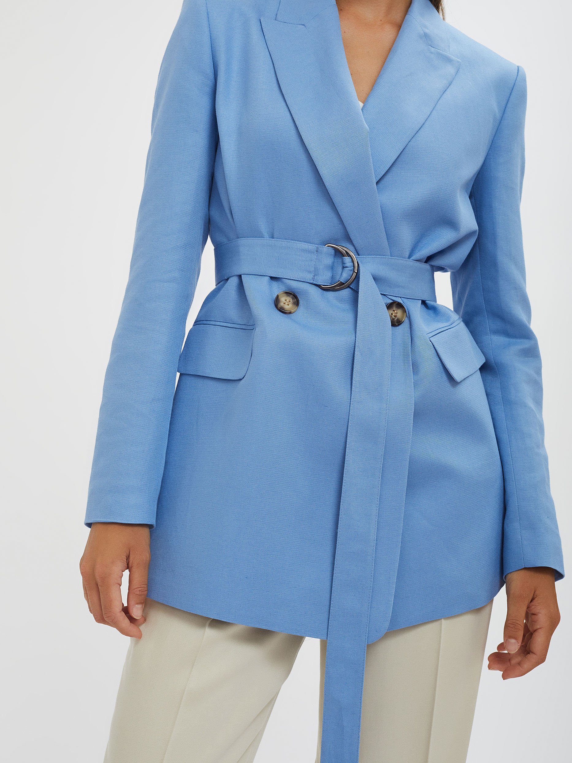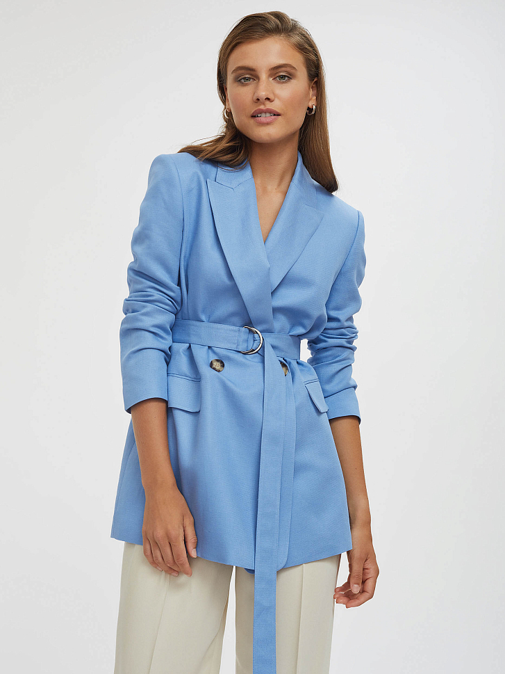 Однотонный жакет из смесового льна. Прямой силуэт, отложной воротник с остроконечными лацканами с разрезами, подплечники, шлица, подклад. В комплекте пояс.