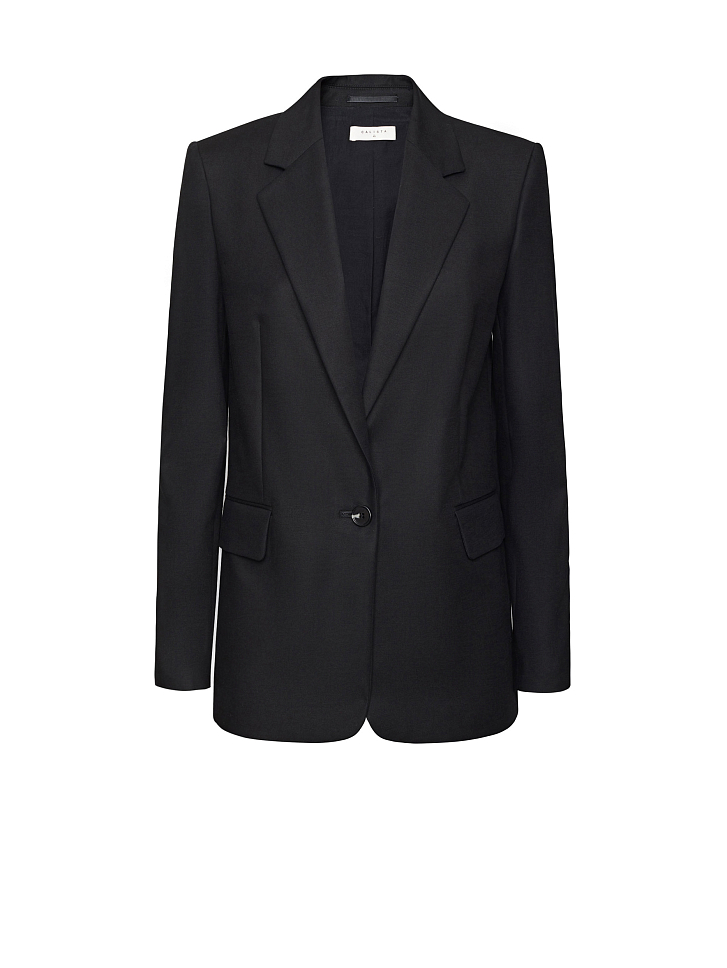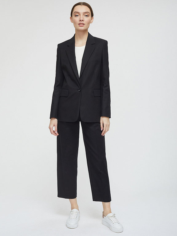 Однотонный жакет, выполненный из плотного хлопка. Прямой крой, отложной воротник с лацканами, наплечники, декоративные карманы с клапанами, ряды пуговиц на манжетах, шлица, подкладка.
