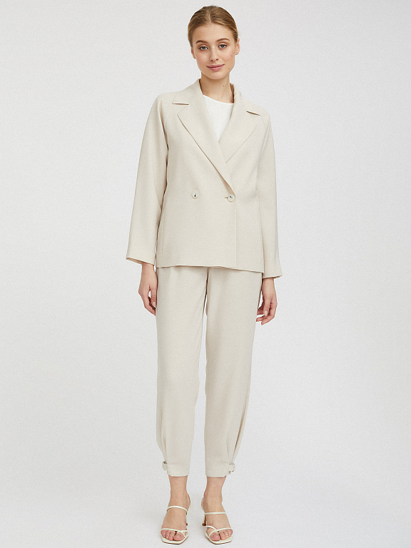 Однотонный жакет свободного кроя. Отложной воротник с широкими лацканами с разрезами, длинные широкие рукава, двубортная застежка на пуговицы, подкладка. В комплекте пояс из этой же ткани.