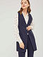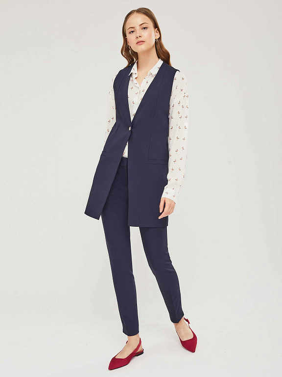 Удлиненный жилет из полихлопка с фигурными подрезами. Изделие с застёжкой на одну пуговицу и прорезными карманами с листочкой. Изделие на  подкладке. Рост модели 173 см, размер 42 (российский)