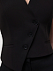 Укороченный жилет приталенного кроя имеет классический силуэт с трендовыми деталями: диагональная застежка на пуговицы и асимметричный низ. Плотный костюмный текстиль из поливискозы не вытягивается и хорошо держит форму, а для комфортной посадки продублирован гладкой подкладкой.