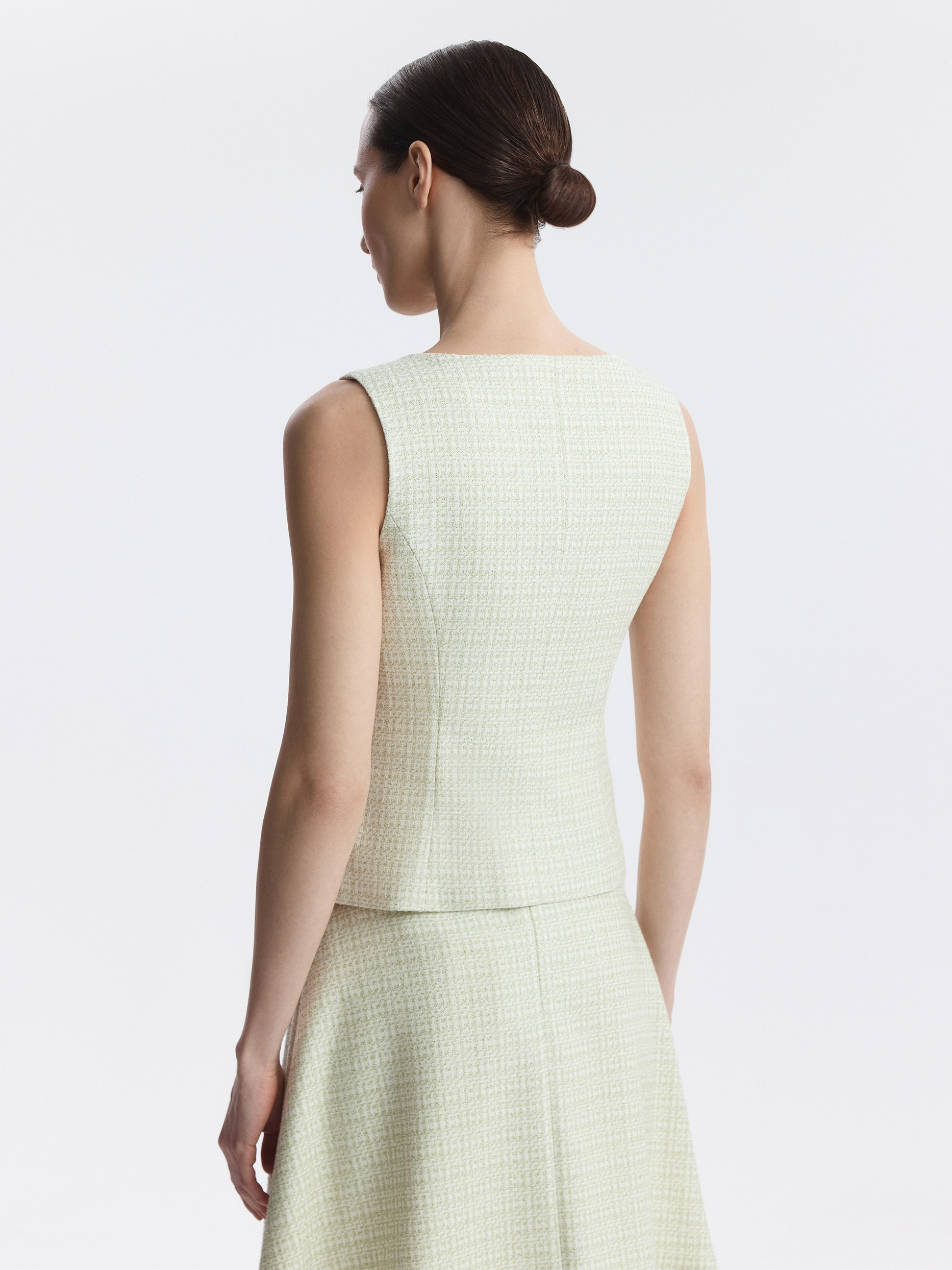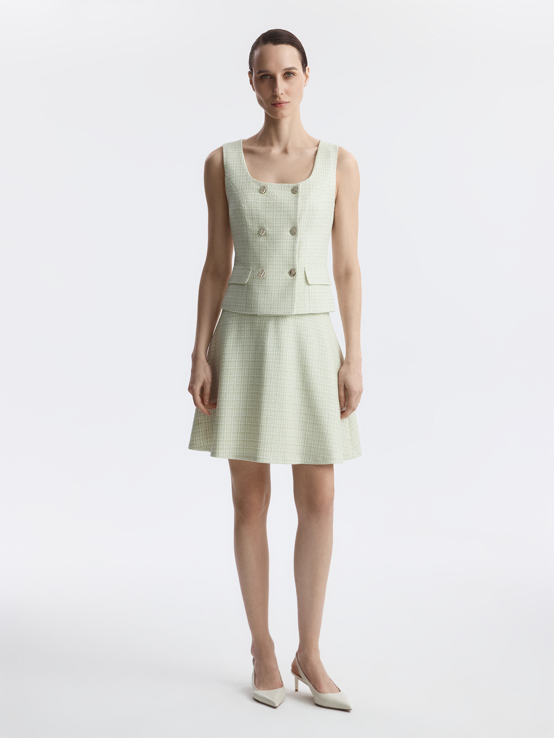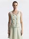 Жилет пастельного оттенка наполнит гардероб весенней нежностью. В меру плотный твидовый текстиль не тянется и не мнется, а гладкая подкладка дарит комфортное прилегание даже без нижнего слоя. В холодное время года жилет можно носить поверх рубашки или водолазки.