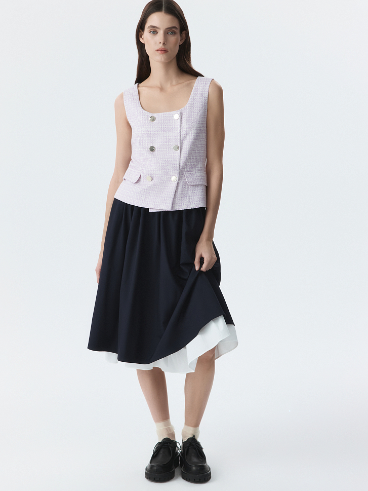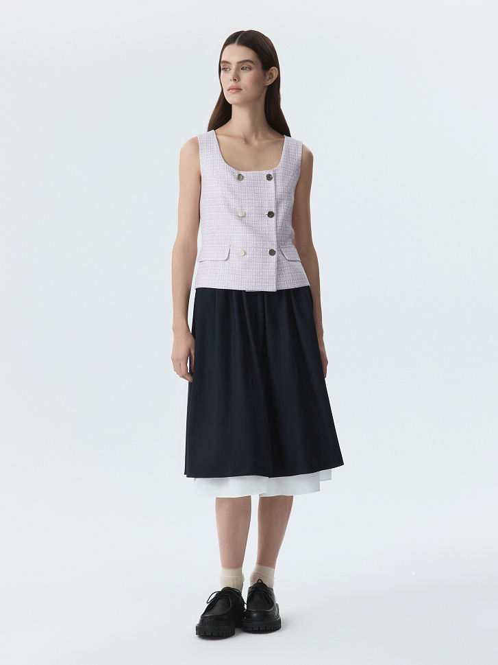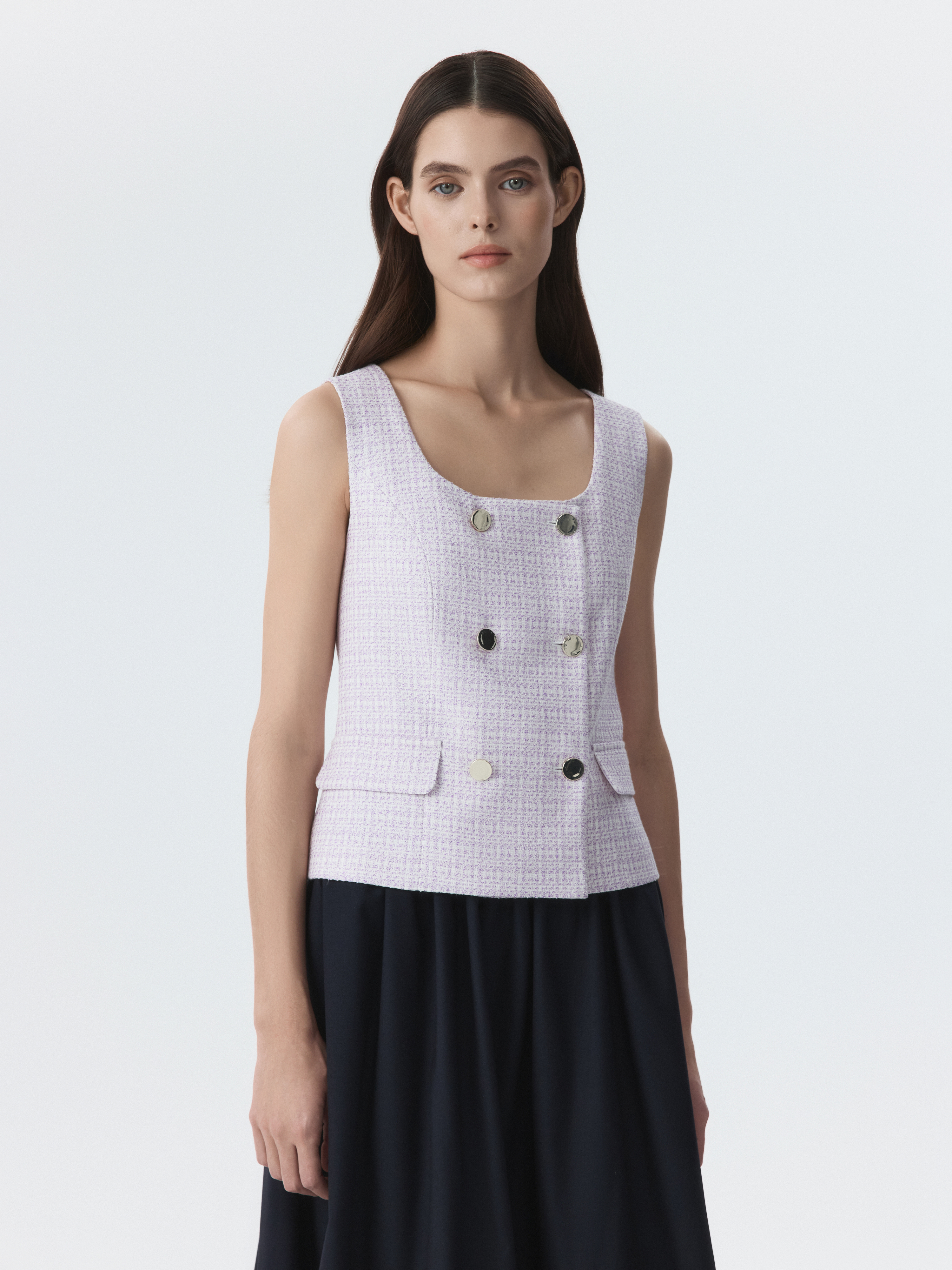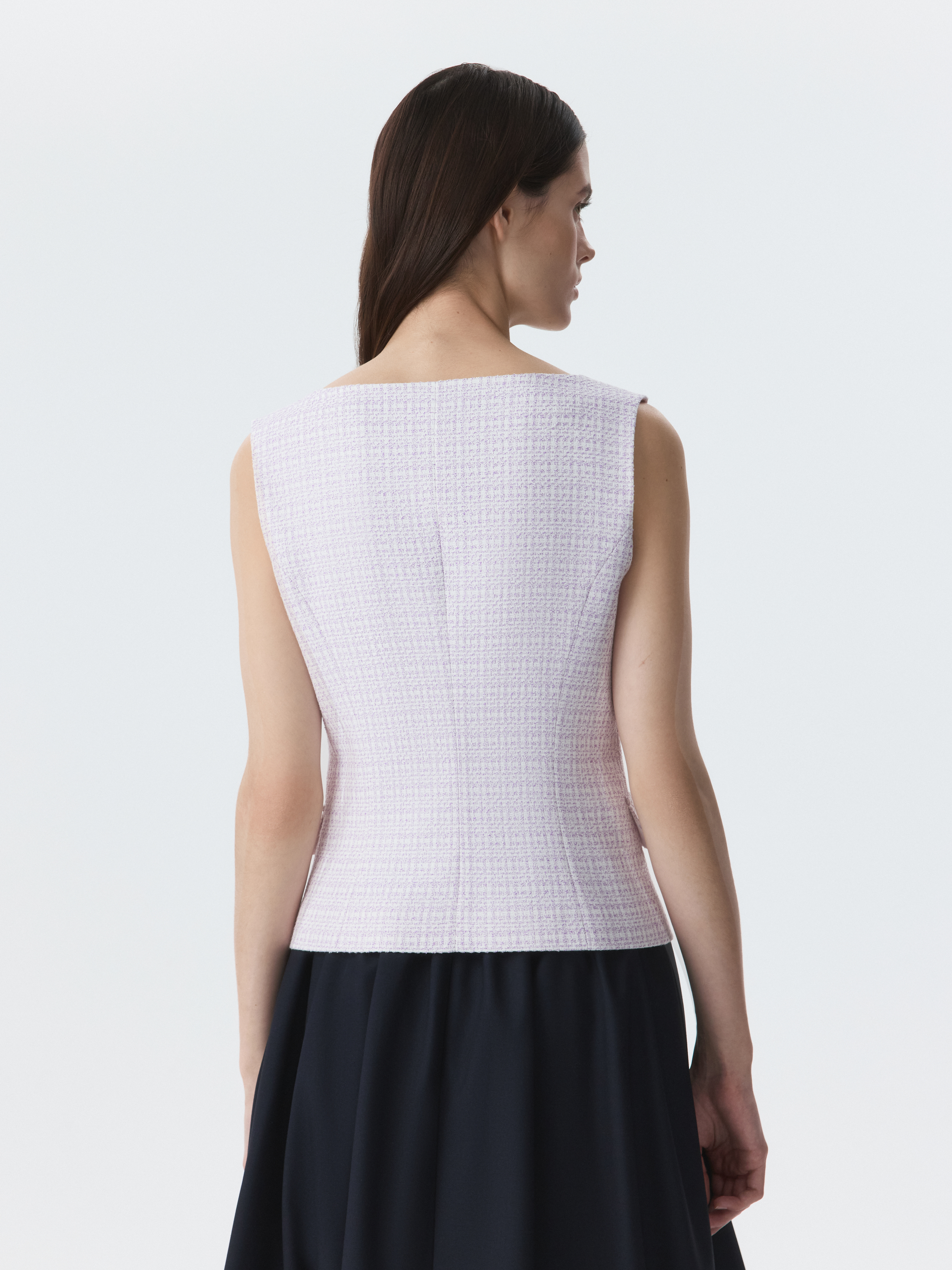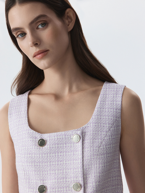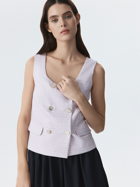 Жилет пастельного оттенка наполнит гардероб весенней нежностью. В меру плотный твидовый текстиль не тянется и не мнется, а гладкая подкладка дарит комфортное прилегание даже без нижнего слоя. В холодное время года жилет можно носить поверх рубашки или водолазки.
