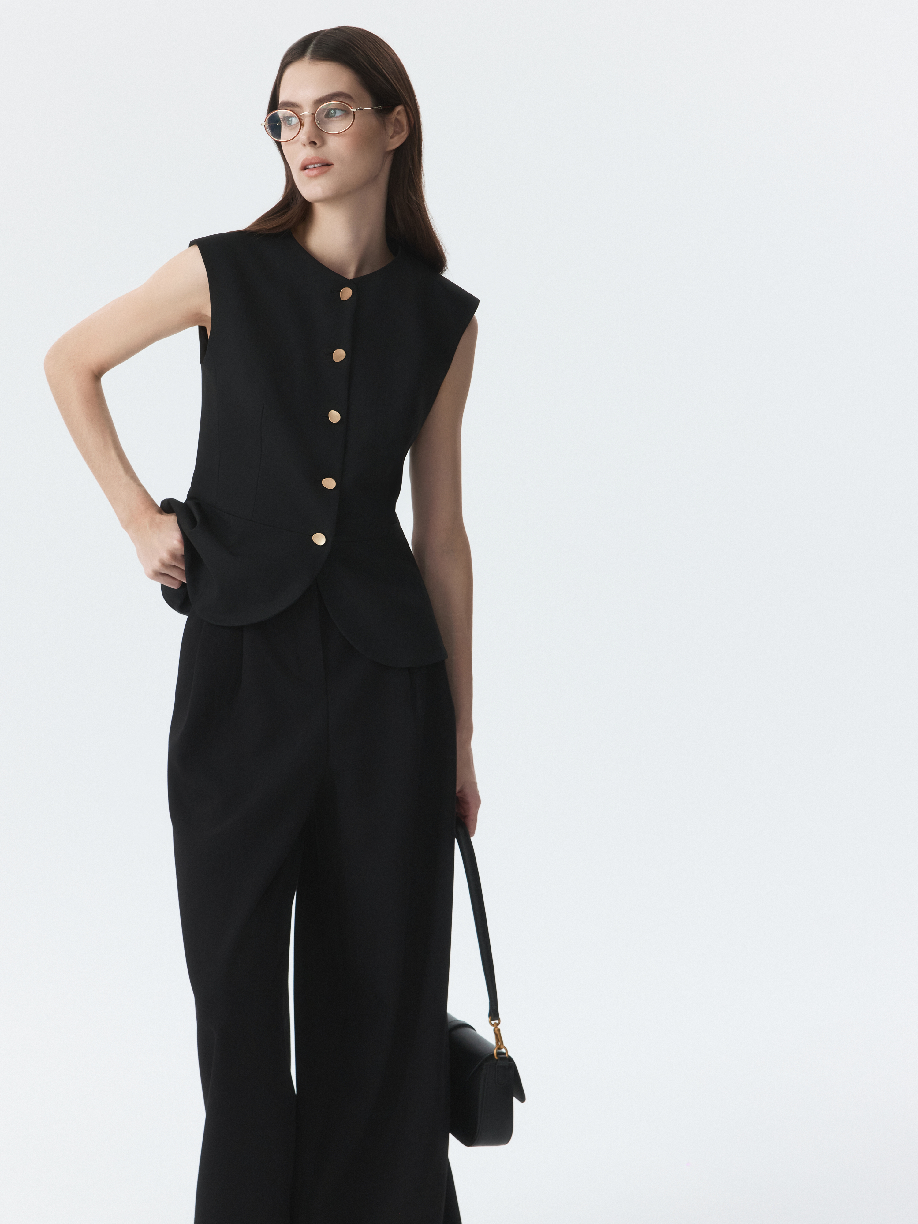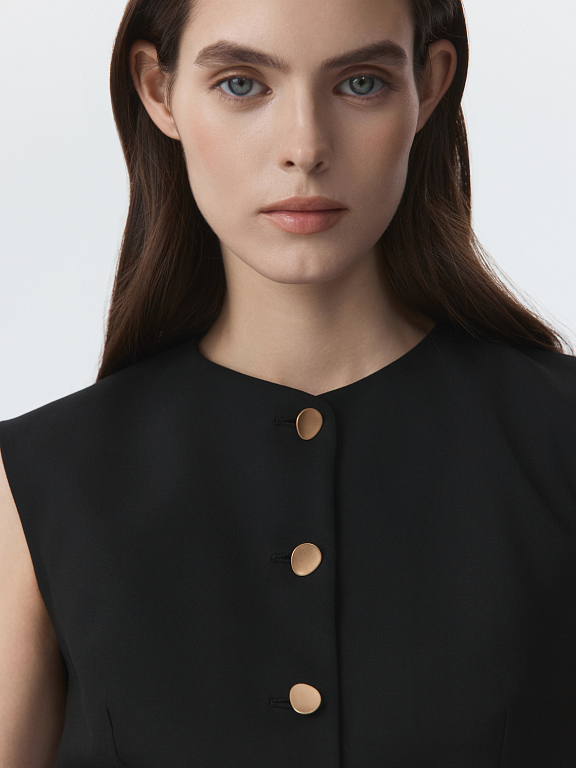 Костюмный жилет – изящная база, который легко поддерживает как классический, так и повседневный образ. Плотный текстиль из поливискозы не тянется и не мнется. Приталенный крой подчеркивает линию фигуры, а эффектные пуговицы играют роль акцентов.