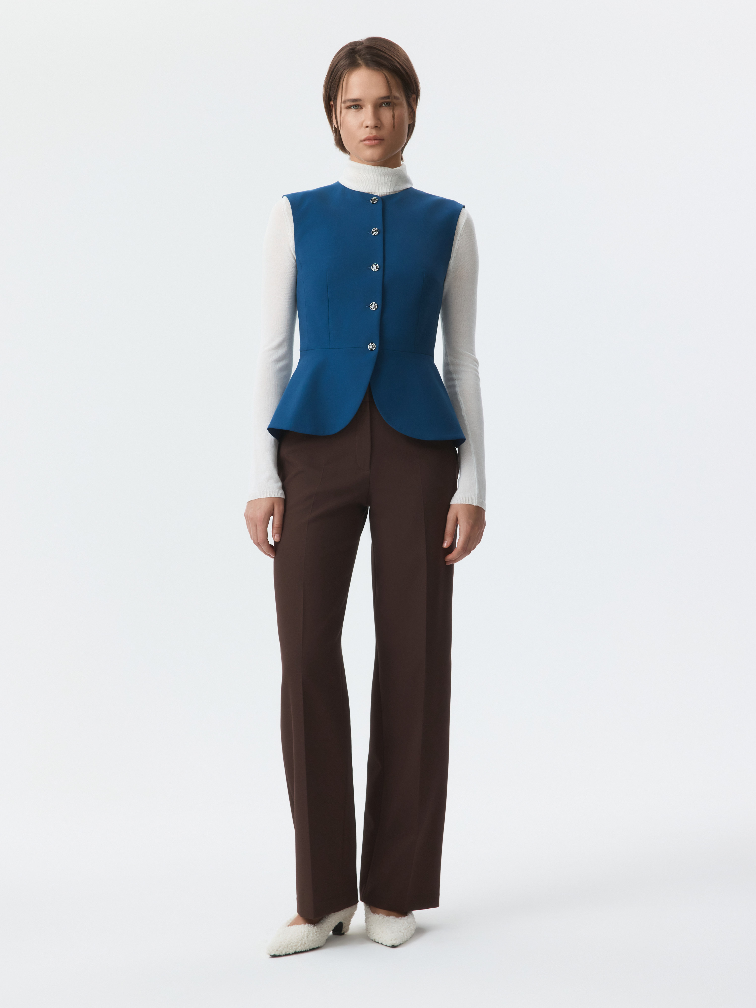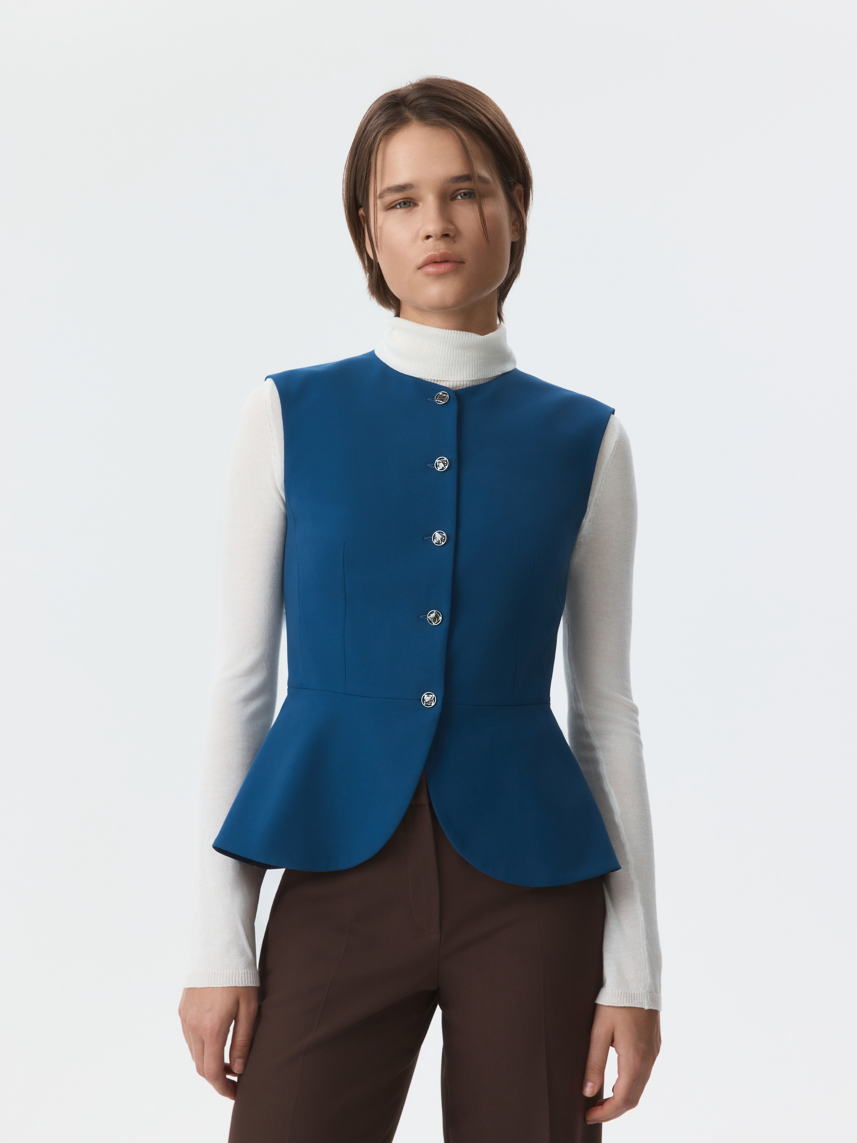 Приталенный жилет с баской – классический крой с женственным характером. В меру плотный костюмный текстиль из поливискозы не тянется и не требует особого ухода, а благодаря гладкой подкладке комфортно прилегает к телу. Для большего тепла снизу можно добавить водолазку.