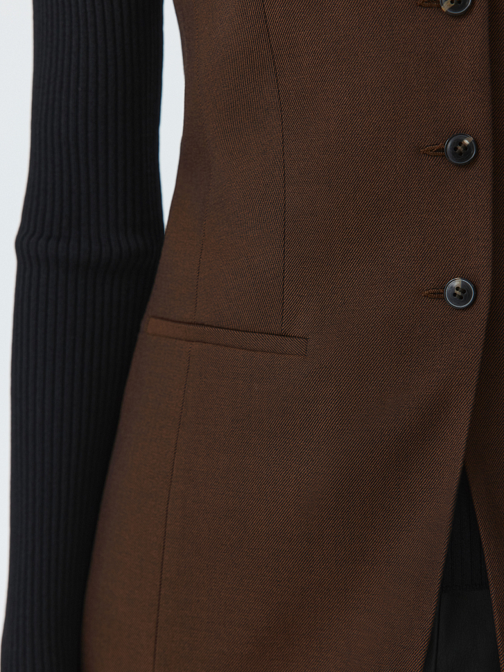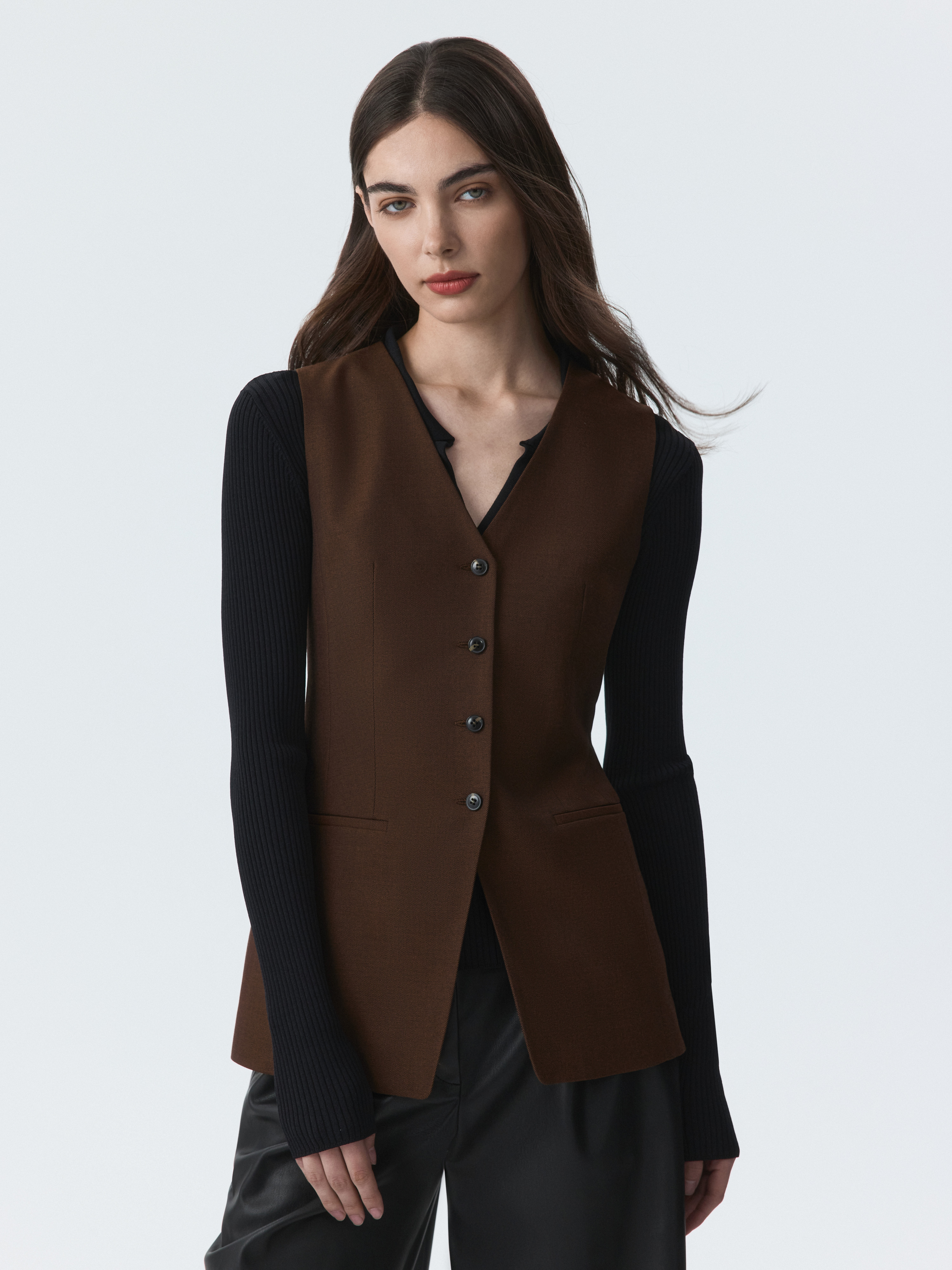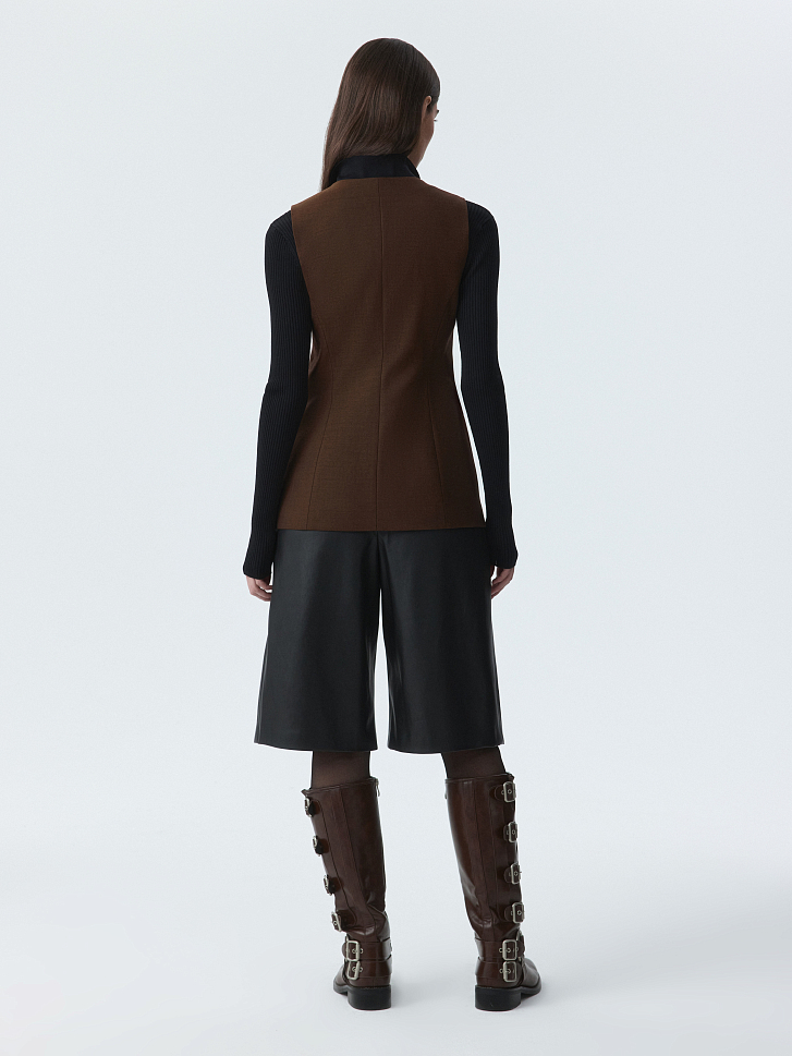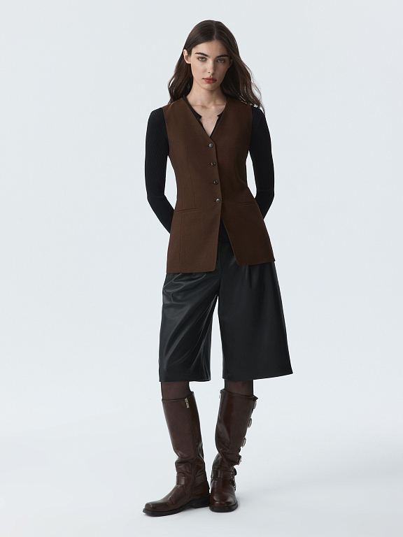 Костюмный жилет – классика на каждый день. В меру плотный текстиль из поливискозы не тянется и не требует особого ухода, а благодаря гладкой подкладке комфортно прилегает к телу даже без нижнего слоя. Дополните образ юбкой или брюками из аналогичного материала.