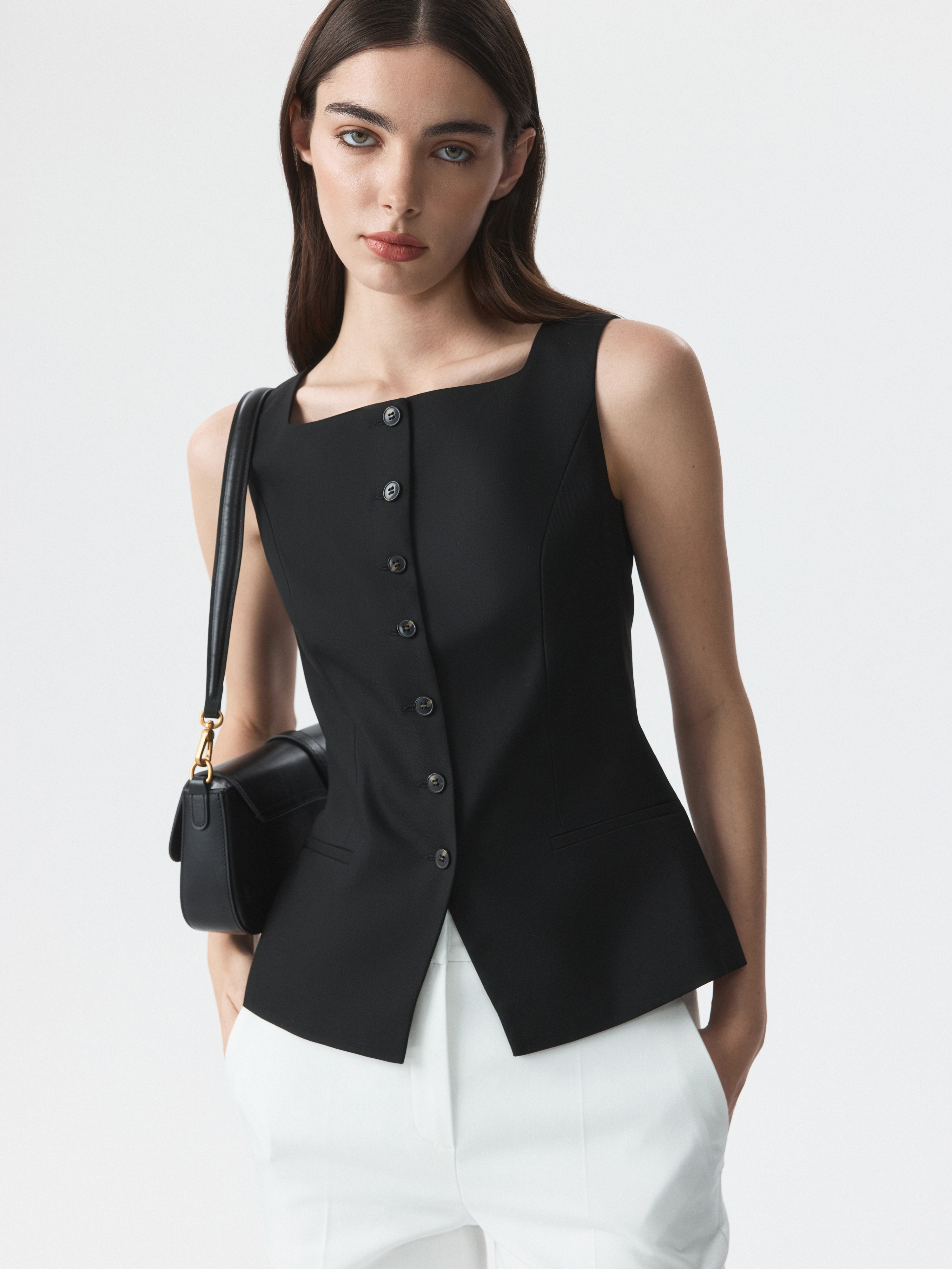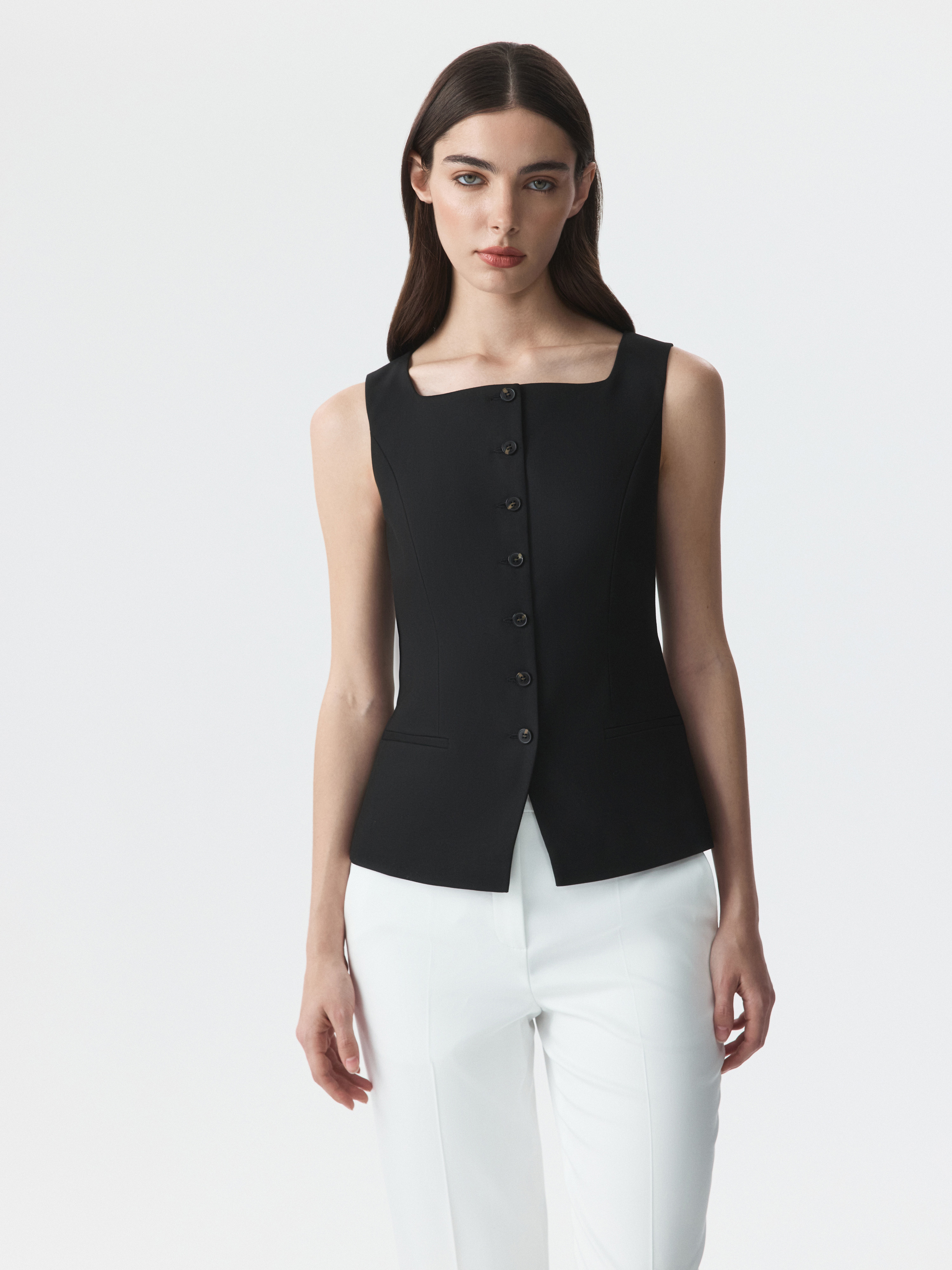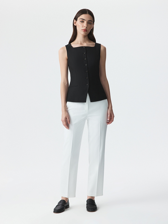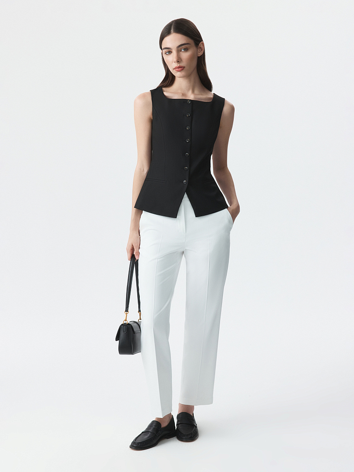 Костюмный жилет с квадратным вырезом легко подстраивается под планы на день. Плотный текстиль из поливискозы не тянется и не мнется, а подкладка дарит комфортное прилегание.