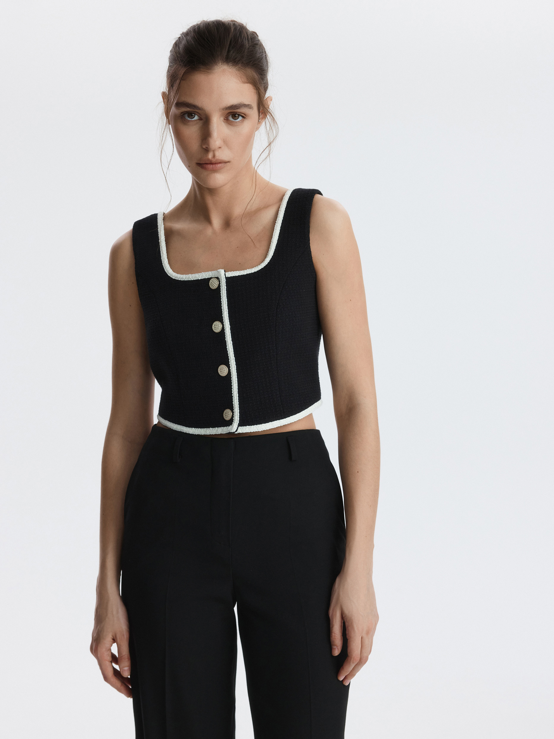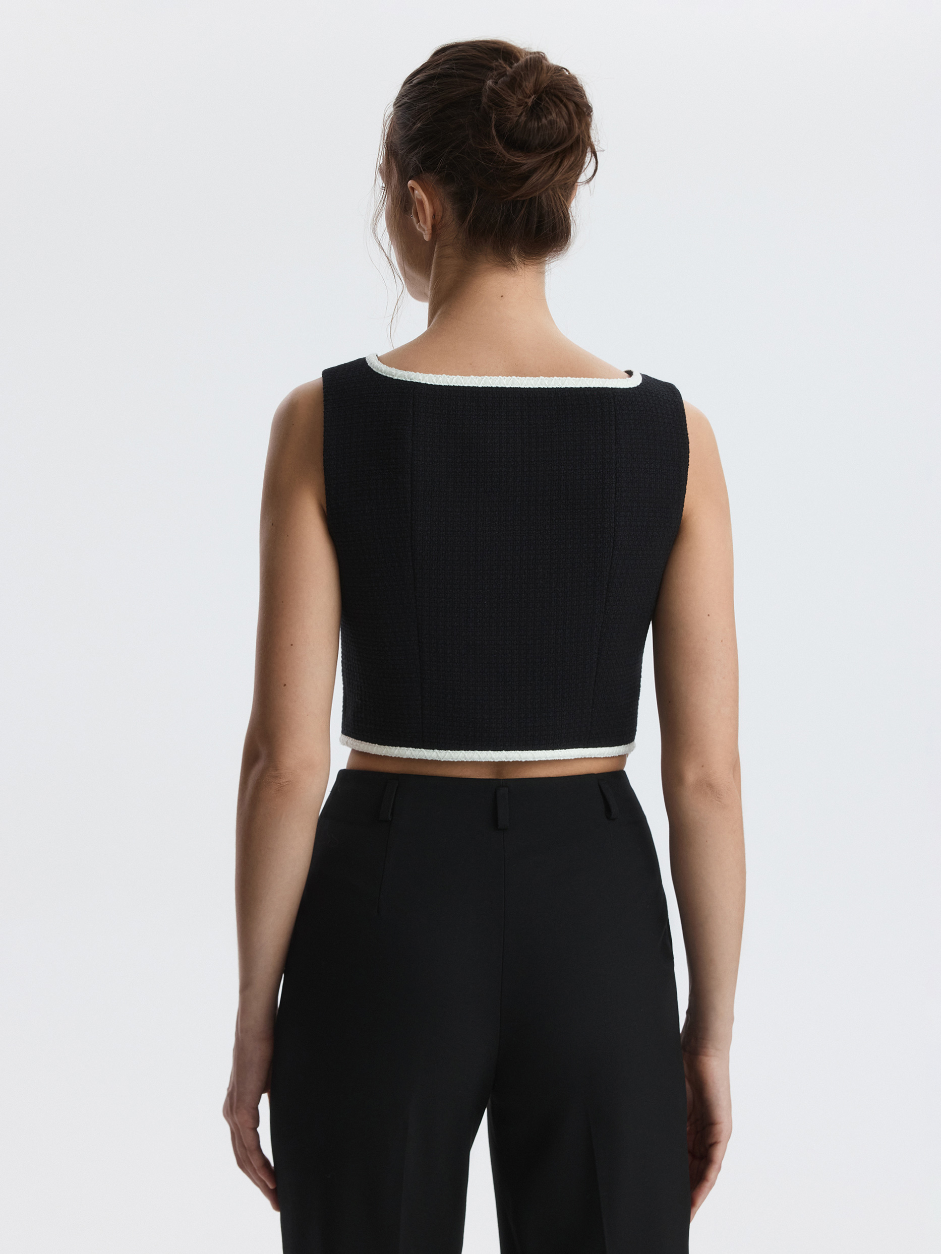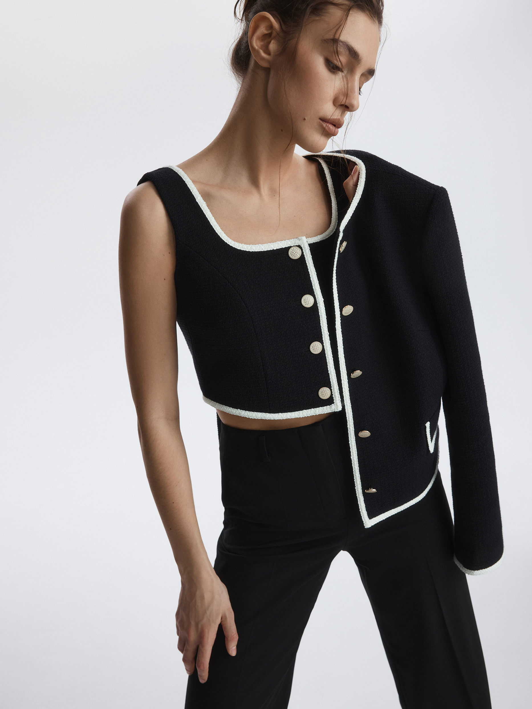 Твидовый жилет с окантовкой добавит в образы что-то особенное. Плотный текстиль на основе хлопка не тянется и комфортно прилегает благодаря гладкой подкладке. Рекомендуем несколько вариантов стилевых решений: носите жилет в качестве топа, в комплекте костюма-тройки или поверх водолазки.