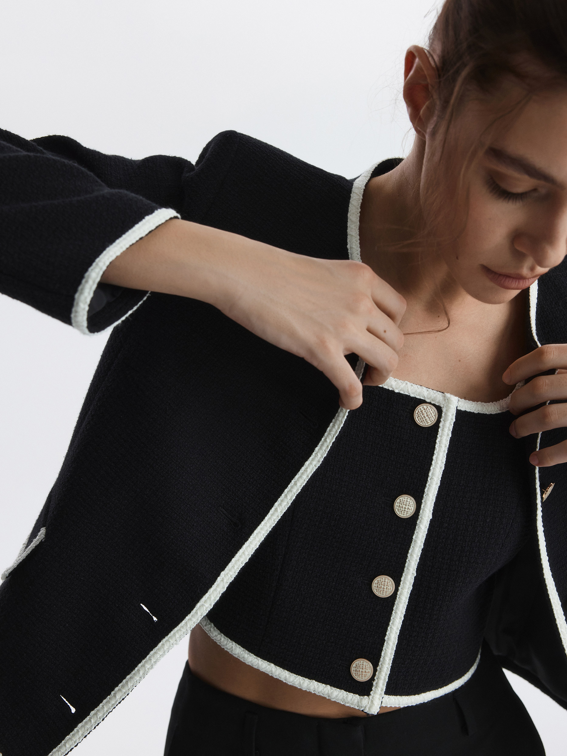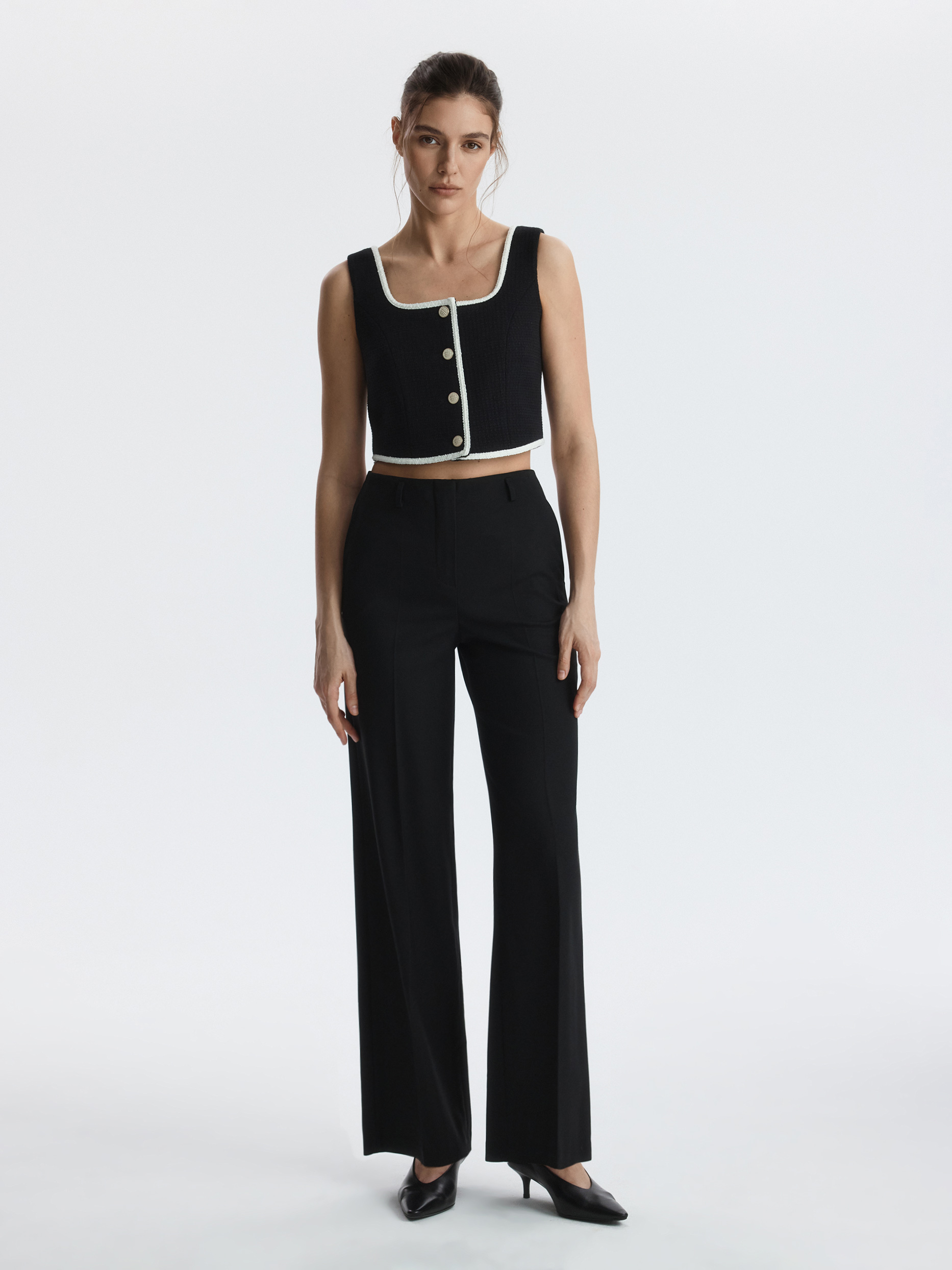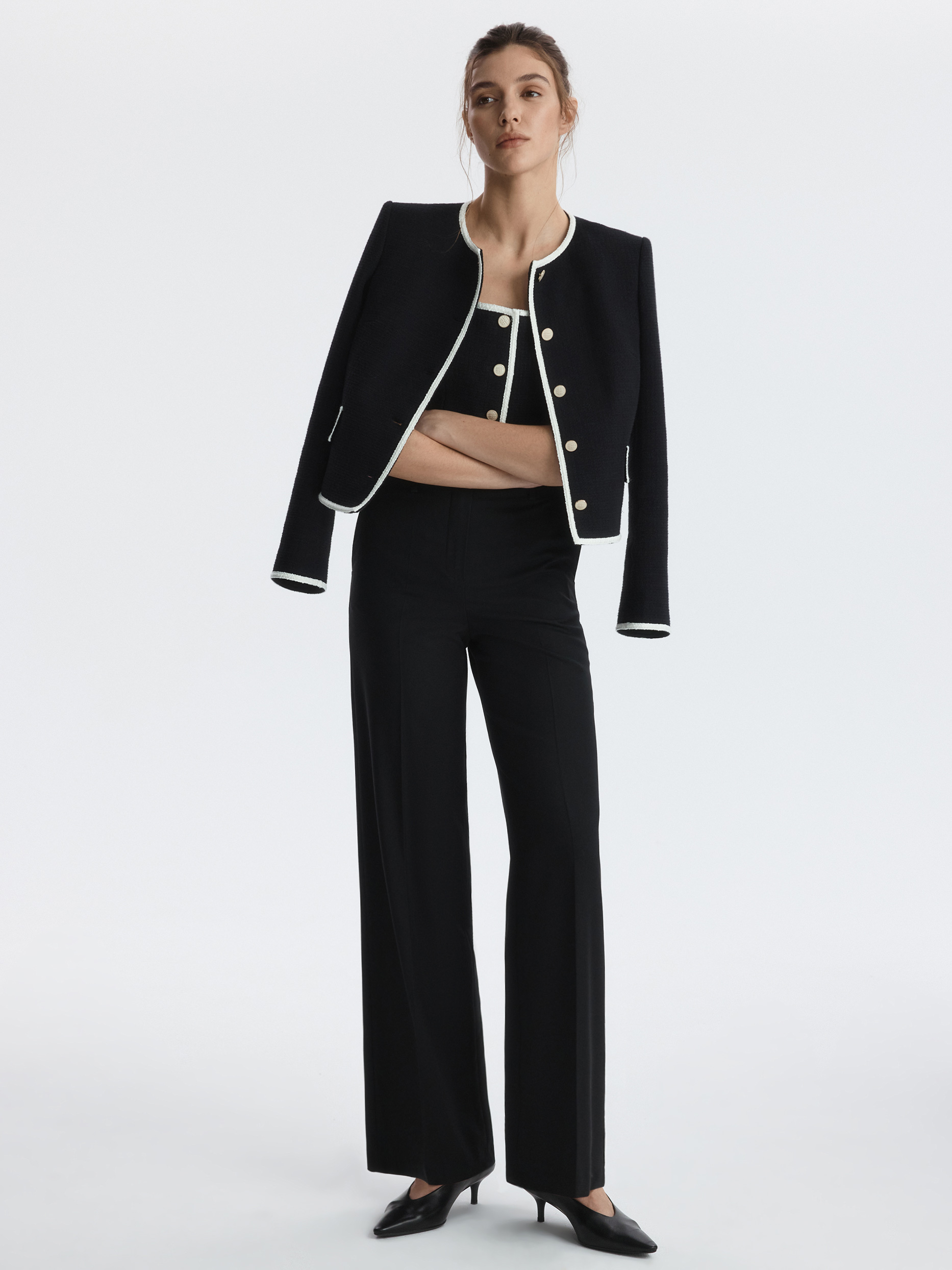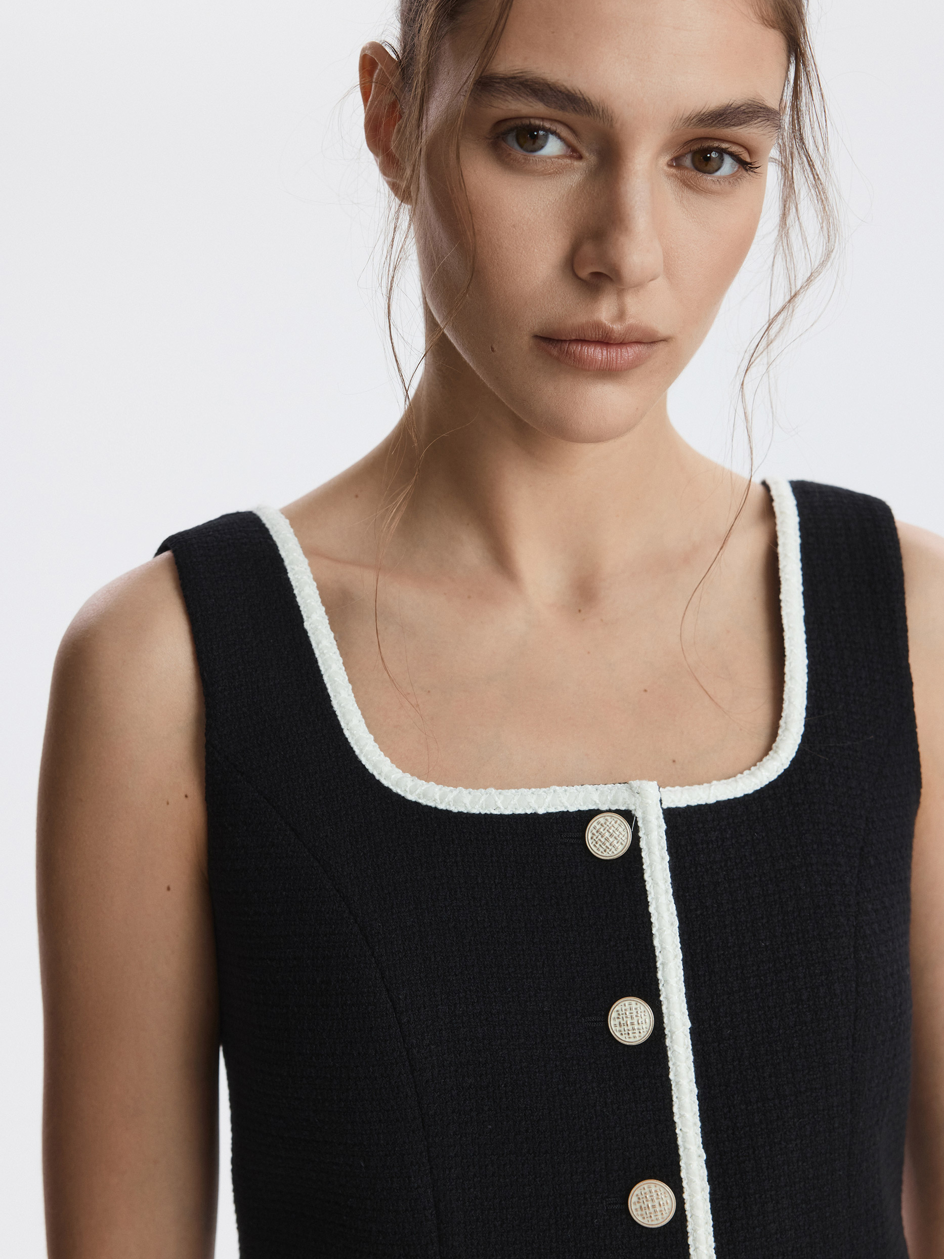 Твидовый жилет с окантовкой добавит в образы что-то особенное. Плотный текстиль на основе хлопка не тянется и комфортно прилегает благодаря гладкой подкладке. Рекомендуем несколько вариантов стилевых решений: носите жилет в качестве топа, в комплекте костюма-тройки или поверх водолазки.