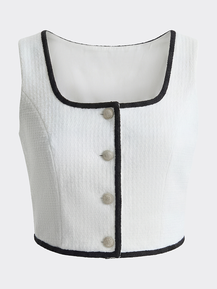 Твидовый жилет с окантовкой добавит в образы что-то особенное. Плотный текстиль на основе хлопка не тянется и комфортно прилегает благодаря гладкой подкладке. Рекомендуем несколько вариантов стилевых решений: носите жилет в качестве топа, в комплекте костюма-тройки или поверх водолазки.