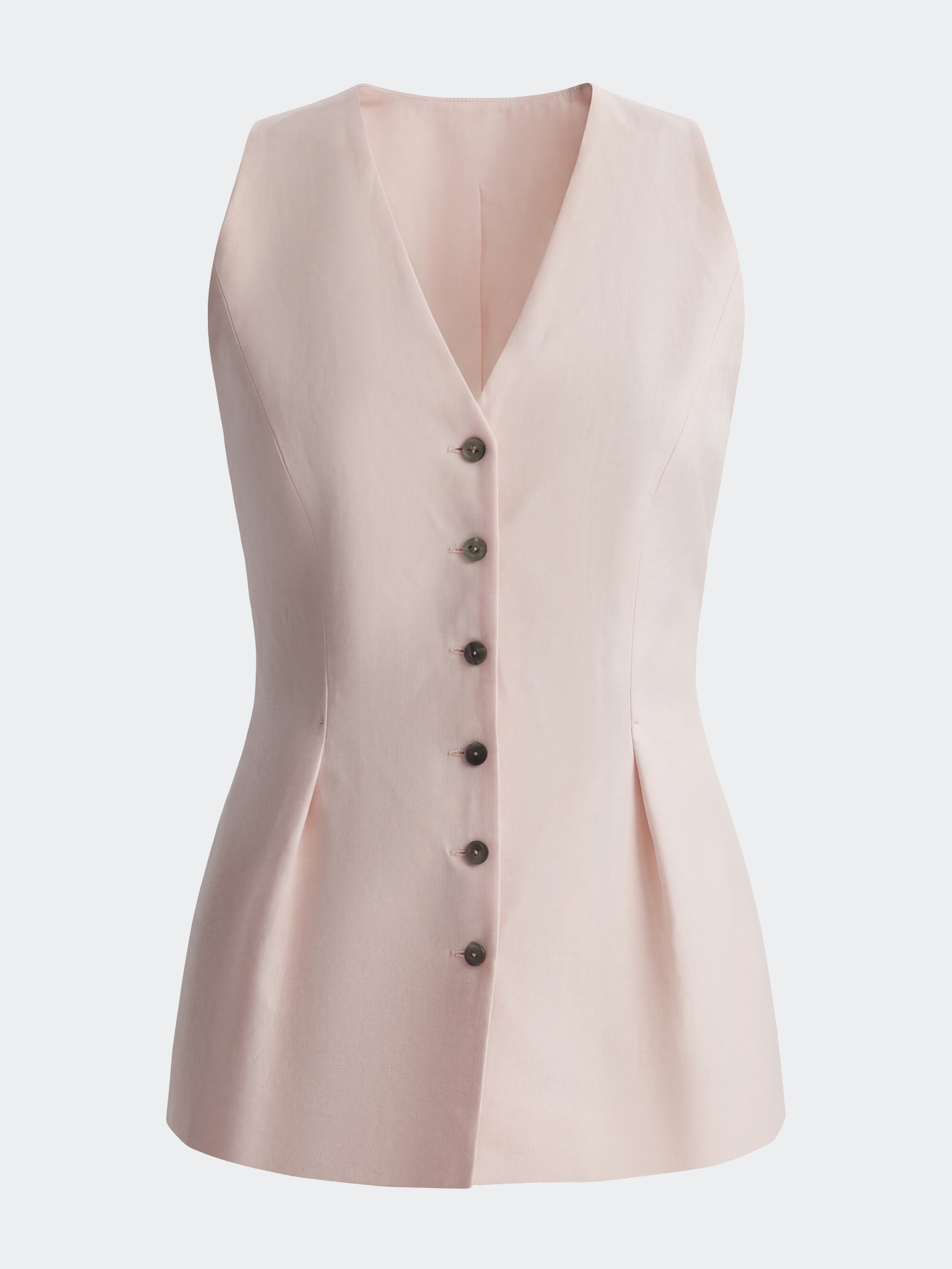 Жилет с эффектом баски идеален как для многослойных образов, так и для самостоятельного ношения в теплый сезон. Льняная ткань средней плотности обеспечивает хорошую воздухопроницаемость, а хлопковая подкладка приятно прилегает к телу.
