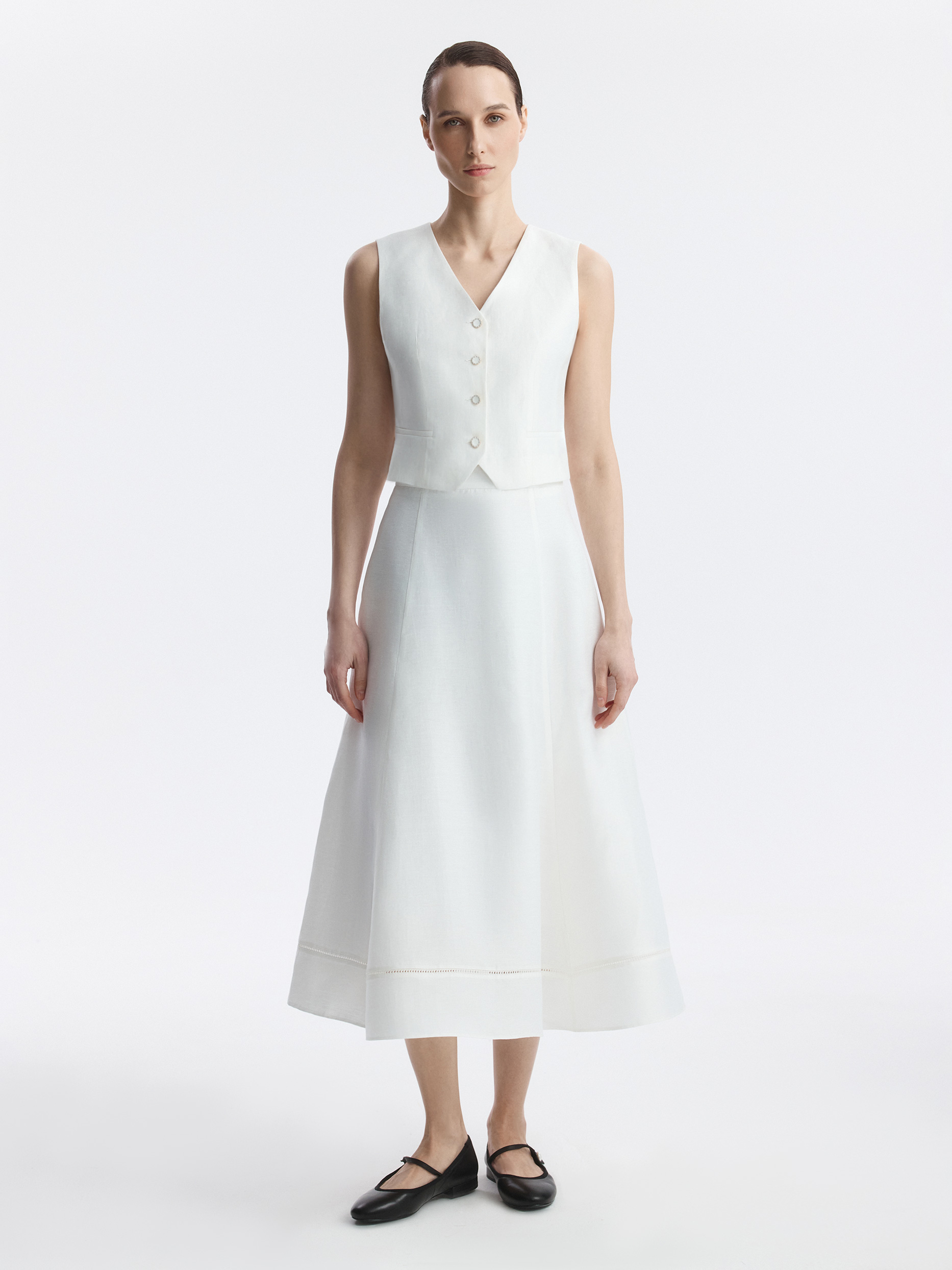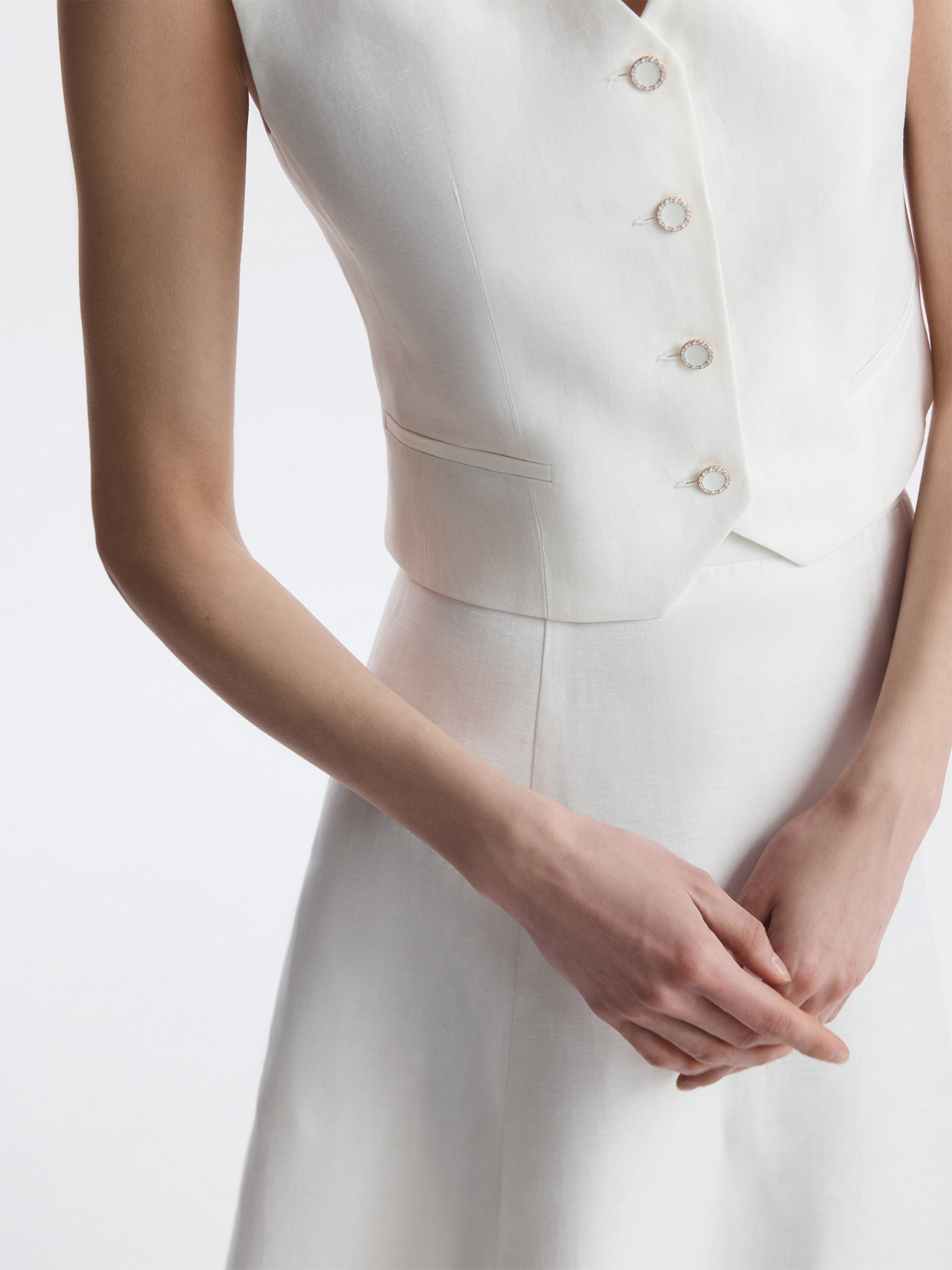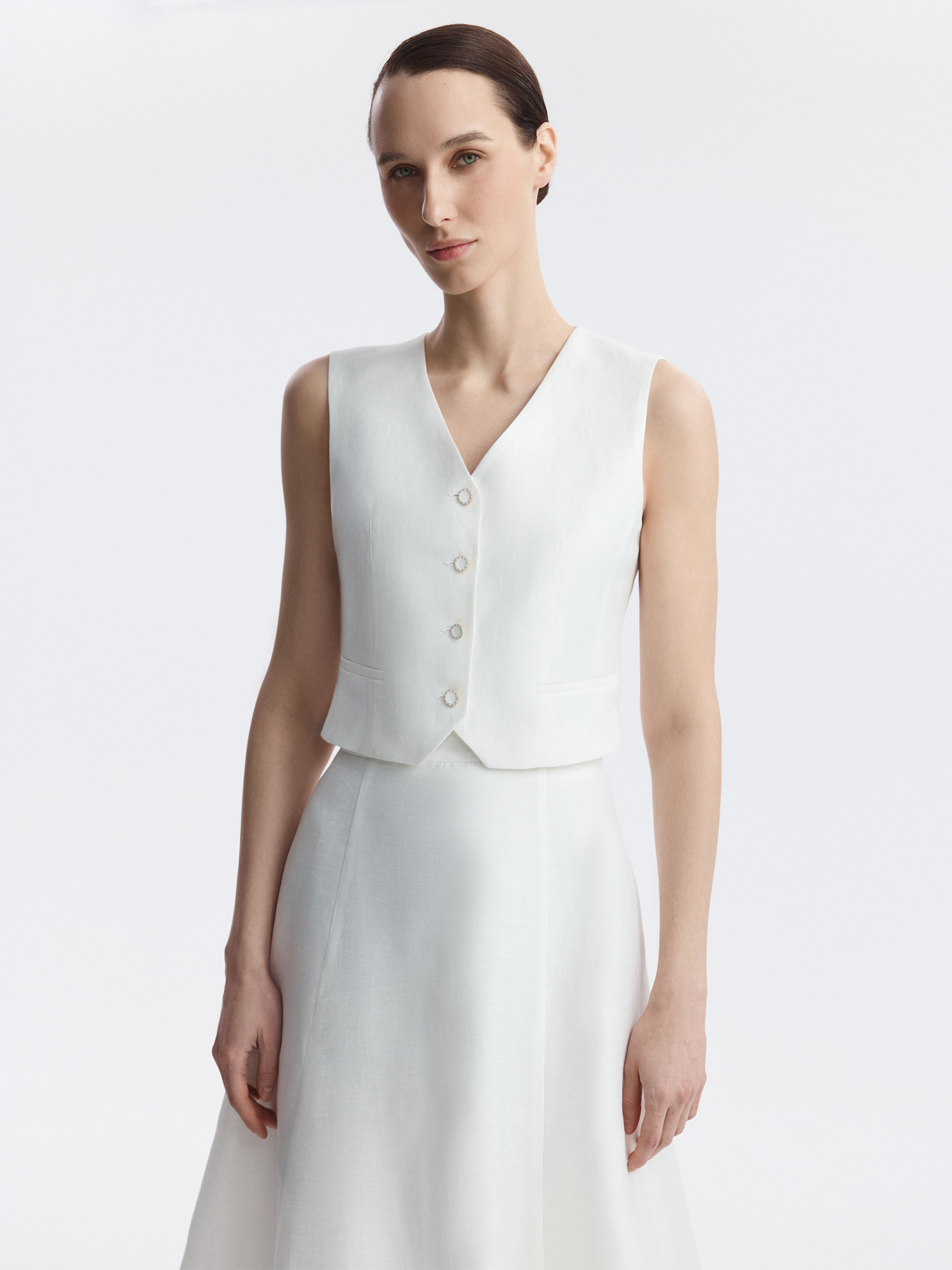 Костюмный жилет подчеркивает талию и делает силуэт более утонченным. В меру плотный текстиль на основе льна не тянется и обладает износоустойчивостью, а хлопковая подкладка дарит комфортное прилегание. Эмалированные пуговицы придают выразительности.