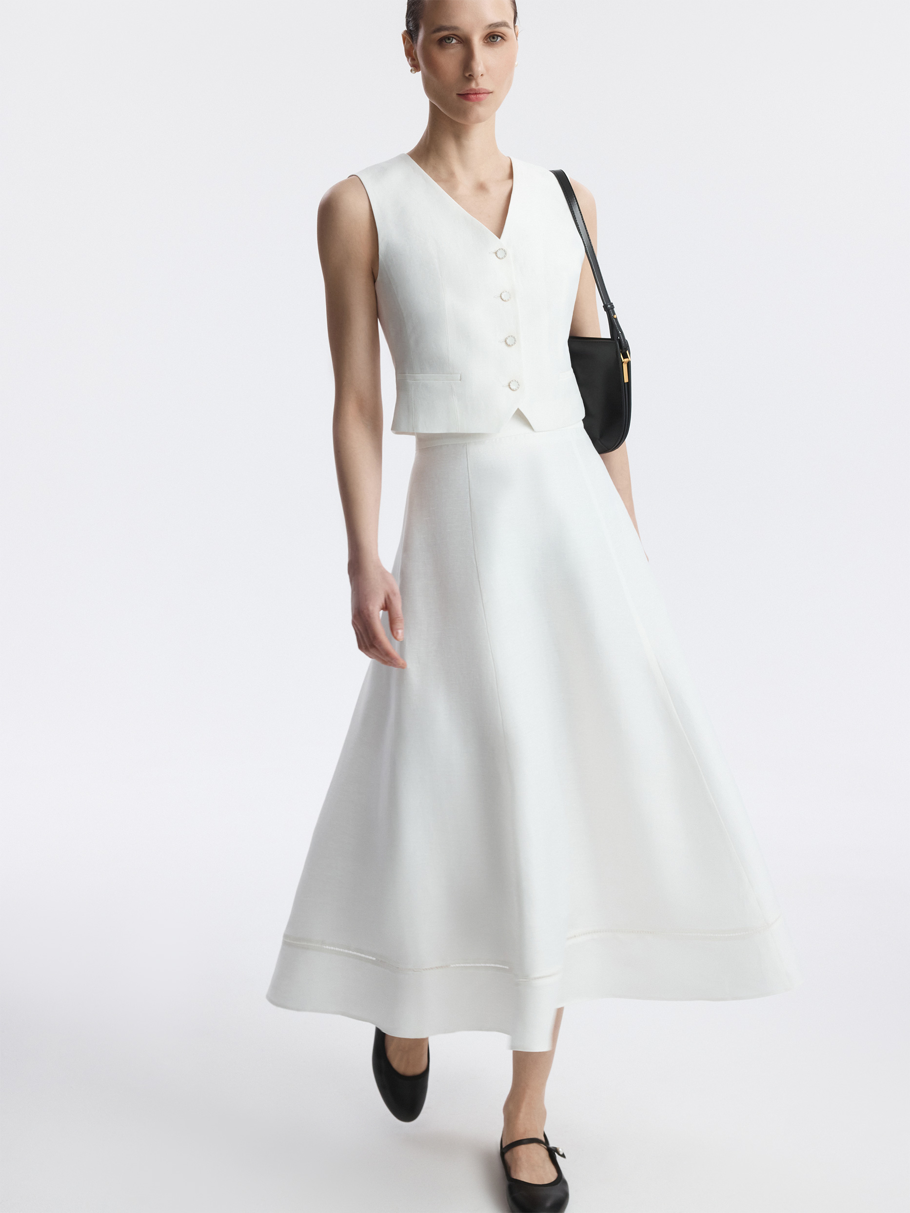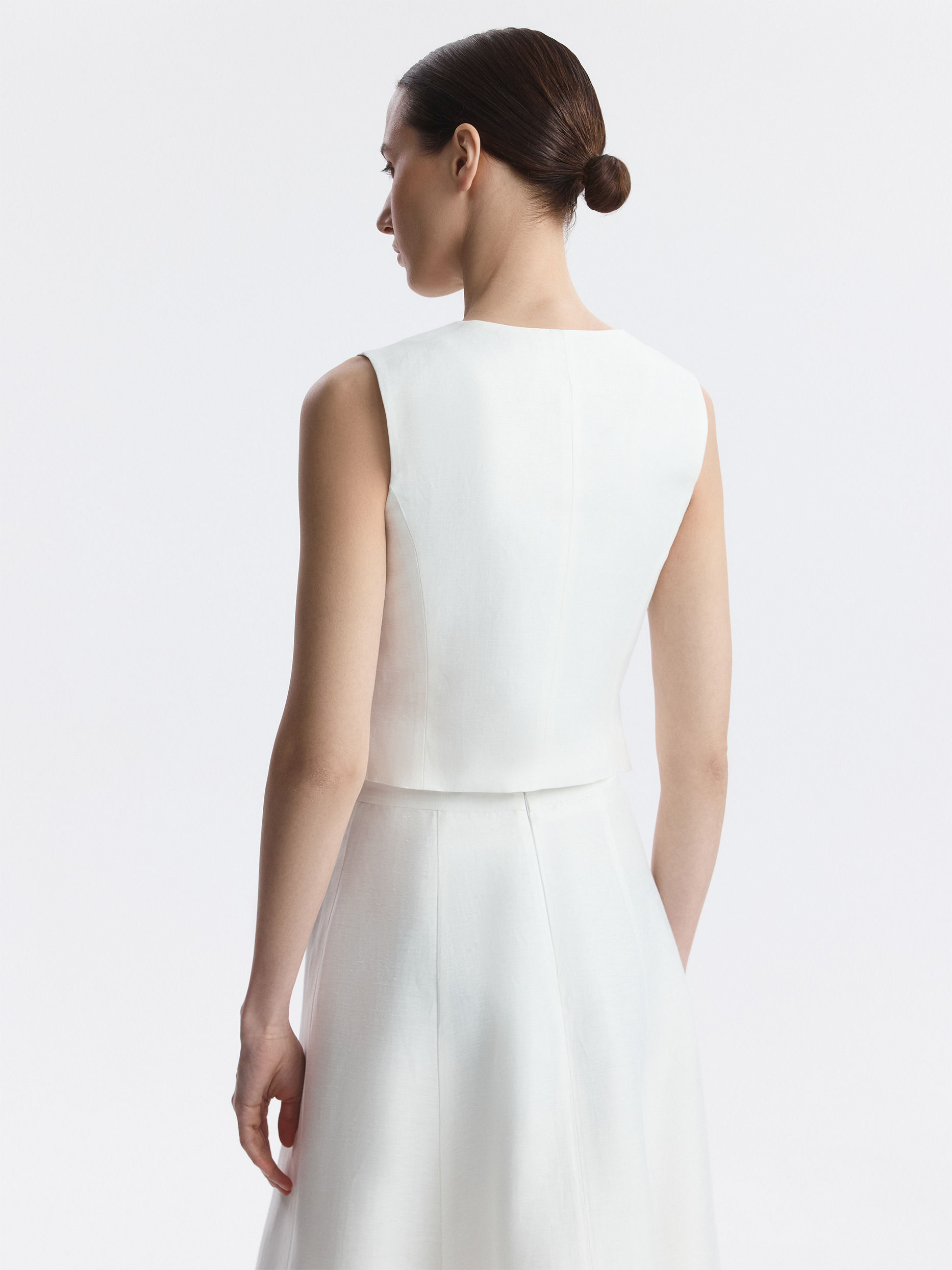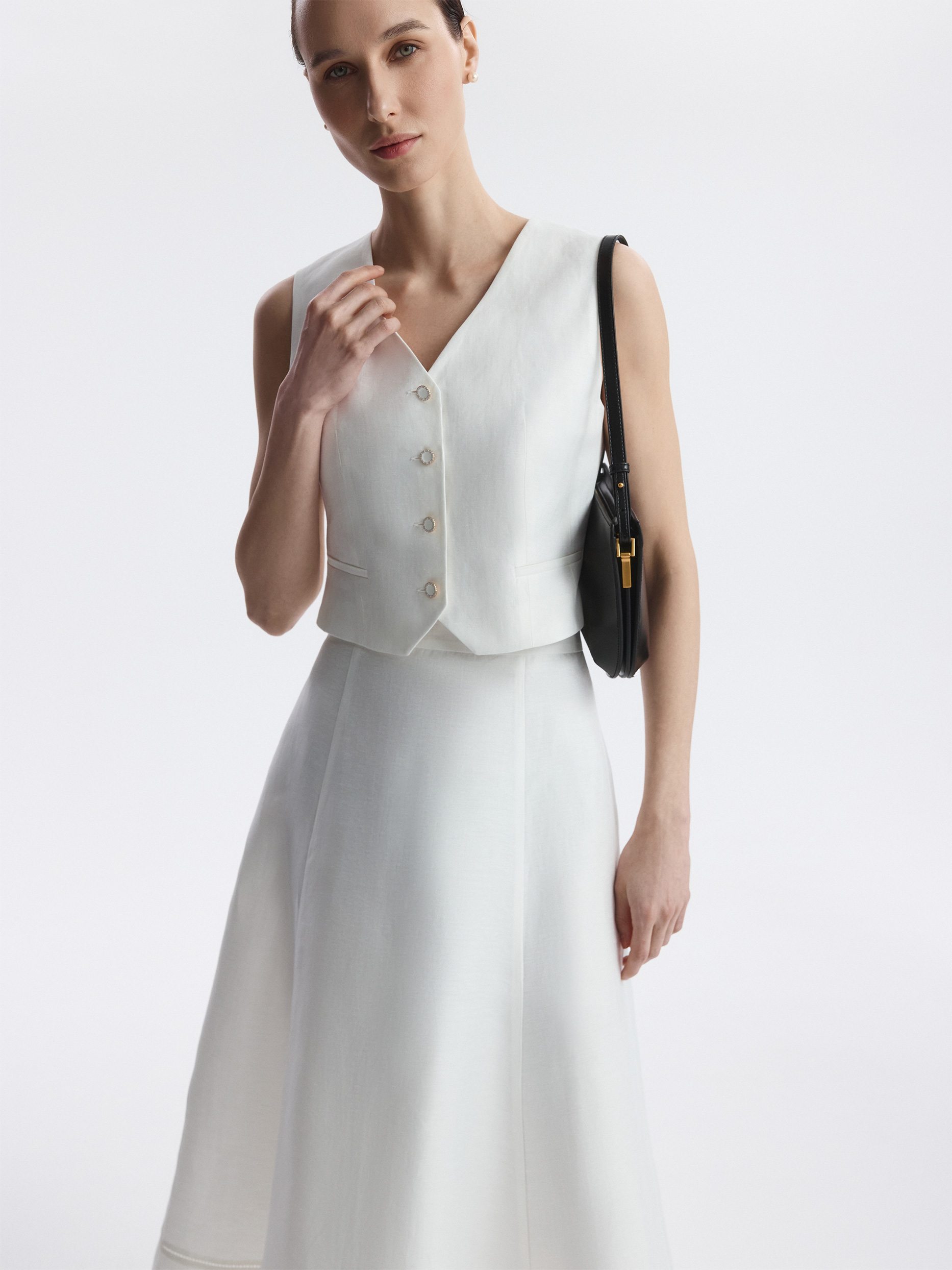 Костюмный жилет подчеркивает талию и делает силуэт более утонченным. В меру плотный текстиль на основе льна не тянется и обладает износоустойчивостью, а хлопковая подкладка дарит комфортное прилегание. Эмалированные пуговицы придают выразительности.