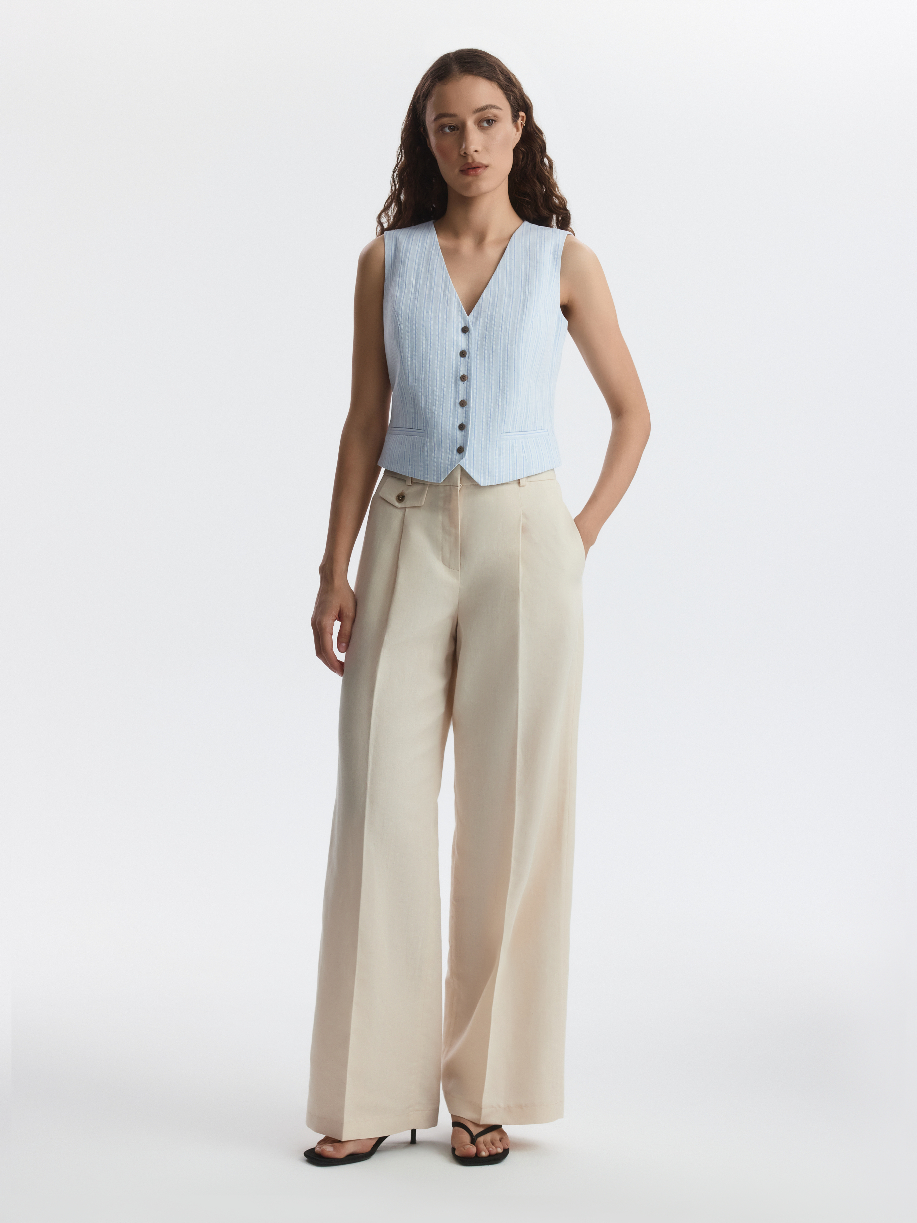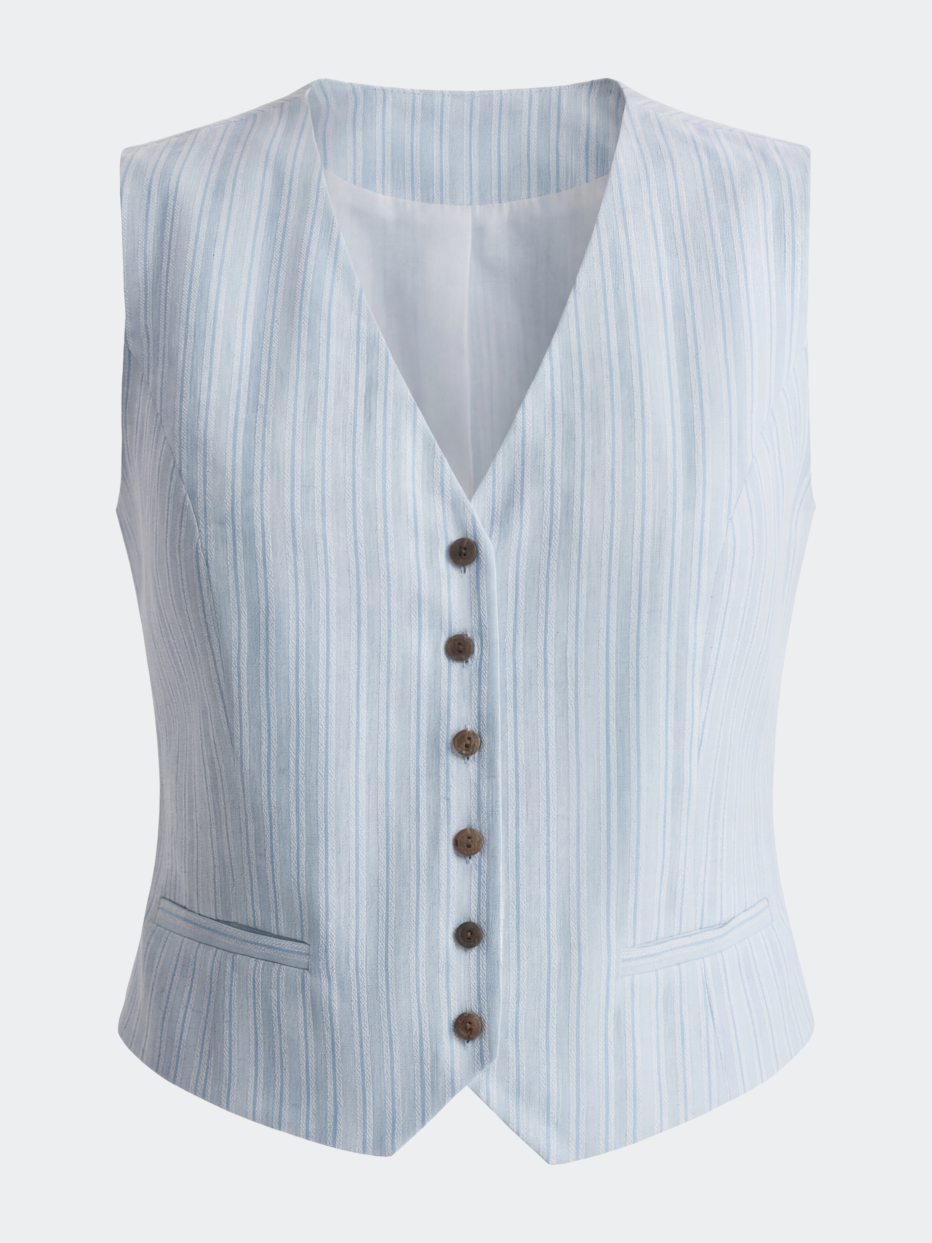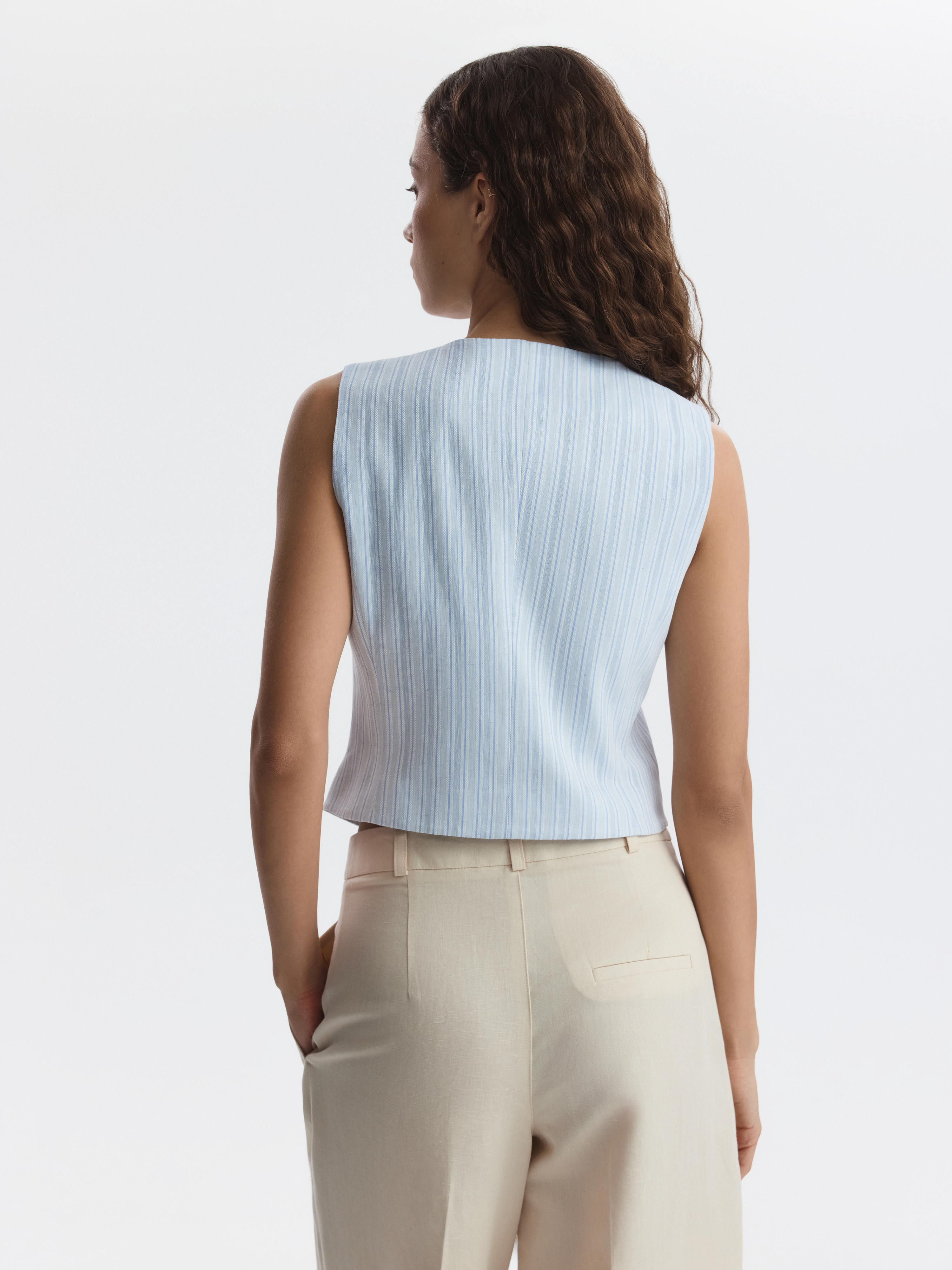 Приталенный жилет создан для тех, кто ценит комфорт и легкость в жаркие дни. В меру плотный смесовый текстиль из хлопка и льна в жаккардовую полоску хорошо пропускает воздух и мягко прилегает благодаря хлопковой подкладке. Для идеального образа стилизуйте с изделиями из денима.