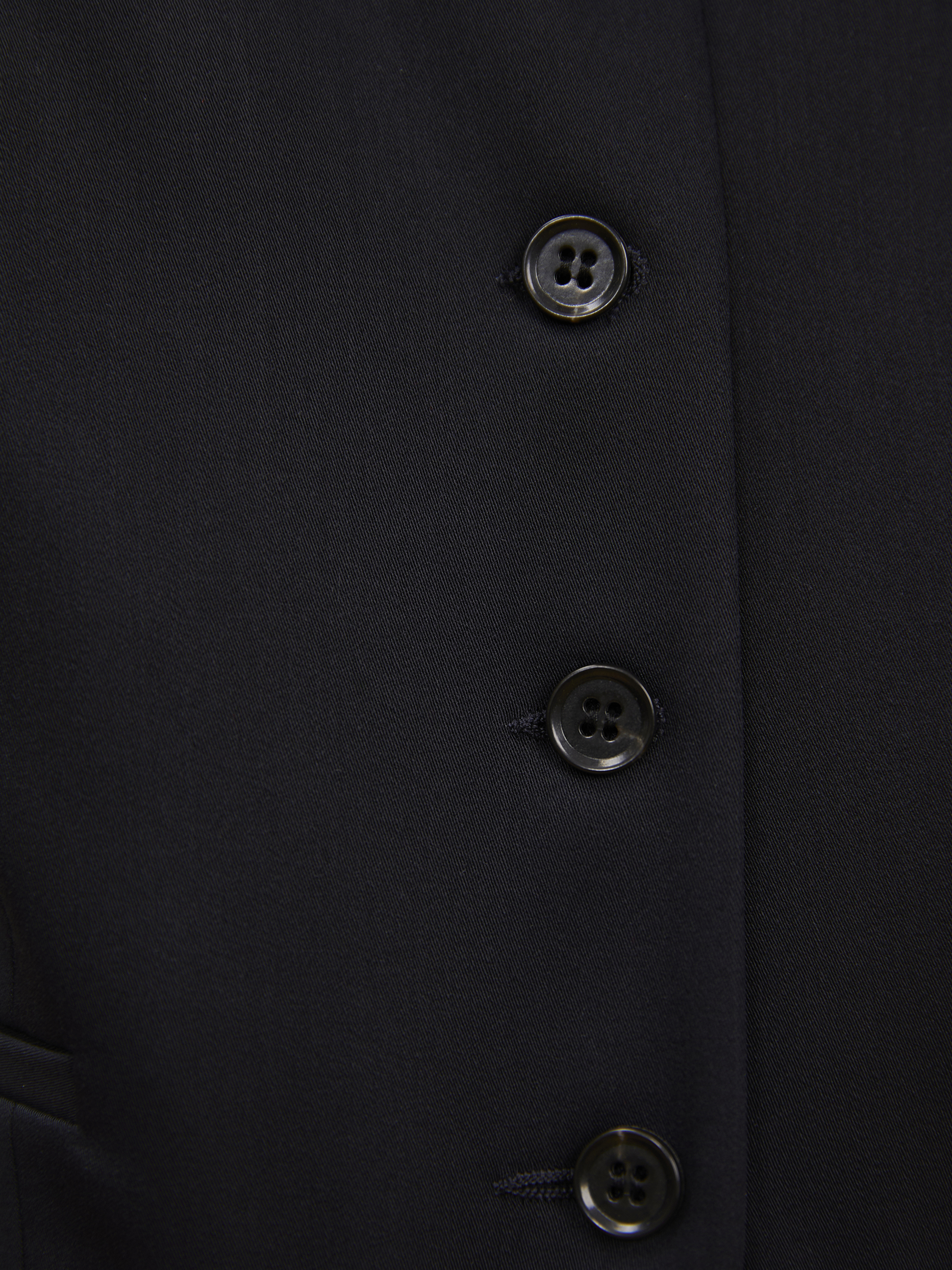 Укороченный жилет приталенного кроя выполнили из плотного костюмного текстиля, который не тянется и сидит по фигуре. Такой акцентный жилет прекрасно дополнит повседневные образы, освежая их: в классическом варианте надевается под пиджак, или носите его поверх рубашки.