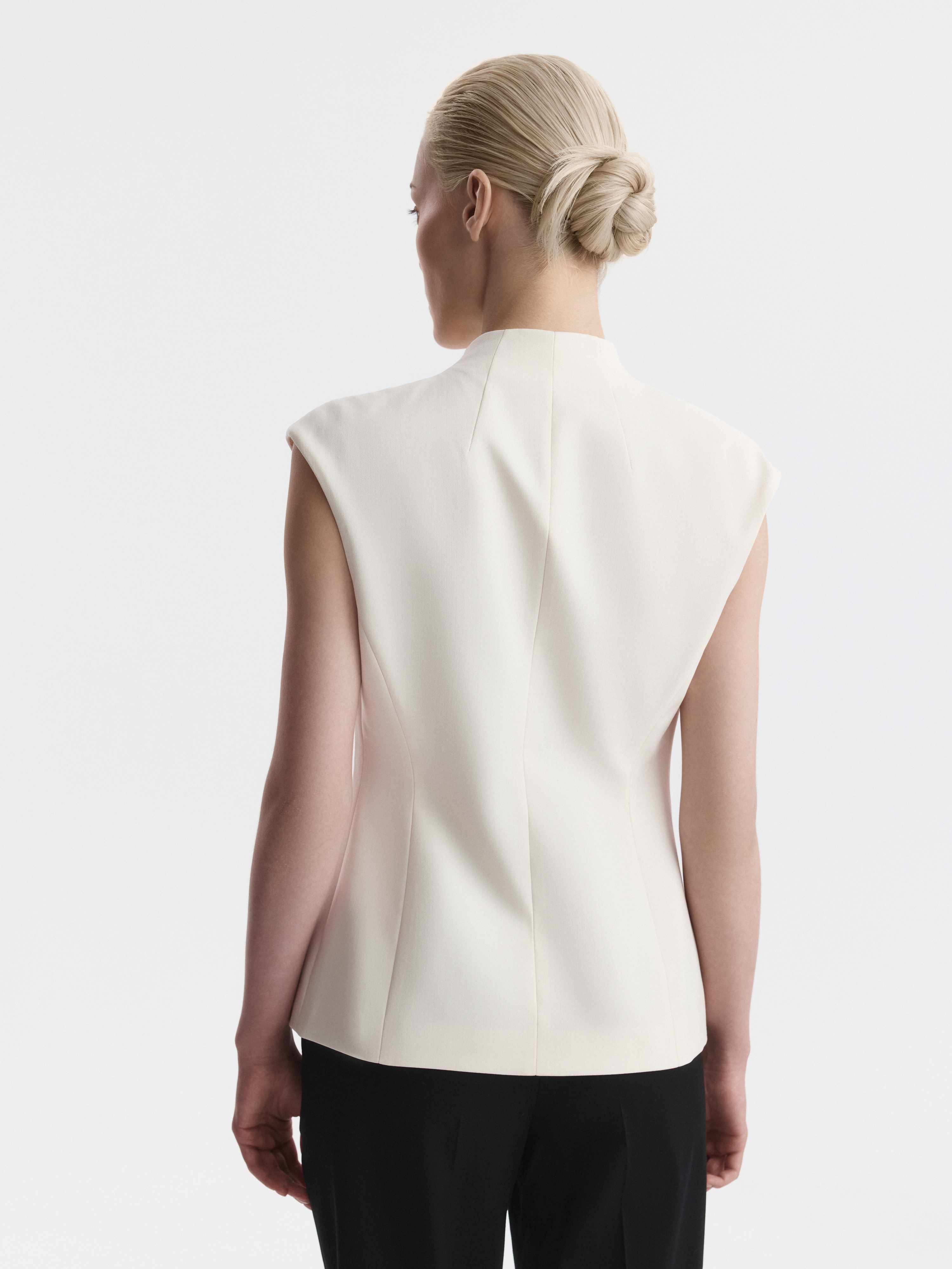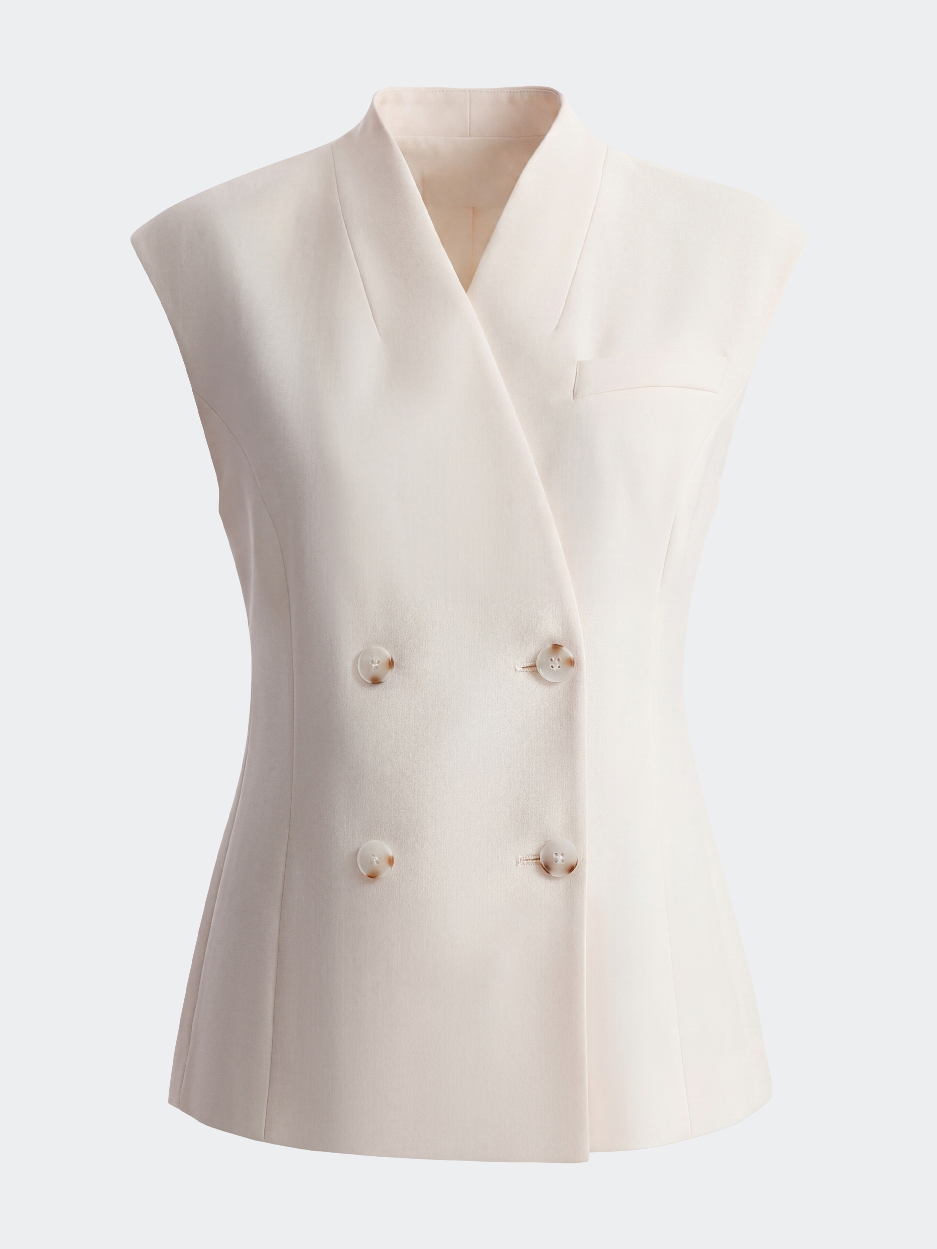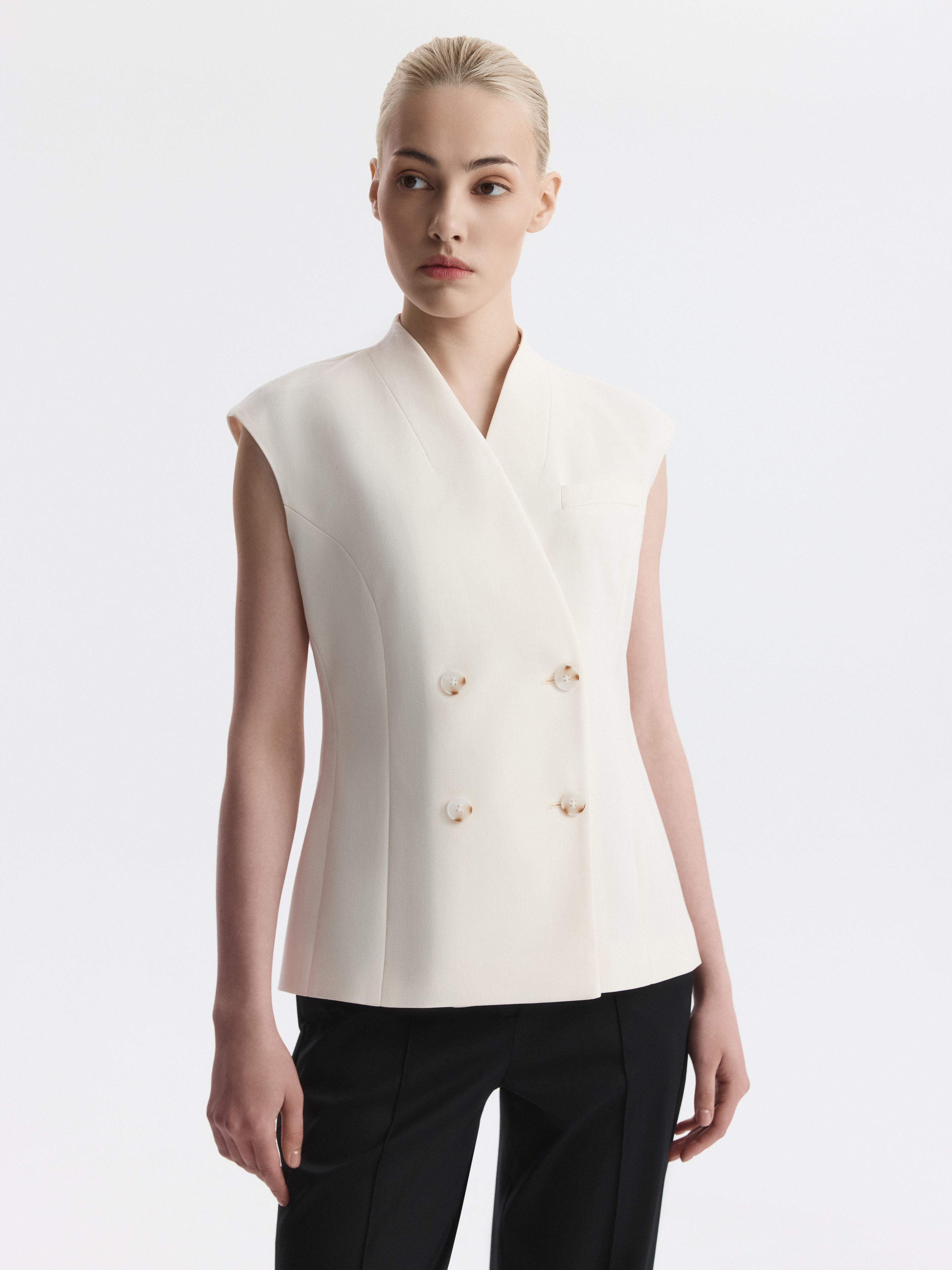 Двубортный жилет создаст современный образ в деловом стиле. Облегченный текстиль «в елочку» не тянется и не мнется, а гладкая подкладка дарит комфортное прилегание. Увеличенная линия плеча и воротник-стойка подчеркивают точность кроя.